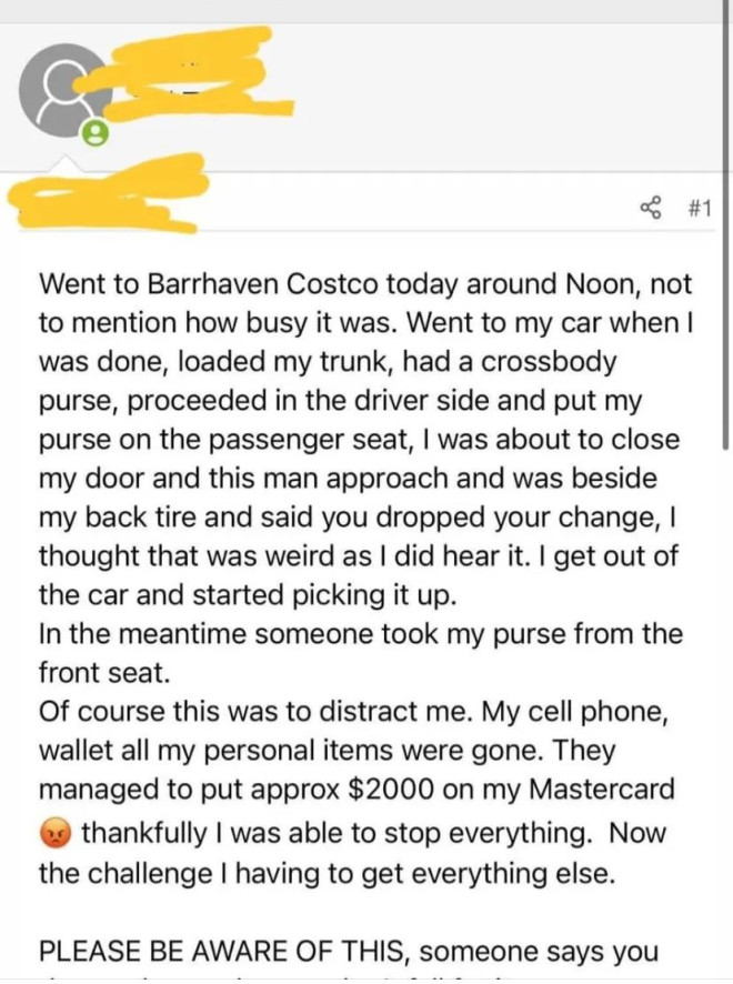 最近渥太华各种犯罪事件真的是多得不太像话,各种抢劫、偷车、电信诈骗等事件频繁出现。 就在最近,又有一件十分令人气愤的抢劫事件发生了,让不少网友看了气不打一处来,只能感叹劫匪太猖狂了! 事情发生在Barrhaven Costco的停车场中,当时超市内外都非常的繁忙,人流量很大。 这名顾客买完东西准备回到车里离开,他当时把东西都放进了后备箱并将自己的斜挎包放到了驾驶坐上。 就在他准备关门的时候,一名男子突然上前来到他后轮胎的后面,并说:“你掉钱了。” 这名顾客没有任何怀疑,从车里出来并没有关门,来到车后方将零钱捡起来。 ![]() 图片来源:Tyler Fleming/CTV News 然而,很快他就发现自己的斜挎包被人偷了,出来捡钱只是调虎离山。 他的手机和各种证件什么的也全都被偷了,并且在很短的时间里他的万事达信用卡就被盗刷了2000加币! 幸运的是他很快就将他的卡都锁了,阻止了进一步的损失。 ![]() 图片来源:Facebook 这则信息被匿名分享到了一个Facebook的小组中,匿名分享者表示这不是第一次发生了,已经有多人被骗。 “这是一个经典的两人合作现金抢劫模式。嗨,这是你的钱吗?然后就会趁你不备抢你的东西,还经常发生在ATM。大家一定要多多注意。” ![]() 图片来源:Facebook 不少网友也对这名成员的经历感到同情,并建议将这一行为举报到Costco,他们可能会有监控帮助抓到劫匪。 ![]() 图片来源:Facebook 还有人表示人们不应该在陌生人就在你身边的时候下车,而且车门不关也不锁。如果同样的事情发生在他身上,他可能不会下车。 ![]() 图片来源:Facebook 渥太华的小伙伴们大家一定要多多注意,尽量不要将自己的财务和贵重物品放在车内,尤其是不锁门就直接下车,不管你离开车的时间多短都一定要锁车! |