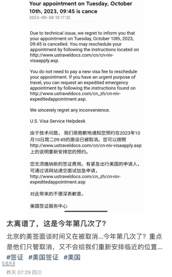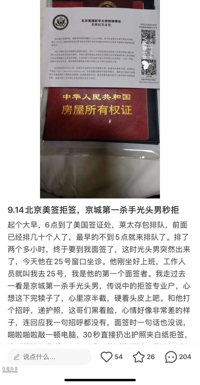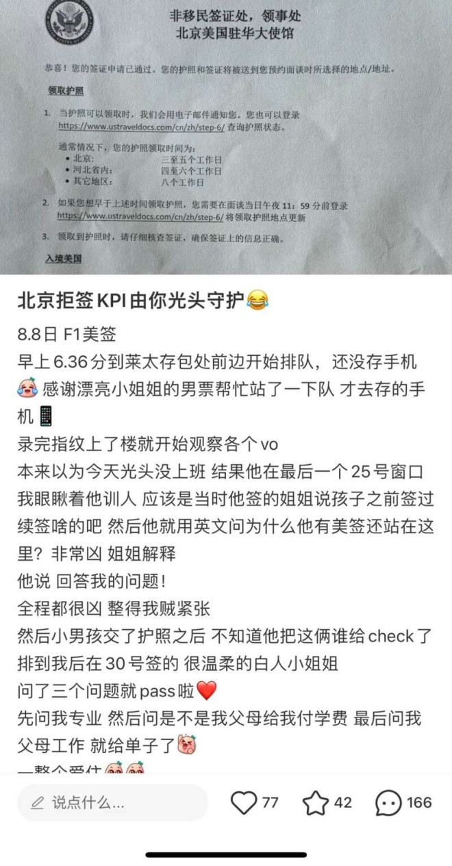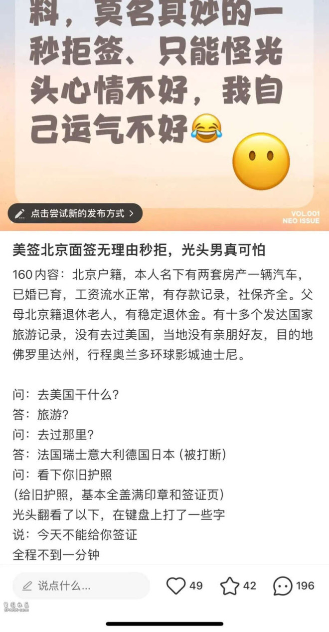 美国签证真的是越来越难了!就在美国驻上海总领事馆宣布近期涌入大量签证申请之际,又传出近期签证面谈大面积取消。据业内人士介绍,目前的常规非移民(专题)签证面谈,已经预约到了明年3月,也就是接近半年的排期。 ![]() 特别提醒,有计划在明年“五一”假期或者国庆长假赴美旅行的,现在要开始考虑申请签证了,以免像今年春季一样,大量的签证积压,不仅导致一些人暑假出行无法,甚至连留学生(专题)也无法在开学前赶到学校。 由于目前留学生已经开学了,因此绝大多数签证都是B1/B2签证,也就是最广泛人群申请的商务/旅游签证,不过签证申请依然火爆,这是美签历史上罕见的情况。 今年5月,美国签证曾经大面积取消面谈,导近致2万份申请受到影响,此后还未消化积压的情况下,又出现申请剧增的情况,因此美签的积压越来越严重。 根据美国国务院的信息显示,目前美国驻华各大总领馆的签证申请都要排期,尤其是广州,居然高达190天的排期,也就是整整6个月的时间。 ![]() 拒签率飙升 网友总结“京城第一杀手” 然而,美签的申请量剧增的同时,拒签率也跟着上升,甚至有网友总结出了“京城第一杀手”光头男的故事。 ![]() ![]() “光头男”喜提“京城第一杀手”的称号,这不是一两个网友吐槽,而在小红书等社交平台上,有大量关于“光头男”的评价,其中一位网友(图左)说:早上5点就来排队,排了两个小时被分配到“光头男”,然而对方一句话都没讲,就是沉闷地敲了30秒电脑,然后扔出一张白纸——拒签。 关键是,该网友还是河北人,提前一天坐高铁来到北京,又住了一晚酒店,第二天一大早去排队,结果连“发挥”的机会都没有就直接被拒签了。 还有一位网友(图右)吐槽道,自己是北京户籍,名下两套房产一辆汽车,已婚已育,有十多个发达国家的旅游记录,就是没去过没过,向去佛罗里达州的环球影城和迪士尼,但仅仅不到一分钟就被“光头男”拒签了。 还有网友说,自己有加拿大(专题)签证、英国、澳大利亚、新西兰、法国、瑞士、日本(专题)、越南都去过,遇到“光头男”照样拒签。 ![]() ![]() 还有网友看到“光头男”在训人,以及留学签证也被“光头男”拒签的。看来,网友给“光头男”取名“京城第一杀手”果然是名不虚传。 原因分析 “大量的人去送钱” 美签从来没有像现在这么火爆,即使是2014年年底刚开放十年签证,也没有如此火爆的场面。据业内人士介绍,出现这种现象的原因是多方面的,其中很重要的一点是——很多人并不满足条件也去申请,结果只能是“白白送钱”。 业内人士介绍,美国签证长期以来都有门槛,普通人难以把握,以前很多都通过旅行社送签,旅行社也不会盲目送签,有些一看条件不合适直接退了。 不过最近几年社交媒体的兴起之后,一些人在网上分享自己的签证心得,使得许多人认为“美签是很容易的”,“自己DIY也可以”,“中介是骗钱的”……甚至一些刚申请下来的白本护照也去办理美国签证,有的大学刚毕业,工资不高也没存款;有的来自于敏感地区,但却自信满满,完全没有顾忌风险……在业内人士看来,这些只是为美领馆增加拒签的KPI而已。 当然,目前拒签率高的原因还和总体的国际关系有关,以及受到“走线”的影响,美领馆在无法分辨是否是真实旅游行程的情况下,以前会在面谈的时候多问几句,现在由于申请量剧增,很多都不问就直接拒签。 由于美领馆不提供拒签调档,因此被拒签以后想要“二签”的话,更加难上加难。 |