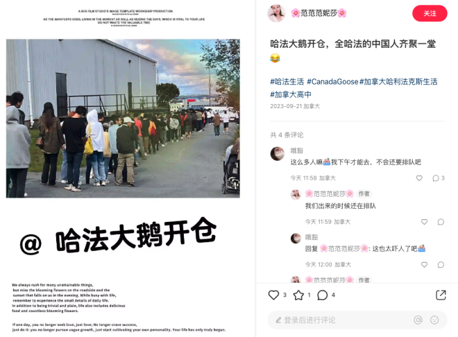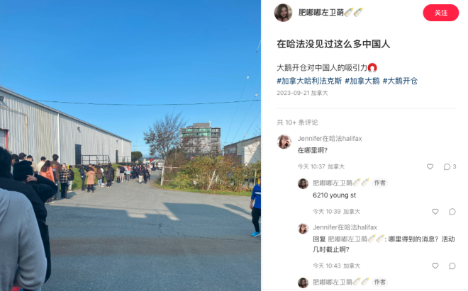 时隔一个月, 8月份多伦多排队的盛况, 多少华人等待数小时, 就为了能进去15分钟抢购。 最后开仓甚至提前结束, 因为全部都卖!光!了! 同样的场景, 在加拿大的哈利法克斯重现! ![]() 图源:小红书@肥嘟嘟左卫萌 小红书网友@肥嘟嘟左卫萌, 晒出了今天一大早排队的场景, 她在帖子中写道: 大鹅开仓对中国人的吸引力, 堪比磁铁。” 从她拍摄的照片来看, 都是华人, ![]() 图源:小红书@肥嘟嘟左卫萌 另一位网友也发帖表示: “哈法大鹅开仓, 全哈法的中国人齐聚一堂。” ![]() 图源:小红书@范范范妮莎 图片上密密麻麻的人, ![]() 图源:小红书@范范范妮莎 评论区不少网友表示, 一大早过来就开始排队了。 “我8:50到的, 前面大概已经有50人了。” ![]() 图源:小红书 有网友的老公在现场, ![]() 图源:小红书 还有网友的朋友, 战果惊人! ![]() 图源:小红书 如果你好奇, 到底为什么这么多人抢? 到底有多便宜?