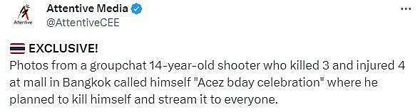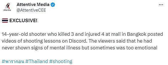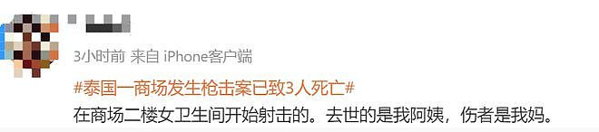 泰国一直是中美游客的热门旅游地,刚刚,当地一家大型购物中心爆发大型枪击案,共造成2死5伤,死伤者中包括中国游客。 警方证实,遇难的中国游客Zhao今年34岁,来自中国北京,当这名青少年用 Glock 19 手枪开枪时,她正在穿过购物中心。有人看到医护人员将她的尸体抬上救护车。 死者家属在微博上发文透露,枪手是从商场二楼卫生间开始射击的,去世的阿姨还有两个双胞胎女儿,刚5岁多 ![]() ![]() ![]() ![]() ![]() 一名泰国网友Po出在现场遇到死者的双胞胎女儿绝望求助(泰文翻译如下): 今天是我这辈子最难过的一天。枪击案发生后,我从暹罗百丽宫逃走,遇到两个中国游客小妹妹来求助,她们的妈妈中枪了,她们找不到妈妈,我想尽一切办法帮忙,用手机剩余1%电量报警帮打听。 妹妹问,我妈妈会死吗?我安慰她说,妈妈只是受伤了,等一下很快就会见到。 等到警察来了,警察说妹妹的妈妈已经去世。我哭出来了,很可怜的小妹妹,她还有个双胞胎姐姐,为什么她们要经历这样的事,那个变态让两姐妹失去了母亲。 ![]() 短短一段话,看得人心碎:有的孩子在杀人,有的孩子没了母亲... 14岁枪手血洗绿旅游胜地 当地时间10月3日下午4点,泰国首都市中心的暹罗百丽宫大楼内,枪手是一名14岁的长发男孩,他戴着眼镜、头上戴着印有美国国旗图案的帽子,身穿黑色马球T恤和短裤,身上有血迹,杀人狂潮开始后不到一个小时后,他被捕了。 ![]() ![]() 少年枪手被捕画面,帽子上印着大大的美国国旗: ![]() ![]() ![]() 有媒体挖出这名枪手曾经参加射击课程的画面,是这名枪手自己主动在网上发布的,当时他戴着同样的帽子: ![]() ![]() ![]() 他还自称计划自杀并将其直播给所有人。 ![]() ![]() ![]() |