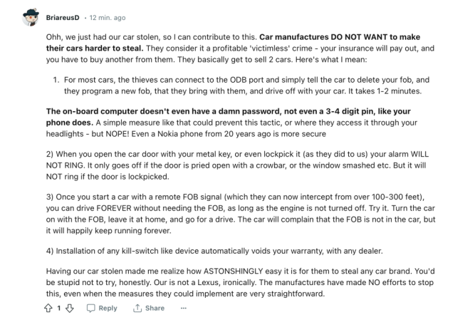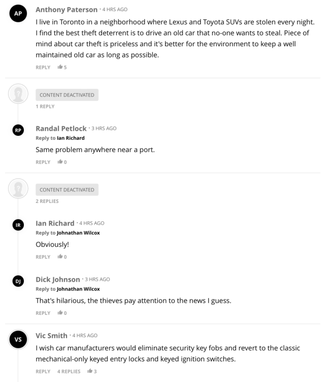 俗话说,“福无双至,祸不单行。”这话放在Mitchell Levine和他的妻子Stacie Korn身上很合适。 安省北约克的这对夫妻和雷克萨斯的恩怨情仇真是一波三折,不到一个月,就两次被加拿大广播公司报道,引发全国网友围观。 自费装防盗,搞坏新车 去年7月,Levine和妻子购买了一辆全新的雷克萨斯RX 350h。由于安省的车辆盗窃十分猖獗,偷车贼又特别偏爱雷克萨斯RX系列的SUV,因此,他们决定自费在汽车系统安装公司(Car Systems Installation)给爱车加装防盗系统。结果悲剧了。 防盗系统装好之后,车子坏了,根本不能启动。 Ken Shaw 丰田经销店判断是防盗装置损坏了电路,由于是第三方服务,不能保修。 好好的新车,成了占据车道的大型车模,这也不是长久之计。所以,在扯皮一阵之后,夫妻两个还是接受经销商的建议,拆除了高科技的防盗系统,改用方向盘锁。 虽然这一番折腾,花掉了$2万元,但好歹车能开了。好景不长,车子被盗奈何天有不测风云。没过几个月,今年10月3日,车子在一家TTC的停车场被盗。 这是9个月内夫妻俩丢的第二辆新雷克萨斯汽车,而且都是在威尔逊地铁站停车场被偷走的。如果算上去年被盗的另一台车,这已经是他们丢的第三辆车了。Levine和Korn郁闷极了——本来装了防盗系统,车行非逼着拆掉,现在车果然丢了,丰田经销商又不管了。 还有TTC也不给力。两辆车都在你家同一个停车场丢的。既然收费停车,为啥没点儿顶用的安保措施?多伦多已经这么不安全了吗?如此抓马,侮辱性极强。多伦多停车管理局发言人Stuart Green立即表示,我们有在努力。 管理局目前使用一家进行例行巡逻的私人保安公司来管理 TTC 的威尔逊车站停车场。TTC 特警也进行巡逻。“我们也正在寻找其他方法来提高安全性和防止盗窃,包括在高使用率的地段安装摄像头。……安全和保障始终是我们的首要任务。” 窃贼喜欢,说明我家车好 相比之下,经销商就淡定多了。 雷克萨斯加拿大公司发言人Philippe Crowe首先送上安慰,“得知Levine的车辆被盗,我们深感遗憾”。接着,Crowe表示,雷克萨斯“定期推出新的或改进的技术功能,以降低车辆被盗的可能性”。无奈“海外市场对这些车辆的更大需求导致有组织犯罪更多地针对这些车辆。” 作为当事方,雷克萨斯态度矜持一点是明智的,以免引火烧身,也自然有别人会来打圆场。加拿大全球汽车制造商总裁兼首席执行官David Adams认为,盗贼对某些车型是相当执着的,相比之下,车辆的防盗措施可能起不到什么作用。 ![]() 雷克萨斯等丰田产品在中东和非洲等市场很有吸引力,因为在那里很容易获得丰田的零部件,而且这些车辆以耐用性著称。 根据调查和分析保险欺诈和犯罪的 Équité Association 的数据,安省的汽车盗窃案一直在稳步上升,雷克萨斯是被盗最多的车辆,RX系列更是窃贼的首选车型。 ![]() Adams直言,“我不认为这真的与技术有关。”道高一尺,魔高一丈,“这就像有志者事竟成。”窃贼有心要偷,防是防不住的。尤其是越来越多的司机依赖无线系统,这使得车辆很容易被盗。 窃贼可以通过使用接收设备拦截前门附近的遥控钥匙与车辆之间的信号。 因此他建议车主将遥控钥匙放在远离车辆前门的地方,或者把遥控器放在法拉第包里,这样可以屏蔽外部接收器的信号。 ![]() 至于Levine和妻子是否会采纳这些建议,我们不得而知。但是他们最起码作出了一个迟到的正确决定——下一辆车不买雷克萨斯了。 有网友支招,别在乎什么面子了,旧车、破车最防盗。 一位多伦多的网友说,自己住处附近每天夜里都有丰田或者雷德萨斯被盗。防盗的最好方法就是开一辆偷车贼都不屑一顾的小破车。想盗贼之所想,你就无敌了。再说物尽其用,尽量延长车辆使用寿命更加环保。 ![]() 也有网友呼吁,用回传统的车钥匙。汽车制造商最起码应该保留插入钥匙发动汽车的功能。还有人表示,自己的车刚刚丢了,也因此才意识到他们窃取任何品牌的汽车是多么容易,简直是不偷白不偷。 虽然丢的不是雷克萨斯,但制造商也没有采取任何措施来阻止这种情况发生,即使他们可以采取的措施非常简单。 其实汽车制造商不想让他们的汽车更难被偷。他们认为这是一种有利可图的“无受害者”犯罪——反正有保险赔付,但你必须从他们那里再买一辆车。里里外外,两辆车的钱就赚到了。 ![]() 听起来也不无道理。Levine和Korn要不是一心想靠科技战胜偷车贼,可能也不至于多花这2万刀。现在一番折腾,车还是丢了,也不知保险赔付能不能把这笔钱也给结了? |