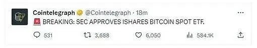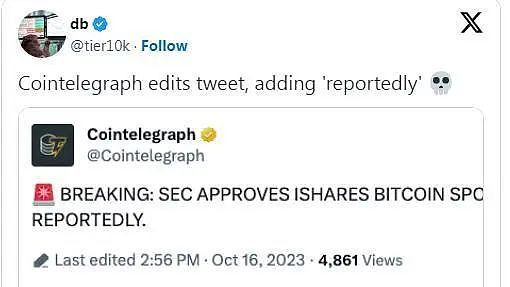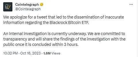 7个英文单词,市场近一亿美元买单!这条假新闻或许会被载入史册。 美东时间10月16日周一美股盘前,加密货币领域知名媒体Cointelelgraph在推特的社交媒体发了一条重磅消息:美国证监会(SEC)批准了全球最大资管机构贝莱德申请上市的现货比特币ETF。 ![]() 虽然消息并未得到确认,但作为加密货币全球市场上最受关注的事项,比特币价格10分钟内大幅震荡,市场上有将近1亿美元为这7个单词的消息买单,其中空单爆仓7200万美元,多单爆仓2600万美元。 不到半小时,比特币从2.8万美元下方迅速蹿升至3万美元上方,两个月来首次突破3万美元关口,较亚市早盘下测2.7万美元的日内低位暴拉超过3000美元,涨超10%。 ![]() 但美股开盘后,美国主流媒体福克斯的记者发帖称,贝莱德确认,Cointelegraph发布的是假消息,他们的申请还在SEC评估中。 ![]() 彭博终端信息随后也表示,贝莱德表示其比特币先说ETF申请仍在接受SEC审查中。 ![]() Cointelegraph也编辑了此前发的帖子,在重磅消息的内容中加上了“据报道”一词。 ![]() 比特币价格迅速跳水,半小时内从3万美元上方一度跌破2.8万美元,跌超2000美元、跌幅超过7%,后虽然重上2.8万美元,但最近24小时内涨幅收窄到5%以内。 ![]() Cointelegraph此后发帖致歉,称其发布的帖子传播了有关贝莱德比特币ETF的不准确信息,并称其目前正在进行内部调查,强调其致力于信息透明度,将在调查完成后三小时内向公众分享调查结果。 ![]() 若SEC果真批准贝莱德的ETF属实,将是在今年8月末美国法院为比特币现货ETF上市扫清一大障碍后的重大突破。 而比特币现货ETF一旦在美国上市,将成为全球区块链领域的一个里程碑事件,因为这意味着美国监管部门从法律上认可了比特币作为金融产品的法律地位,比特币的影响力将空前膨胀。 8月末,美国上诉法院的裁决推翻了SEC阻止Grayscale将全球最大比特币信托基金GBTC转换为比特币ETF的决定。当时有分析指出,这可能为首款现货比特币ETF上市铺平道路,贝莱德和另一华尔街巨头富达的ETF申请最容易被获批,将令更多主流机构接纳加密资产。 比特币现货若获批,可能是加密货币行业的分水岭,因为那将让币圈可能吸引普通投资者几十亿美元的投资。 本周一盘中,GBTC的交易价也大涨,美股盘初,GBTC与比特币的折价一度收窄到约14%,为2021年来最大折价,今年初时还接近50%。今年初以来,GBTC累涨超过160%,表现远优于年内涨逾70%的比特币。 ![]() 上周五,SEC拒绝就8月末的上诉法院裁决提出上诉。此后有媒体指出,最近几周,GBTC与比特币的折价大幅收窄是因为,不少密切追踪GBTC转为比特币现货ETF进展的分析师预计,SEC将很快批准GBTC的转换申请。 有分析师新近发布报告称,鉴于8月末法院的裁决、最近比特币现货ETF的申请数量,以及SEC与申请方的接触,现在这个时候,比特币现货ETF获批似乎是不可避免的。他们还认为,市场处于释放数十亿美元价值的边缘。 |
