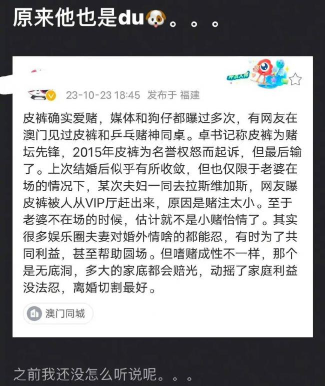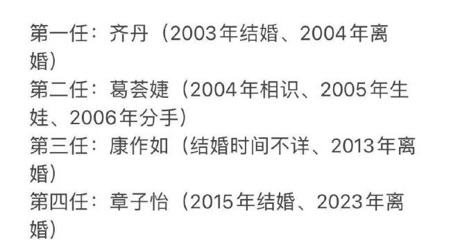 哈喽大家好,一晃又到周三,过了今天就是下半周了,离周末又进一步呀! 那么充满期待的周三早晨,大家就和有料君一起继续看看娱乐圈的新鲜事儿吧~ 不知道大家熟悉不熟悉“汪峰上热搜”这个梗呢? 以往网友们都是调侃汪峰每每在自己出新歌想要上热搜的时候,都会被别人“截胡”,但这次可不一样了,他真真正正的、如愿以偿的上了热搜,还是个“爆”! 不过这次可不是因为他发新歌,而是因为他和章子怡离婚了。 起因是在2023年10月23日上午,有网友爆料汪峰和章子怡已经离婚,女儿归汪峰,儿子归章子怡。 配图很妙,是雷神之锤。好家伙,这是要锤得锤的架势啊! 果不其然,下午15:42.汪峰与章子怡共同发微博公开二人已离婚,结束了这段长达8年的婚姻。同样的时间,同样的文章格式,想必二人早已经提前准备好了。 与有了孩子再离婚的艺人们的声明文字无异,两个人虽然解除了婚姻关系,但还是会以孩子父母的身份共同抚养、陪伴孩子长大。 得知此事的网友们纷纷跑来吃瓜,同时也开始试图从蛛丝马迹中寻找他们婚变的时间线。 ![]() 有细心的网友发现,他们两个人疑似在去年的时候就已经摘下了婚戒。汪峰是从去年11月公开的演出花絮照,图中的他左右手都带了戒指,但并不是婚戒。 ![]() 章子怡则是比汪峰晚一个月,12月在出席第十四届澳门国际电影节的时候,同样也是手上戴了戒指装饰,但并不是与汪峰的婚戒。 而且之前章子怡汪峰在参加综艺《妻子的浪漫旅行》时,章子怡说汪峰曾经给她做过一次鸡蛋炒饭,结果为了显摆颠锅失败,撒得灶台上全是米,最后还得是她收拾的卫生。 别说章子怡了,有料君想到那场面也崩溃了。 他俩离婚这事儿,可是轰动了全网。就连汪峰的前妻葛荟婕都在直播中说:“子怡姐姐终于把眼睛打开了。” 阴阳得一手好汪峰啊! 说起来章子怡和汪峰的恋情,还得追溯回2013年。 那时候,汪峰在自己的上海演唱会上当着数万歌迷的面表白章子怡。他在演唱《我如此爱你》前对着章子怡说:“我想象有一天,我们可以像正常人那样拉着手,在街上购物、散步,沐浴着阳光。” ![]() 而此时章子怡也正坐在台下,镜头扫过她时已是满眼泪花。 结果尴尬的点来了,后来有汪峰歌迷爆料称他之前也是如此表白前任妻子的。 不仅如此,据说《我如此爱你》这首歌还是汪峰当年与前妻热恋时特意为前妻创作的。 但这并没有影响他俩的恋爱,2015年2月7日,汪峰在章子怡36岁生日派对上向她求婚,并于5月10日正式注册结婚。 ![]() 结婚后没过多久,章子怡就在美国顺利产下一女。算下这是汪峰的第三个女儿了:前女友葛荟婕生了一个,前妻康作如生了一个。 要说汪峰和章子怡的婚姻自打他们公开后就备受大家的关注。 其实早在2021年底就有人爆出两人已离婚的消息,不过那时候章子怡马上回应了:“假的!” 仅仅两年时间,爆料就成了现实。这其中究竟发生了什么变故呢? 也有狗仔爆料称章子怡汪峰离婚是因为汪峰赌博成瘾。而这一爆料也并不空穴来风,汪峰的前妻葛荟婕就曾说过汪峰嗜赌成性,甚至严重到在她怀孕的时候带她出去赌博。 ![]() 之前也有网友拍到洗米华走在前面给汪峰引路,可见汪峰这排场也不小了。 另外,也有网友在澳门赌场里见过汪峰和张继科同桌豪赌,要知道张继科也是一个好赌之人,两人一起那势必是“分分钟百万上下”呀! ![]() 在著名赌场拉斯维加斯,汪峰还曾因为赌注太小被人从VIP厅赶出来,也是尴尬至极了。 ![]() ![]() 原先汪峰还因为这事儿起诉过爆料狗仔,但最后败诉了。 这属实是搬石头砸自己脚,求锤得锤,进一步证实了他好赌的真实性。 ![]() 不仅赌博,葛荟婕还爆料汪峰开车骂人+对自己乐队队员态度恶劣,人很“烂”。 并且在她怀孕的时候搞外遇。 回看汪峰的四段感情、三段婚姻,均是以失败告终。 ![]() 他的第一任妻子是主持人齐丹,他们两个人于1998年在一次商演上相遇,并且一见钟情。 当时的齐丹还在四川省做主持人,但为了爱情竟然可以辞去工作跟着汪峰直接来到北京一起北漂,有料君也很佩服齐丹当时的勇气。 ![]() 后来汪峰和齐丹在2003年的时候正式扯了证,但非常遗憾的是这段婚姻维持了都不到一年,两个人就分开了。 与齐丹离婚后没多久,汪峰又认识了比她足足小了16岁的模特葛荟婕。 ![]() 当时也是被狗仔拍到了与嫩模豪车内约会的图片。 要说汪峰最drama的感情经历还得是这一段! ![]() 齐丹与汪峰结婚一年分开没有孩子,而葛荟婕却和汪峰未婚先孕诞下一女“小苹果”,且还是在没有领结婚证的前提下。 葛荟婕也是汪峰的这几任妻子中和他闹得最不愉快的。 当时因为年纪比较小,葛荟婕自曝自己当时没有能力抚养孩子,于是离家出走。 ![]() 后来也是在社交媒体上大骂汪峰是个不折不扣的渣男。 也是因为她的一部分原因,汪峰婚内出轨、好赌成性的形象被公之于众,使他的口碑一落千丈。 ![]() 而后戏剧性的一幕来了,由于葛荟婕比较贪玩,汪峰居然带着小苹果去做了亲子鉴定,在确定是自己的女儿后才给孩子正式取名。 与葛荟婕不欢而散后,汪峰很快又有了新恋情。汪峰依旧找了个比自己小10岁的康作如。 当时的康作如相貌身材都很出众,两人于2010年领证结婚。过了两年汪峰的第二个女儿出生。 ![]() 原本以为汪峰这次可以收心了,然而并没有。 2013年9月13日,汪峰单方面宣布与第二任妻子离婚。随后不久