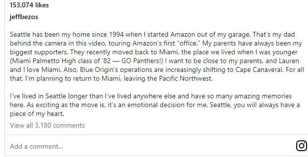 杰夫·贝索斯,Aka亚马逊创始人近日在社交媒体上分享要准备离开西雅图,这个他耕耘了几十年的地方。 昨晚,贝索斯在Instagram上发布了一篇小作文,讲述他一路走来的心路历程,以及准备离开西雅图这个他深爱的地方,前往人生下一段旅途。 其中还包括一段由他父亲拍摄,他来展示亚马逊发源地的小视频,其实是他在华盛顿州西雅图郊区贝尔维尤租来的房子车库里。 1994年正是在那里,一切梦开始的地方。贝索斯于1995 年正式推出了在线书店亚马逊,随后将亚马逊转型为零售和云计算巨头。 “我在西雅图生活的时间比在其他任何地方生活的时间都长,这里有很多美好的回忆,” “尽管这次改变令人兴奋,但对我来说这也是一个伤感的决定。西雅图,你将永远占据我的心。” 贝索斯和亚马逊以及西雅图的成长几乎是紧密关联在一起的。亚马逊的快速增长重塑了西雅图,尤其是该公司总部所在地——南联合湖地区。 它的崛起帮助西雅图变成了科技中心,导致高薪科技工人涌入,带来了经济的繁荣。 ![]() ![]() 图源Instagram,版权归原作者 ![]() 图源Instagram,版权归原作者 ![]() 图源Instagram,版权归原作者 ![]() 图源kiro7,版权归原作者 贝索斯于 2021 年辞去亚马逊首席执行官一职,将帅位移交给安迪·贾西 (Andy Jassy),转任亚马逊董事会执行主席。 辞去亚马逊首席执行官职务后,贝索斯将更多时间花在了个人抱负上,例如地球基金、蓝色起源,以及他于 2013 年收购的《华盛顿邮报》。 而选择离开西雅图的理由,贝索斯也是直言不讳,清晰明了地告诉大家,为了父母,为了爱人,为了新征程。 “我想和我的父母离的近一些,他们都搬去了迈阿密,并且劳伦和我都喜欢迈阿密,”他写道,指的是他的伴侣劳伦·桑切斯。 “此外,(火箭公司)Blue Origin的业务正越来越多地转移到Cape Canaveral,结合种种因素,决定搬去迈阿密了。” 在贝索斯宣布这一消息之前,彭博新闻社上个月就有消息报道称,贝索斯以 7900 万美元的价格购买了南佛罗里达州的一栋豪宅,而后他又以 6800 万美元的价格购买了隔壁的房屋。 为西雅图纳过大大税的大姐夫,希望你在那过的好,有机会常回西雅图看看。 |