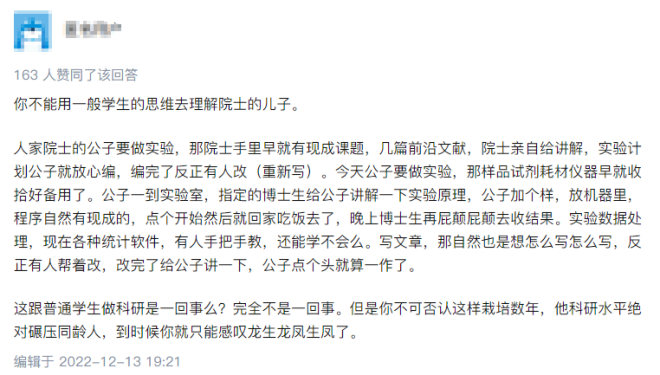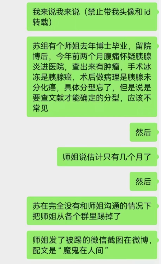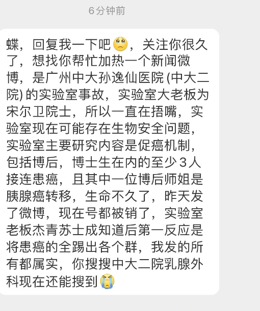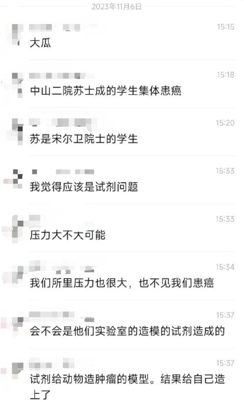 士就被苏士成踢出了各个群,昨天微博也被注销了。可怜本来就没有多久可以活,连发声都不允许。 至少6人,多个博士和博士后,都小于30岁,都在同一个导师的实验室,都是罕见型癌症。 胰腺癌是著名的癌症之王,五年生存率不到5%,晚期确诊等于宣告无法救治。胰腺未分化癌,一般发生在老年,半数在70岁以上。正常情况下不会发生在30岁的年轻人身上,而且绝不可能同时发生在好几位年轻人身上,必定有原因。 同一实验室集体患癌,还都是罕见癌症晚期,还是在专门的肿瘤实验室,极大可能是安全事故;学生成了小白鼠。查询以苏士成为作者的癌症研究文献,大概二十篇,是基于癌症患者和癌细胞组织的研究,其中有强致癌性的造模药。 这个宋尔卫,他的儿子高中就发了3篇SCI,指导老师就是苏士成。然后宋院士的儿子也顺利进入中山医院。苏本来也是宋的学生,明显的学阀操作。 导师压迫学生早就是研究生、博士生屡见不鲜的新闻。即使在这个人人卷王的时代,把生命都赔上绝对是不合理的。 虽然学校有个声明“网传信息不实”。但目前看来,病例报告属实,聊天记录属实,多个信息渠道交叉验证可信度极高。院方也没有明确的调查结果,从之前压热搜和踢人的动作来看,医院和导师方问题很大。 ![]() ![]() ![]() ![]() ![]() ![]() CDT编者按:该肿瘤实验室团队的领导为宋尔卫院士,其在几个月前曾深陷“儿子中学发表 3 篇SCI期刊,现为同单位研究生”的风波。以下是相关文章 最近知乎有个非常热乎的话题“如何看待中山大学孙逸仙医院院长宋尔卫院士儿子中学发表 3 篇SCI,其科研水平如何?”,今天就带大家来看看这个事,我们先了解一下大概的背景。 已下均为宋尔卫院士儿子中学期间参与发表的文章 2017年 中科院一区 单位为广东省实验中学 作者贡献包括:实验设计,数据收集,数据分析,论文撰写和回复。 ![]() ![]() 2017年 中科院3区 单位为广东省实验高中 作者贡献为样本收集。 ![]() 2018年 中科院2区 单位为广东省实验高中 作者贡献无 ![]() 目前,宋同学(宋尔卫儿子)现为中山大学孙逸仙医院2022级研究生。各方网友表示,这种学术“传宗接代”已见怪不怪。 ![]() ![]() 有一些网友也抱有不同的想法,认为大多数抨击其学术不端的人不能用一般学生的视角去看待院士的孩字,那部分人只想发泄情绪,不管真相,他们会说院士培养自己的孩子就是错的,就是不公平,就是学阀。 ![]() 目前只看这三篇SCI就去盖棺定论,这是不够理智的,SCI主要看一作、通讯,共一甚至只看排名第一的。而宋同学都是三作,属于不上不下的尴尬位置。要是真的想要送他文章,按照宋院士的能力,给他几篇一作是轻轻松松的。如果没有其他证据,靠这些说明其学术不端未免有失偏颇。 |