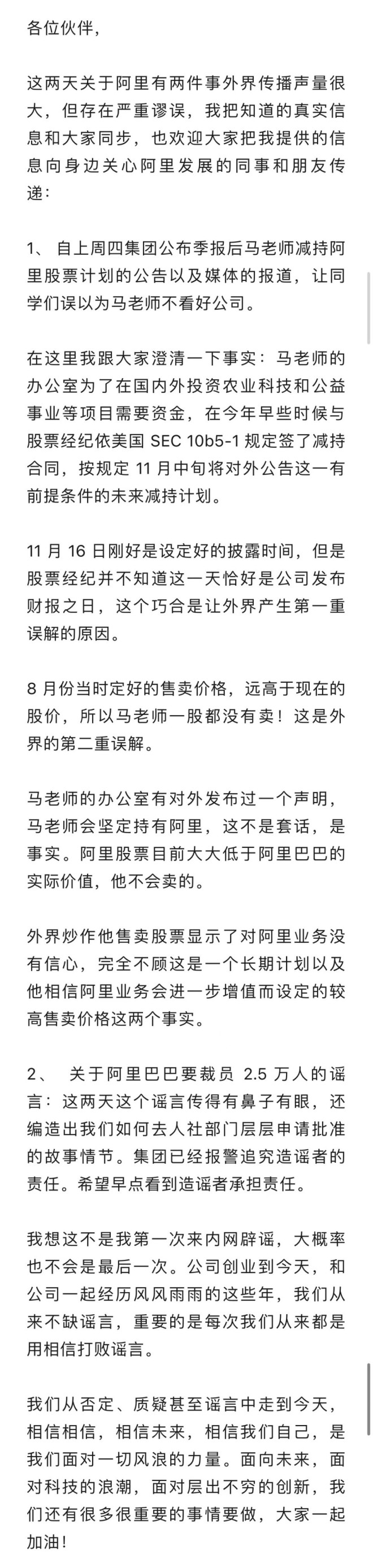 11月22日,阿里巴巴合伙人、首席人才官蒋芳在阿里内网发文,详细阐述了此次马云办公室减持的前因后果。蒋芳称,为了在国内外投资农业科技和公益事业等项目获取资金,马云办公室今年8月就与股票经纪商签了减持合同。 由于当时设定的售卖价格远高于目前股价,只要股价未达到设定售卖价格,就不会售出股票,因此实际上马云所持股票一股未卖。蒋芳还通过内网向阿里员工转达,马云坚定看好阿里,“阿里股票目前大大低于阿里巴巴的实际价值,他不会卖的”。 附蒋芳全文: 各位伙伴, 这两天关于阿里有两件事外界传播声量很大,但存在严重谬误,我把知道的真实信息和大家同步,也欢迎大家把我提供的信息向身边关心阿里发展的同事和朋友传递: 1、自上周四集团公布季报后马老师减持阿里股票计划的公告以及媒体的报道,让同学们误以为马老师不看好公司。 在这里我跟大家澄清一下事实:马老师的办公室为了在国内外投资农业科技和公益事业等项目需要资金,在今年早些时候与股票经纪依美国 SEC 10b5-1 规定签了减持合同,按规定11月中旬将对外公告这一有前提条件的未来减持计划。 11月16日刚好是设定好的披露时间,但是股票经纪并不知道这一天恰好是公司发布财报之日,这个巧合是让外界产生第一重误解的原因。 8月份当时定好的售卖价格,远高于现在的股价,所以马老师一股都没有卖!这是外界的第二重误解。 马老师的办公室有对外发布过一个声明,马老师会坚定持有阿里,这不是套话,是事实。阿里股票目前大大低于阿里巴巴的实际价值,他不会卖的。 外界炒作他售卖股票显示了对阿里业务没有信心,完全不顾这是一个长期计划以及他相信阿里业务会进一步增值而设定的较高售卖价格这两个事实。 2、关于阿里巴巴要裁员 2.5万人的谣言:这两天这个谣言传得有鼻子有眼,还编造出我们如何去人社部门层层申请批准的故事情节。集团已经报警追究造谣者的责任。希望早点看到造谣者承担责任。 我想这不是我第一次来内网辟谣,大概率也不会是最后一次。公司创业到今天,和公司一起经历风风雨雨的这些年,我们从来不缺谣言,重要的是每次我们从来都是用相信打败谣言。 我们从否定、质疑甚至谣言中走到今天,相信相信,相信未来,相信我们自己,是我们面对一切风浪的力量。面向未来,面对科技的浪潮,面对层出不穷的创新,我们还有很多很重要的事情要做,大家一起加油! ![]() |