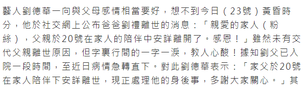 11月23日,刘德华在“华仔天地”网站发布噩耗,透露父亲刘礼去世:“亲爱的家人,父亲于20号在家人的陪伴下安详离开了,感恩!” ![]() 为了悼念父亲,刘德华将网站设置为黑白色,粉丝纷纷安慰华仔节哀。 ![]() 港媒报道指,刘德华父亲已经入院一段时间,近日病情急转直下,华仔对此回应现正处理他的身后事,谢谢大家关心。 刘德华没有透露父亲的年纪,而根据资料显示,刘礼在1934年出生,享年89岁。 ![]() 据了解,刘德华的父亲刘礼年轻时曾做过消防员,后来开了“得胜士多”小吃杂货店养家糊口,与妻子育有六名子女,刘德华排行老四,有三个姐姐,一个妹妹及一个弟弟,刘德华从小听话孝顺,成名后力所能及的照顾父母,因为父亲喜欢吃叉烧,曾豪掷20万买“华东烧腊”作为父亲的生日礼物,后来在加多利山大宅安了家,接父母到宅内与妻女共享天伦之乐。 ![]() 港媒报道指,刘礼曾在2003年不幸患上膀胱癌,后来到公立医院完成膀胱瘤割除手术并康复,抗癌成功至今多享福了二十年,也算是有福之人。 ![]() ![]() ![]() 刘德华当年经历父亲患癌,继而参与拍摄《童梦奇缘》诉说父子情。 ![]() 另外,刘德华的兄弟姐妹的处境各不相同,大姐一直住公屋,三姐早年移民(专题),妹妹是教师,弟弟最受刘德华照顾,资产上千万。 ![]() 有传刘德华与大姐的关系不好,但其实刘德华最初出钱出力帮助家人,可惜大姐沉迷赌博,刘德华无力挽回只能让其自力更生。 ![]() 一直以来,刘德华都非常喜欢带父母参加粉丝见面会,但因为受伤及疫情,已经有5年时间没有再举办成功,上一次举办见面会还是2018年6月,当时刘德华携父母、太太及女儿出席,也是刘礼最后一次公开露面。 ![]() 近年有关刘德华父母的新闻非常少,最近一次是2020年,刘德华父亲在香港(专题)何文田买下一套3300万的豪宅,有传是首次置业,省下近千万的税款。 另外,刘德华女儿2020年12月传出入院检查心脏,当时被医生要求住院,有香港网友在医院看到刘德华的父母现身,陪着孙女做检查。 ![]() 可见,刘礼老爷子的身体近几年应该不错,突然去世令人感叹世事无常,也愿华仔节哀。 |