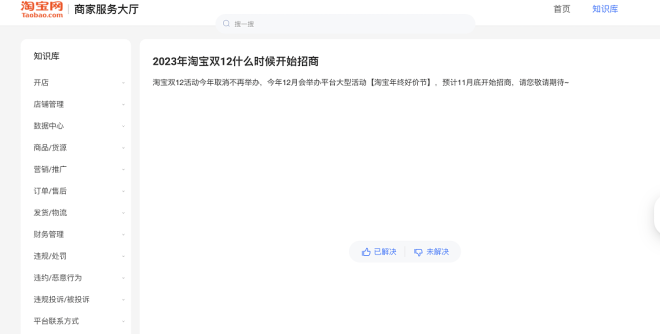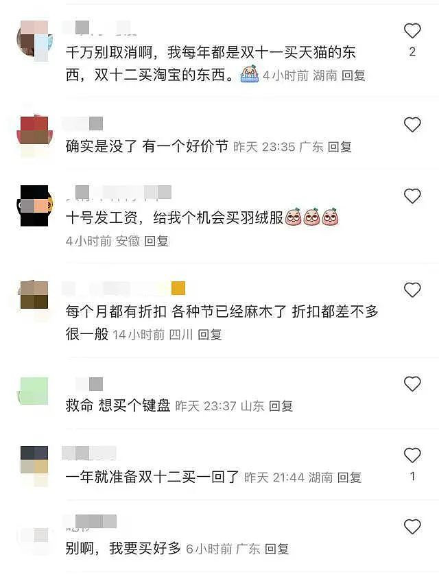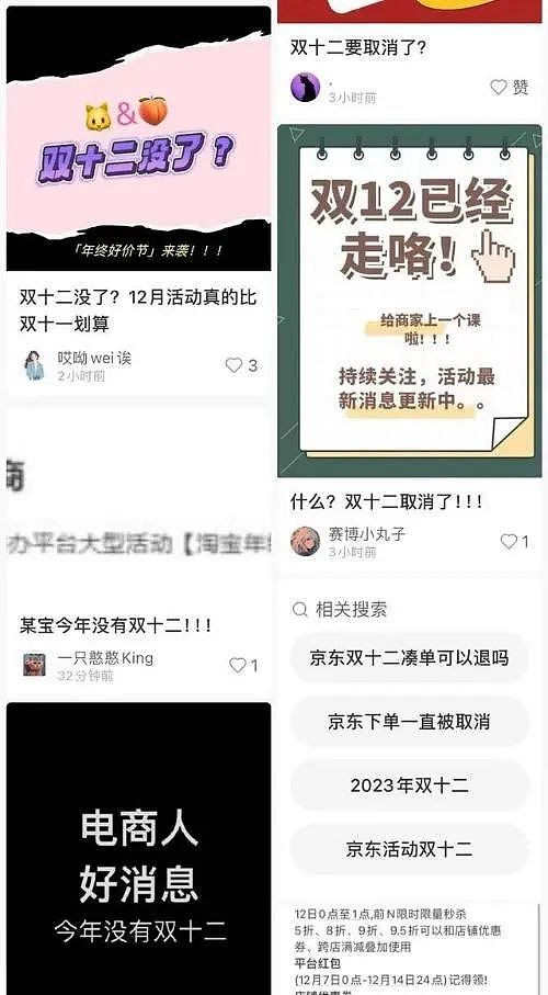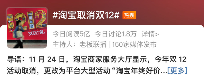 今年双12取消了? 消息一出,迅速引发网友热议! 11月24日下午,话题“淘宝取消双12”冲上了微博热搜第一,至24日晚,阅读量高达5亿! ![]() ![]() 虽然说双12没有双11关注度高,但是到了每年年末商家冲业绩的时候,尤其服饰类的店铺会有清仓“骨折价”,不少人会蹲守。 因此,双11刚刚过去不久,有网友却老早就已经等着双12补货、捡漏。 ![]() 得知淘宝取消双12后 热衷买买买的网友直呼: 不希望取消! ![]() ![]() 淘宝回应:双12取消 将开启“淘宝年终好价节” 淘宝网商家服务大厅显示,今年“双12”活动取消,更改为平台大型活动“淘宝年终好价节”,预计11月底开始招商。 对此,淘宝回应称, 淘宝好价节将于12月9号晚上8点正式开启。相比往年的“双12”,折扣力度、商家规模、商品规模会大幅度提升。淘宝举办年终好价节,是对好价节的延续和加码。