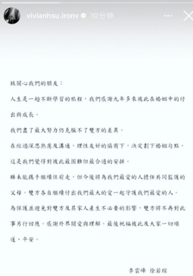 台湾又一女星被曝离婚! 继大S与汪小菲离婚后,48岁徐若瑄也被曝出离婚消息。 台媒称,徐若瑄与李云峰已经在上个月签字离婚,结束了两人维持了9年的婚姻关系。 至于外界关心的原因,他们的答复则比较官方,理由是双方性格不和,再加上长期两地分居,最终导致离异,两人的儿子将继续留在新加坡求学。 稍晚些时候,徐若瑄李云峰双双发文官宣离婚。 从文字中,我们还是能感受到双方对这段感情的遗憾,“我们尽了最大的努力仍克服不了双方的差距”,一句话道出了感情破裂的正因。 这份声明中,还说道,两人是在深思熟虑、理性沟通和协商下,才决定给这段感情画上句号的,并承诺将会继续付出最大的爱,一起守护他们最爱的人。 这里所指最爱的人自然是儿子以及双方的家人。 徐若瑄与李云峰在2014年举行了婚礼,婚后徐若瑄艰难产下一子,当时为了保住腹中胎儿,徐若瑄被扎了300多针保胎,每天吃十几粒保胎药,更是一连卧床142天,每天的吃喝拉撒都在床上进行,甚至连洗头发都不能起身。 ![]() ![]() 而李云峰曾在婚后被曝出遭遇财务危机,彼时有消息称徐若瑄急于复出挣钱,替夫还债,但事后男方已顺利度过危机。 ![]() 可没想到,双方虽度过了财务难关,却仍旧未能拥有一个圆满的结局。 ![]() ![]() ![]() 李云峰是位身家不菲的豪门子弟,他是新加坡马可波罗海业集团主席,集团市值高达6个亿,比徐若瑄小3岁的他,出生在印尼,早年在澳洲求学。 ![]() 在台媒正式曝出两人离婚消息前,徐若瑄疑似在社交账号公布了自己落寞的心情,她独自一人走在商场内,并配文:“I’m not Happy now”。本意是我现在不快乐,再配合那张孤独的背影照,离婚一事似乎早有预兆。 说来徐若瑄的感情经历是相当丰富的。 2021年王力宏被曝出婚内出轨时,她被卷入其中。当时王力宏前妻李靓蕾石锤了王力宏对婚姻不忠,男方出轨的名单中也有徐若瑄的名字,近一个月的时间里,双方都未能洗脱嫌疑。 而在婚前,徐若瑄的男友名单则更长。 ![]() 刚出道时,她与“小虎队”成员吴奇隆擦出火花,两人当时都是青涩的新人,俊男靓女也很般配。 ![]() 在跟吴奇隆分手之后,多年时间里,徐若瑄又传出过多个绯闻对象,周杰伦、吴建豪、冯德伦、陈小春、甚至是其经纪人等,都曾是她的绯闻男友。 徐若瑄的情史可谓是相当丰富的,直到2014年遇到李云峰,双方才有了步入婚姻的想法。 徐若瑄称第一次见李云峰时是在一次聚会上,彼时是男方过生日,可中途李云峰接到女儿发烧的电话,便和大家说明情况后,立刻返回家照顾女儿。 ![]() 这样的行为,让从小缺乏安全的徐若瑄倍感踏实,也让她有了归属感,两人在恋爱两个多月后,宣布婚讯。 如今,这段维系了9年的婚姻,最终还是走向了终点,但愿双方都能如官宣时所说,依旧彼此守护家人,共同抚养孩子,以家人、友人的方式继续尽好各自的职责。 所谓一别两宽、各生欢喜吧。 |