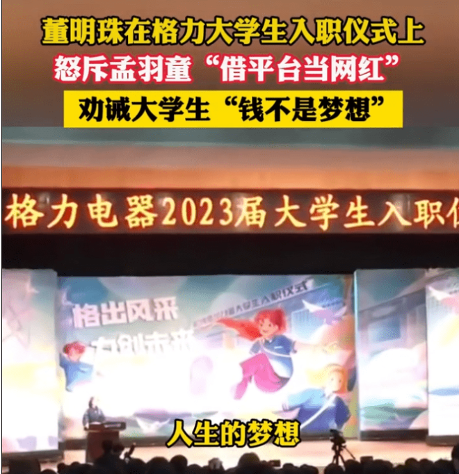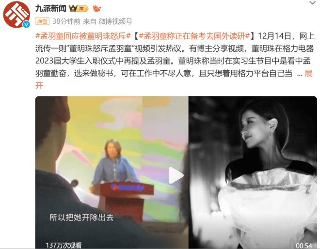 12月14日,网上流传一则“董明珠怒斥孟羽童”视频引发热议。 15日,孟羽童对九派新闻记者表示:自己正在备考中,不太方便出来回应一些事情。据孟羽童此前发布内容显示,她正在申请去外国读研究生。 ![]() 随后,“孟羽童回应被董明珠怒斥”的话题登上热搜第一。此外,“孟羽童面试时曾称月薪超4500就满足”的话题也登上热搜。 此前,在综艺《初入职场的我们》中,孟羽童首次面试格力时选择了转正期望月薪四千元的座位,她解释称此前在互联网的日薪是150元,只要比之前高就满足了。董明珠也曾称赞她有正确的价值观,曾拒绝两年内加薪。 董明珠批孟羽童:只想用格力平台做网红,不能容忍 据界面新闻,近日网路流传的视频中,董明珠在格力电器2023届大学生入职仪式中发言,以孟羽童为负面案例,批评其做不好秘书本职工作,而只是“借助我们平台变成一个网红,不能容忍这样的人在格力,所以把她开除了”。 ![]() 目前,原博主已将视频删除,不过通过被保留的视频可看到,董明珠首先批评道,自己在参与综艺节目的9位实习生中仅看中她一人,并推荐她毕业后直接入职格力电器。 她强调,格力一年入职数千名大学生,但没有一人有这样的机会。备受重视之下,孟羽童在当秘书期间却“连个文都写不出来,我不知道是什么秘书。” 董明珠表示,孟羽童凭借格力平台成为网红,吸引众多粉丝,在公司起到了不好的作用。“那有什么用?你不过是今天挣的钱多一点而已,我觉得这形同行尸走肉,有钱又怎么样?钱是一定要有,但不是我们梦想中的追求,而是我们奋斗的结果。”她说,钱不是人生梦想,受到人们的尊重才是。 据了解,出生于1999年的孟羽童今年24岁,在2021年参与综艺节目《初入职场的我们》时获得董明珠赏识,当年9月正式入职格力电器。2023年5月,格力电器确认了孟羽童离职的消息。孟羽童总计在格力电器工作时间不足两年。 据界面新闻,根据她在社交平台发布的视频,她的秘书工作大致分为五个部分:行政,政府接待,媒体活动,电商与市场部的对接,出差。工资方面,她在视频中透露,“其实我的工资是和格力应届大学生的水平是一样的,基本上在五千到一万块钱这个区间内。” 孟羽童离职的消息在当时也数次登上热搜。这主要是因为董明珠曾公开表达要将其培养成“第二个董明珠”,还将两人的合影作为格力电器直播带货账号的头像,账号被命名为“明珠羽童精选”。 而据孟羽童自己所言,她对市场营销更感兴趣。 董明珠:网红不网红看人品质!孟羽童清华演讲:准备好重生(电视剧) 5月11日,孟羽童曾在社交媒体上发布一则视频确认自己已经从格力电器离职,未来将会继续读书,申请研究生。 当时的一种传言是,孟在格力电器工作期间多次缺勤,以自媒体博主身份参与其他工作,这导致了格力将其开除。这一说法在董明珠此次发言里得到了确认。 而在此前,11月6日,董明珠在接受《财经郎眼》采访时回应称“网红不网红看人品质,人在格力去外面做广告是不合规的”。在节目中,董明珠也回应了有关接班人的讨论。 她在采访中坦言,“接班人我是可以选,但能不能做好是他的职责,不是我(的职责),如果我能替代他的话,那还要选什么选?都是台下的人看台上跳舞的。”她还提到,“人才培养是一个笑话,其实是我看中了这个人到底是不是人才,由他自己行为来做决定。选错人了才是最大的问题。 在12月3日,董明珠前秘书孟羽童在个人社交媒体账号上发布自己在清华大学演讲的视频。 视频配文中孟羽童提到:“渴望风浪,也准备好重生。” ![]() |