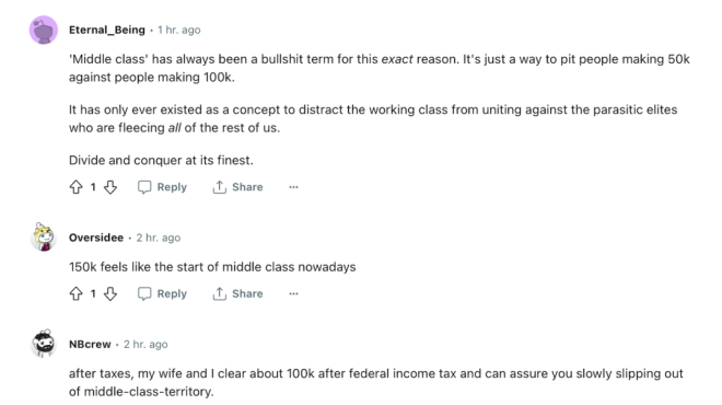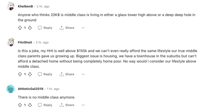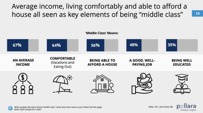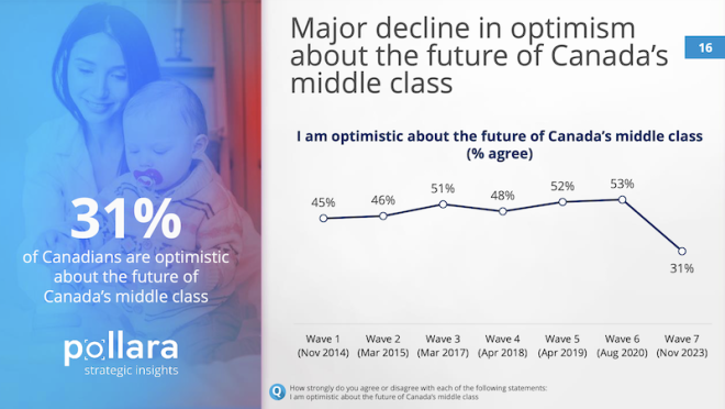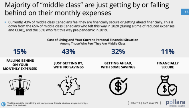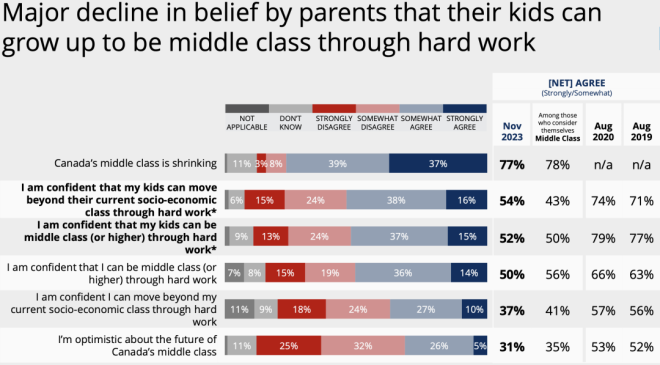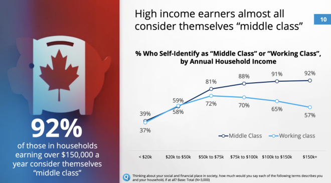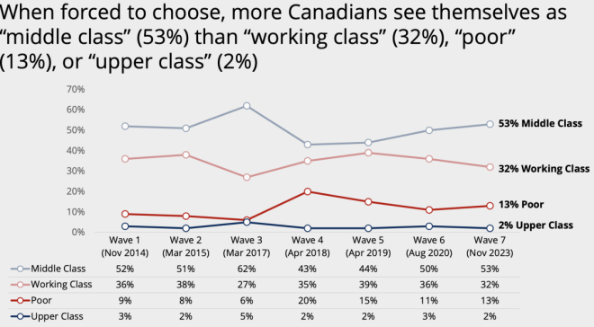 长期以来,“中产阶级”都被认为是稳定社会的中坚力量。不过,加拿大统计局对中产阶级并没有明确的定义。因为缺乏一个明确的收入标准来进行界定,中产阶级这个标签更多地是一种心态,是人们对自身财务状态和生活方式的自我判断。 自2014年以来,民调公司Pollara开始研究加拿大人的中产阶级身份认同,最新的第七波年度调查报告刚刚出炉。 报告发现,由于受到不断上涨的生活成本的挤压,加拿大人对中产阶级未来的乐观情绪正处于历史最低点。而且,大多数人认为,年收入$15至20万是中产阶级的门槛。 家庭年收入15万是什么概念?按照加拿大统计局2021年的统计数据,温哥华市2020年的家庭年收入中位数为8.2万元。 按照这个最新的中产标准,温哥华只有22%的家庭称得上是中产家庭。 ![]() ![]() 2万起步,拼的是心态? Pollara的民意调查显示,自认为是中产阶级的加拿大人的比例近年来保持稳定。 ![]() 有多少收入才可以成为中产阶级?对于这个问题,加拿大人的回答弹性极大——年收入从$2万到15万不等。 2023年,78%的加拿大人认为自己是中产阶级。这一比例在AB省最高,为82%,BC省和大西洋省紧随其后,均为80%。 ![]() 家庭收入越高,认为自己是中产阶级的人占比也越高。 收入在$2万至5万之间的受访者中,59%的人称自己为“中产阶级”。 在收入超过$15万的受访者中,则有92%的人被贴上了“中产阶级”的标签。 作为参考,2021年加拿大人税后收入中位数为$68400。对于一个四口之家,加拿大的贫困线设定为年收入$48583。 ![]() 由此可见,不管你的收入是加拿大中位数收入的两倍多,还是不足贫困线标准的一半,都可以自我定位为中产阶级! 实际上,在年收入不足$2万的加拿大人中,也有39%认为自己是中产阶级。 ![]() 所以说,所谓中产,拼的就是心态。调查显示,大多数受访者认为,收入中等、生活舒适(比如能负担得起外出就餐和度假)、买得起房子是衡量“中产阶级”生活的关键标准。 ![]() 然而,心态再好,也怕饿肚子。大多数自定义为中产阶级的人,日子都过得紧巴巴——43%勉强可以做到收支平衡,还有15%每个月入不敷出。 ![]() 当必须要对阶层做一个自我定义时,更多人回归了现实:53%的人认为自己是中产阶级,32%的人自称工人阶级,13%的人认为自己是穷人,2%的人自定义为上层阶级。 ![]() 整体而言,年收入$15万至20万之间的,算是迈进了中产阶级的门槛。 渐行渐远的中产梦 调查发现,即使加拿大人有执着的中产情结,并且对中产阶级的定义极为宽泛,但在停滞不前的工资和不断上涨的生活成本挤压下,加拿大人,特别是工薪阶层对于对中产阶级未来的乐观情绪下降到了历史最低点。 ![]() 自2014年以来,加拿大人现在对加拿大中产阶级的未来的乐观程度低于9年来追踪的任何时候。——只有不到三分之一 (31%) 的人对加拿大中产阶级的未来持乐观态度,比2020年下降了20多个百分点。 加拿大父母对孩子的未来也越来越悲观,因为只有一半(52%)人相信他们的孩子可以通过努力工作成为中产阶级(或更高)。而这一比例在2020年为78%。 ![]() 77%的人认为加拿大的中产阶级正在萎缩。50岁以下的加拿大人中,自认为属于工人阶级的比例比50岁以上年龄组更高。 这一切都与加拿大人对个人财务状况的挫折感有关。Pollara今年11月份的一项研究显示,这种挫折感已经沸腾到了新的高度。 Pollara的首席策略官Dan Arnold表示,“我确实认为,随着经济挫折感的增加,中产阶级的乐观情绪也相应地减弱了。……现在和以前不一样了,理想的舒适生活方式似乎难以实现。”相比于调查中勉力维持的中产光环,网友们的评论接地气多了。 大家纷纷表示,年收入$2万的中产阶级是逗我玩儿呢吧。年薪7万5能不能够上中产还是个问题。10万起步差不多,还得是个人收入。 ![]() 有网友现身说法,“我跟老婆一年挣12万,中产的边都还没挨上。每个月的收入也只是将将够开支而已。”“2013年我打第一份工的时候,8个人挤一套联排别墅,每个月房租是$800现金。那时候我挣的就比$2万多多了,但那日子完全和舒适不沾边。”“我和老婆税后10万。可以肯定的是,我们正在慢慢从中产阶级中掉队。” ![]() “我年薪15万,但是生活水平还比不上小时候我的中产阶级父母提供的条件。”还有网友表示,中产阶级是客观而非主观的。看的就是收入,不应该由一个人能负担得起的生活方式来定义。否则,随着时间的推移,中产阶级能负担的东西只会越来越少。 的确,庞大的中产阶级曾经是加拿大梦的金字招牌。但曾几何时,中产生活悄悄缩水了——表面上收入高了,能负担的生活水准却下降了。 信息来源:Toronto Star,Pollara |