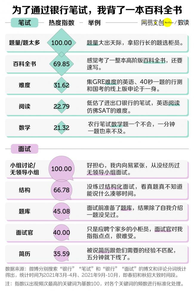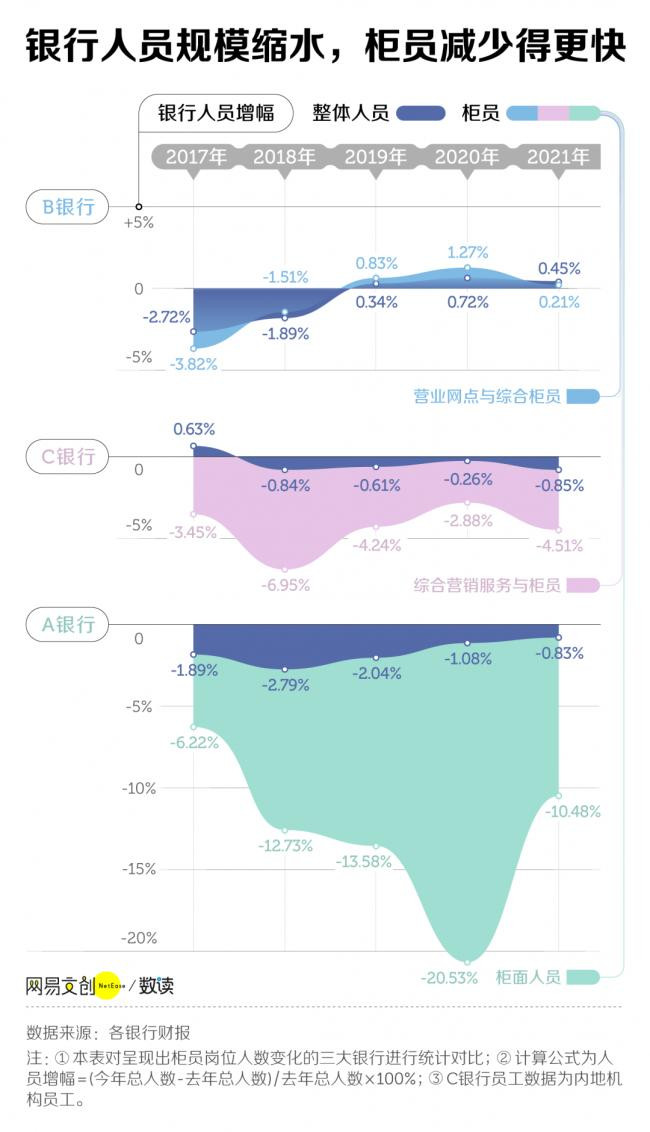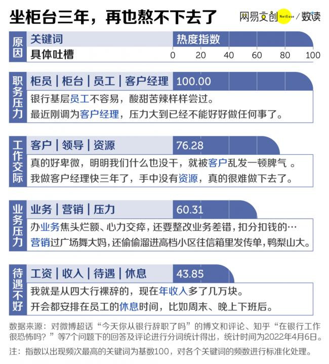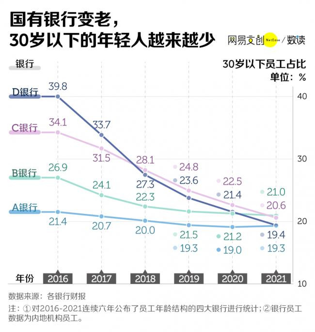银行业,一度是长辈口中的就业神话:工作体面、业务稳定、事少钱多。但近几年,想进银行工作的年轻人却屡屡被劝退。 有 9.1 万银行工作者,在微博超话“今天你从银行辞职了吗”现身说法。他们戏称彼此为“狱友”,曾经挤破了头也要进,如今却想着逃离。 让人艳羡的“金饭碗”银行业,到底还香吗? 01 水涨船高,进银行有多卷 2024 年,应届毕业生人数毫无意外再创新高。教育部预计,2024 年度高校毕业生人数将达到 1179 万人,比上年增长 21 万。 每一年都被称为“史上最难毕业季”,而竞争最激烈的,莫过于财经类专业。从《中国教育统计年鉴》公布的数据来看,2018 - 2020 年,财经类毕业生都维持在百万以上。 财经类专业不仅人多,学霸也扎堆。高考报志愿,有“钱途”的财经类专业是当之无愧的“顶流”,吸引了最多的高考状元,竞争赛道格外拥挤。 财经类专业每年为金融圈输送百万人才,但根据新财富的测算,银行、证券、基金业作为金融圈就业三大行业,平均每年的就业增量还不到 15 万。 银行业作为金融圈的“中流砥柱”,岗位同样狼多肉少。 根据智联招聘统计的招聘需求规模,2020 年 1 月 1 日至 2021 年 3 月 5 日的统计周期内,银行招聘需求占比仅为 18.1%,要远低于保险业、基金/证券/期货/投资行业。 ![]() 银行到底有多“卷”?以建设银行为例,2018 年校招,16.9 万人竞争 1.3 万个岗位,报录比高达 13:1。 报考人数众多,竞争对手能力强劲,进银行的门槛也水涨船高。“双非”学生想听大银行的宣讲会,甚至需要打车去十几公里外的名牌大学旁听。而在一些总行,招聘名单里也是清一色的名校学子和海归硕士。 激烈的竞争下,许多人还没到笔试、面试,就先在网申阶段被刷。 简历通过后,笔试和面试才是难关。我们统计了微博上关于银行笔试相关的发帖,大家倒苦水最多的,是题量太大。 笔试动辄两三小时起步,仿佛是站柜台憋尿的实战演练。时间虽长,但依然不够用。比如 2021 年某大行秋招的金融综合类考试,要求考生在 180 分钟内完成 297 道题目,相当于平均每题只有 36 秒的时间作答 。 ![]() 数年寒窗苦读、修炼专业知识只是敲门砖。如今的银行考试,更重视考察综合素质了。 不少金融学子吐槽银行笔试考题范围网罗了天体物理、高等数学、世界历史等各个学科,感觉像考了一本百科全书。想要拿高分,“上知天文下通地理”都未必够用,难怪有考生哭诉:“感觉招的是中科院储备院士。” 不过,真正的难题还在后面。有些银行笔试并不难过,最卡人的其实是面试。 很多银行人都曾经历过无领导小组或者半结构化面试的折磨。前者堪称“社恐地狱”;后者虽然一般有固定流程、专有题库,却也防不住考官出奇招——挑刺施加压力、提问剑走偏锋。 如果是经济发达地区的一些银行,或是总行,进银行的难度只会增不会减。 02 银行,真的变老了 各路人才费尽了心思挤进重重关卡,但是银行并没有留住年轻人,反而变得越来越老了。 国有六大行中,有 4 所银行在年报中连续 6 年公布了员工年龄结构。无一例外,30 岁以下的年轻人占比都快速下降,如今仅占全体员工的五分之一左右。其中老龄化最严重的一所银行,40 岁以上员工的占比已经将近六成。 国有银行逐渐老化,商业银行也不例外,甚至有些分行新员工离职率达到了 50%。某股份制银行的支行副行长在接受采访时表示,留住行里的年轻人,已经成为她最头疼的工作之一。 ![]() 年轻人占比下降,并非是招聘变少了,相反,2021 年,尽管受疫情的影响,银行仍在加大对人才的争抢力度。尤其是国有银行,逆势扩招,招聘岗位数量纷纷过万。 明明每年都有大量的新鲜血液涌入银行,但银行整体的年龄结构依旧在老化。这中间的落差,指向一个明显的答案:年轻人,正在从银行出走。 智联招聘 2021 年的统计也显示,银行业整体的粘性并不高。来自不同专业背景的银行人,工作五年内选择留下的比例均不超过 70% 。 另一方面,近年来,银行确实在经历着前所未有的减员浪潮。国有六大行公布的年报数据表明,2016 - 2021 年,六大行员工总数减少了 8.3 万人。 在 2021 年,国有六大行中,仅有一家银行增加了 1581 名员工,其余五大行集体减员,总计流失员工将近 1.18 万名。 国有银行的整体减员,主要是前台柜员等基础岗位数量缩水。甚至有的银行,柜员流失幅度一度超过了 20%,远高于整体的员工流失幅度。 ![]() 其实,“逐张清点”的银行柜员,早在几年前就开始步入危机。随着智能柜台的推广,银行业务的离柜率逐渐走高。到了 2021 年,银行业平均电子渠道分流率已经高达 90.29% 。 同时,银行线下网点不断减少,2021 年,国有六大行减少的线下网点数量多达 574个。哪怕是部分仍在扩展的股份制银行和商业银行,网点增量也非常有限。 而从各大行的年报中可以看出,柜员大撤退的同时,营销人员的数量却不减反增。 机器和手机接手了部分基础业务后,营销就成了银行工作人员的重心。包括柜员在内的一些非营销人员也背上了各种任务,打电话推销、街头办卡,成了人手必备的技能。银行人纷纷转型成了“销售”。 03 数钱的工作,没那么香 不论是主动离职,还是被动出走,从结果来看,银行都不再那么受年轻人青睐了。数钱的工作,其实没那么香。 银行业经历过辉煌的“黄金十年”。根据银监保会的统计数据,2003 - 2013年,银行业境内金融机构总资产实