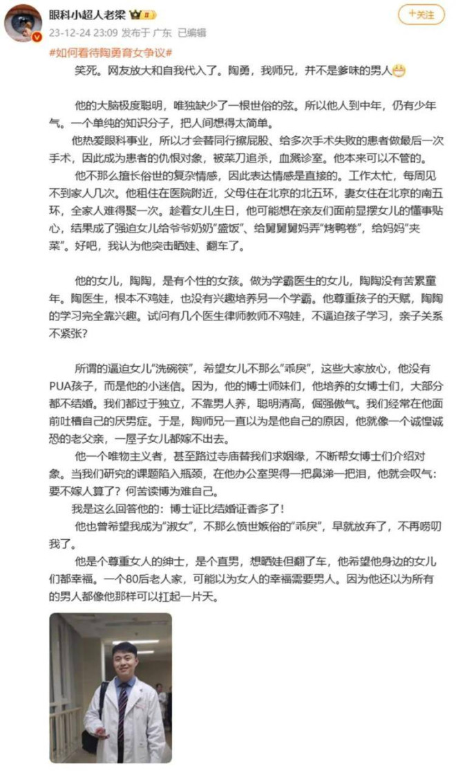 12月23日,3年前曾遭患者持刀暴力伤害的北京眼科医生陶勇发长文为女儿庆生,提到让女儿洗碗一事,不料引发争议。相关话题冲上热搜。 12月23日,是陶医生的女儿陶陶12周岁的生日。这天,陶医生让女儿给老人盛饭、给舅舅舅妈弄烤鸭卷,给妈妈夹菜,女儿都乖乖照办了……但最后在洗碗这件事情上,遭遇了全家的阻拦,陶医生晓之以情、动之以理,最后在他的坚持下,终于把陶陶从房间里请出,洗净碗筷。 陶医生认为,12岁的女儿可以在和网友打游戏时开心得嘴角咧到耳朵根,却不愿意在拍照的时候配合自己笑一笑。12岁的女儿正处于“魔女”和“淑女”的分岔路口,自己一点不敢懈怠。 ![]() 这篇博文,引起了网友热烈的讨论,话题主要聚焦在: 女孩就一定要成为“淑女”吗?生日这天为什么不让孩子开开心心的? ![]() ![]() 还有一部分网友认为:在家做家务很正常,没有必要这样上纲上线。 ![]() ![]() ![]() 不少网友的评论下面,还有大量的跟帖回复、讨论。还有的网友比较偏激,把话题带偏。 12月24日深夜,拥有超330万粉丝的医生大V“眼科小超人老梁”发长文力挺陶勇,称他是自己的师兄,并不是爹味的男人。她提到:陶医生的工作很忙,每周见不到家人几次,可能是想在亲友面前显摆女儿的懂事贴心,结果成为了“强迫”。 ![]() 12月25日,删除引发争议的长文后,陶勇医生更新账号,晒出收到礼物的照片,未提及网上争议。 ![]() 陶勇,男,1980年5月出生,江西省抚州市南城县人,毕业于北京大学医学部,医学博士,博士生导师、教授,首都医科大学附属北京朝阳医院眼科主任医师。2020年1月20日,因为一场令人愤怒的暴力伤医事件,陶勇医生被大家所大众熟知。在经过痛苦的治疗、康复后,陶勇恢复出诊,2020年8月,他获得第十二届“中国医师奖”。 ![]() 在受伤复出后,他依旧向外界传达着明亮和善意,因此在网络上具有很高的口碑的及关注度。 |