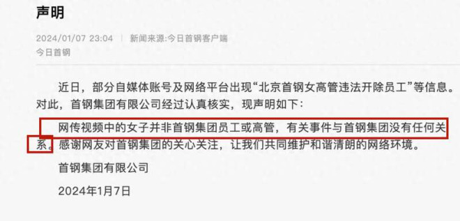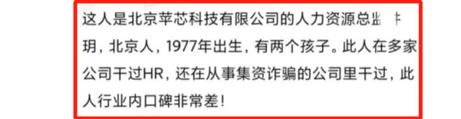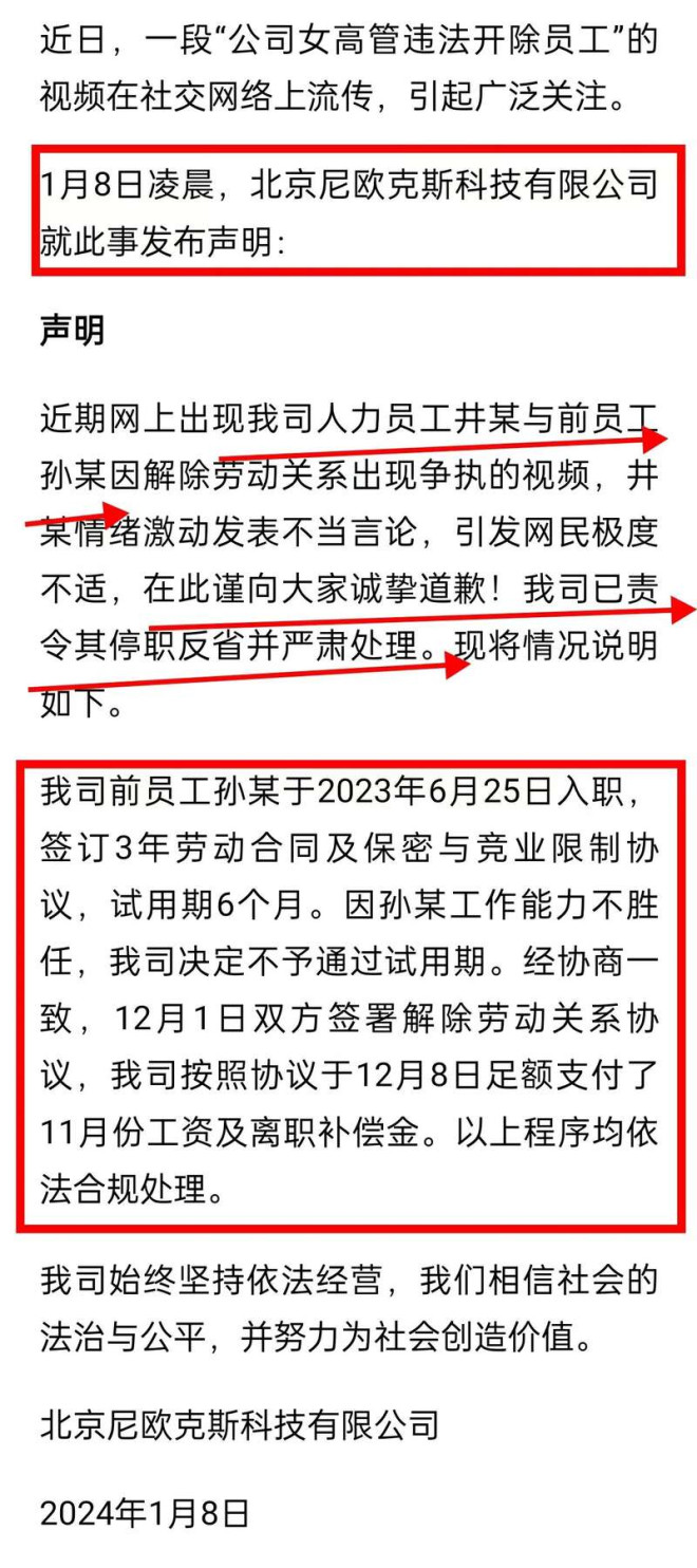 1月7号,一名北京女高管引发千万网友众怒,她竟然对着刚被解雇的孙某叫嚣道:“我就是违法解雇你怎么了,你去告诉我呀,你跟我在这儿犟,我让你两年半找不到工作!” 嚣张,太嚣张! 不知道怎么的,此女子被传是首钢的高管,网友们纷纷冲到首钢的账号下进行评论,吓的账号立马关闭了评论权限。 这下网友们更认准了,该高管就是首钢的人,不然关啥评论? 一时间,首钢被推到了风口浪尖上,作为国企,若是高管如此对待员工,那绝对是自寻死路,周一开盘,股票分分钟就会跌停,损失巨大。 为此,首钢连夜在周日也就是7号晚上11点,发布公告,否认该女子是首钢员工。 ![]() ![]() 紧接着,1月8号零点刚过,该女子真正所在的公司——北京尼欧克斯科技有限公司也发了声明。 公司表示,孙某是2023年6月25号入职的该公司,签订的三年劳动合同,试用期6个月,12月1号,公司以孙某不能胜任工作为由,开除了孙某,并足额支付了孙某的工资和离职补偿金。 至于高管女子井某已经被勒令停职反省。 ![]() 没想到,这份声明不仅没平息网友的怒火,反而让公司陷入了更深的泥潭。 首先,公司开除孙某的时间太玄妙,员工能否胜任工作,一周就能看出来,就算工作内容繁琐,两个月也足够评估他是否能胜任工作了。 然而,孙某工作了5个多月,在第6个月时,将他解雇,白嫖的太明显了吧。 ![]() ![]() 其次,公司说和孙某是协商一致后解除的劳动合同,可视频里,高管井某可是口口声声承认她是违法开除的孙某啊。 我们再来回顾一下视频内容。 孙某找井某要说法,拿出手机对着她拍摄时,井某威胁孙某若是敢把视频传上网,就报警。 这也意味着,井某知道她的行为不光彩。 孙某质疑井某没有法律意识,没想到,井某直接开怼:“我就是没有法律意识,我就是违法了、就是这个素质,怎么着?” 紧接着,井某又大声叫嚣道:“我现在就是违法解除合同,你立马给我收拾东西走,咱慢慢打官司,我有的是人,我下个月有工资吃饭,我让你两年半都找不到工作。” ![]() 有经验的打工人表示井某不是不懂法,她太懂劳动仲裁了,钱公司肯定会给员工,可耗费的时间,是员工耽误不起的。 ![]() 这也就是为什么,很多打工人被裁时,宁愿吃了这个亏也不愿意去跟公司打官司,耗不起。 这一次,井某没想到,孙某不走劳动仲裁,他走“网络仲裁”,井某那副压榨员工的嘴脸瞬间火了。 紧接着,网友们扒出了井某的信息。 她叫井玥,北京人,46岁,有两个孩子,从事人力资源行业多年,曾在多家公司任职,业内口碑极差。 ![]() ![]() 井玥曾经工作过的易通贷公司,涉嫌诈骗,很多网友都有被骗的经历。 ![]() 更有意思的是,给井玥出声明的是北京尼欧克斯科技有限公司,但井玥的任职信息却是北京苹芯科技有限公司。 而这个北京苹芯科技有限公司被网友爆料,核心IC业务全靠外包,拿着投资人的钱挥霍,管理层都是关系户。 ![]() 杨越是北京尼欧克斯科技有限公司的法人,是北京苹芯科技有限公司的高管。 章尧君是北京苹芯科技有限公司的法人,是北京尼欧克斯科技有限公司的监事。 ![]() ![]() 说白了,这两家就是一个公司,井玥担任人力总监。 如此看来,皮包公司的可能性很大。 有人说,井玥是清华大学的高材生,不知真假,只是,不管她毕业于哪个大学,都丢尽了母校的脸。 |