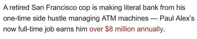 最近纽约时报和Dailymail等媒体都报道了一个有趣的新闻。 新闻的主人公是一名美国警察,不过他已经辞职了。而辞职的原因是他在35岁时就已经早早的实现了财富自由! 现在的年收入已经高达800万美元! ![]() 有人好奇,在美国当警察这么赚钱吗? 他不是通过本职工作实现财富自由的,赚钱的关键点在于他的副业。 2017年,29岁的Paul Alex在加州湾区当一名普通的警探已经1年了,但是他当时的薪水只有2,000美元。 ![]() 工作紧张,没有自由,工资低等等因素让他寻求改变。 ![]() 据Paul Alex称,他在18岁时曾下定决心有一天成为百万富翁。 但这个伟大而幼稚的梦想“没有方向”,他也不知道将如何实现他的梦想。 ![]() 在26岁加入警察部队之前,他在20岁出头时做了一系列的零工。 成为警察后,虽然他在两年内被提升,工资成为六位数,每月收入可以达到2万美金,但他的个人生活正在崩溃。 他在Instagram上解释说,他正在“16小时轮班”,每晚只睡“三个小时”。 ![]() 他也不喜欢他经常“将自己的生命置于危险之中”。 他在接受《商业内幕》采访时补充说,自己没有任何个人自由,也忽视了个人生活。 “我没有和我爱的家人混在一起。我是一个有大家庭的人。归根结底,我意识到,这不可能是生活。” 2017年,在他的一位同事建议他考虑购买自动取款机后,他开始对这个想法进行深入研究。 他加入在线论坛,并观看其他创办自动取款机业务的人发布的大量YouTube视频。 几个月后,他决定以2100美元的价格购买他的第一台自动取款机,并把它放在美甲沙龙里。 很快,他就被利润震惊了。 他说,在ATM上取款,每笔需要收取3 美元的交易费,这为他一下就带来了500 美元的月收入。 Paul Alex发现,一个好的位置每月可以带来 200 到 1,000 美元的利润。最好的地点人流量大,现金需求量大,比如美甲沙龙、理发店、当地杂货店、纹身店、药房等。 在他的第一台自动取款机取得成功后,他决定再购买五台ATM,把他的 ATM 机数量增加到 6 台,每月利润增加到大约 3,000 美元。 ![]() 他又在 18 个月内赚了足够的钱,购买了另外 24 台 ATM,使他的月收入达到约 15,000 美元。 ![]() 事业获得成功后,Paul Alex搬到了湾区的一个豪华社区,搬进了一套豪华顶层公寓,还购买了一辆梦中情车。 ![]() 随着利润的增加,终于,2021 年 3 月,他决定辞去执法工作,全职经营 ATM 业务! 随后,他创办了一家名为《ATM Together》的公司,致力于帮助其他人使用提款机创业。业务涵盖帮助创业者寻找他们所在地区的最佳置业地点等。 ![]() 虽然尚未证实他通过 ATM 机赚了多少钱,但《Business Insider》报道称,从 2021年1月到2023年4月,仅通过他的公司 ATM Together,他的总销售额就达到1200 万美元,净利润约为 350 万美元。 保罗在 Instagram 上声称,他说他已经用自己的收入成功让他自己的进入了退休养老状态。“人们总告诉我 ATM 机已经过时了,或者说我的创业晚了 20 年……有趣的是,我的企业每月净利润一直持续超过 10,000 美元,而且直到今天仍然如此,”他在社交媒体上分享。 |