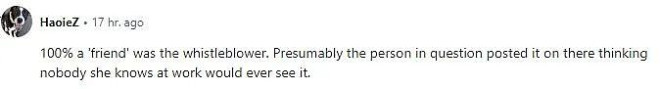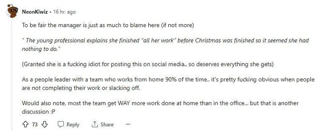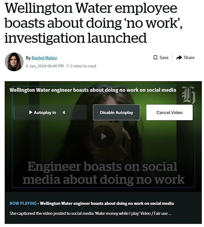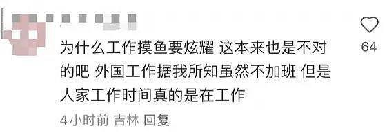 上班摸鱼,每个打工人的梦想。但你要是上班啥都不干,你敢大声吆喝吗? 近日,一名刚毕业没多久的华人妹纸工程师就在某书上发布了一段“记录自己一日工作”的视频,大大方方公开了自己在国外上班摸鱼的一天,没想到却迎来了史诗级的翻车... 先说下妹纸的背景。 这名妹纸(以下简称M),刚刚毕业,拥有Operator Research and Analytics的硕士学位。 M今年5月刚刚入职新西兰一家水务公司,担任工程师的职位,再此之前只有国内的工作经历。 这家水务公司是新西兰的政府机构,薪资待遇都不错,可以说是国外的“铁饭碗”。 那在这样一家外国“国企”上班的一天都要干些什么呢?M就用视频的形式为大家展示了。 先来看一下视频内容(外媒已剪辑,视频来自nzherald): 根据视频记录,当天是1月5日,M原本想继续在家里偷懒,但是她的男朋友担心公司可能会解雇她,所以带着M去公司上班了。 ![]() 早上9.20,来到公司后,她发现诺大的公司,只来了一个人。(暗示大家都在家摸鱼?) ![]() 接着她坐到自己的工位,打开电脑,一边回邮件一边解释说,在圣诞节结束之前,她已经完成了“所有的工作”,所以除了回邮件,似乎没有什么可做的了。 而回邮件也仅仅是,“除了圣诞祝福、新年祝福啥都没有,大部分公司都还在休息。” ![]() 接着,她开始和朋友一边喝咖啡一边“开会”。 时间很快来到了上午11点40分,在完成了两个小时的“工作”后,M自己给自己下班了,理由是“外面的天气看起来很好”。 在剩余的工作时间里,M去了健身房、看了一场电影、洗了车。 ![]() 最后还来一段总结,“今日公司出勤2.5小时,有效工作时间为0小时”。 ![]() 她还强调,“我可能是中国老板描述的那种找不到工作要做的员工。”颇有点洋洋得意、卖弄的意味。 视频很快引发了网友的关注,这?这国外上班那么轻松的吗? 很多网友对她的行为表示不满,表示她这种做法是对工作的不负责,必定有其他同事帮她完成工作。 ![]() 但她似乎对自己的行为并不感到抱歉,甚至称自己“凭实力”摸鱼。 她还回怼了那些批评她的人,评论说“希望2024年保持不变,不用做任何工作,继续领工资,耶”。 ![]() 一些人相信M的初衷是靠在社交平台展现自己“轻松高薪”的工作,以博取流量。但没想到的是,她这一波流量,竟然以如此快的速度,到达了新西兰。 昨天,新西兰多家本地媒体对M的摸鱼视频进行了报道。 ![]() 甚至还上了头版。 ![]() ![]() 新西兰网友们震惊了。要知道,如今的新西兰正面临着严重的缺水及水质问题。 ![]() 而日益增长的水费账单也让老百姓怨声载道。 ![]() 如今他们发现,自己交了那么多水费,还要面对缺水和水质问题。而水务公司的员工竟然拿着他们的钱,什么都不干? “水务公司的人确实没事可做,因为我们连水都没有!” ![]() 可想而知,一时间舆论肆起,水务被推上了风口浪尖。 昨晚,她所在水务不得不出面回应,发言人确认M确实是公司员工。 但他们强调员工的懒散态度并不代表他们团队的其余成员,他们其余的员工都是忠诚且敬业的,他们的日常工作状态和视频内容并不相符。 发言人表示:“我们正在进行一项内部员工调查,作为组织行为准则的一部分。” ![]() 也就是说,M在这家水务公司的职业生涯,可能已经走到了尽头... 对此,网友表示M并不冤,可以说是咎由自取。 “总会被一些人蠢到,如果你有一份好差事,基本上是在什么都不做的情况下得到报酬,最好保守秘密,不要在网上发帖,以免被识别出来哈哈。” ![]() “公平地说,这里的经理同样有责任(甚至可能更大责任) 这位年轻专业人士解释说,她在圣诞节结束之前完成了“所有工作”,所以似乎她没有什么事可做。"(尽管她是个白痴,把这个发到社交媒体上去... 所以她应得一切) 作为一个领导团队的管理者,我的团队90%的时间都在家办公,当有人没有完成工作或懒散度过的时候,是相当明显的。” ![]() 还有网友表示,上班谁都会摸鱼,但像她一样明目张胆还以此为荣的确实少见... “哥们... 我在工作中有过几乎什么事情都不用做。我会告诉谁呢... 一个人都不告诉。” ![]() 也有网友不走寻常路的表示,原来真有人会举报,再也不敢在某书炫耀了... “百分之百是一个“朋友”当了告密者。可以推测,问题的当事人发布在那里,可能是认为在工作中认识的人永远不会看到。” ![]() em...不像小编没什么可炫耀的,因为我上班从不摸鱼... |