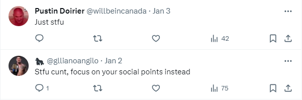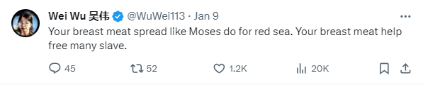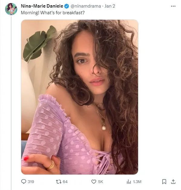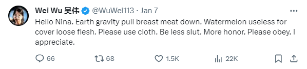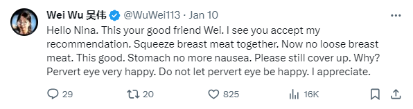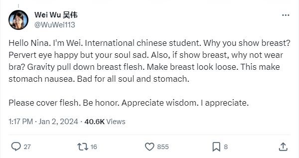 最近,有一名中国留学生 在推特上评论一名百万粉丝 引起了全网的热烈讨论! ![]() 图源:Reddit 先来介绍一下这次事件的“网红”! Nina Marie Daniele 是一位美国加州网红, 在TikTok上有360万粉丝, 为维密、Michael Kors等品牌拍摄广告, 后来更频频登上顶级时尚杂志。 现在是搏击比赛UFC的一名记者。 平时她在推特上发的照片 都是这样子: ![]() 图源:X@Nina Marie Daniele 配文也就是一些和粉丝互动的话术, 比如今天做了什么?你喜欢什么天气? 你今天看比赛了吗?等等…… 在1月2日, Nina照常发布了一张照片, 并配文:早啊,早餐吃什么? ![]() 图源:X@Nina Marie Daniele 网友们有正常回答的, 也有些调侃Nina的! 在乏善可陈的评论中, 有一条评论引起了网友的热议! ![]() 图源:X 一为名为Wei Wu吴伟的网友评论: 你好Nina,我是Wei。中国留学生。 为什么要露出胸来? 愉悦了流氓的眼睛, 但你的灵魂却很悲伤。 还有,既然露胸了,为什么不穿内衣呢? 重力会让胸部下垂,让胸部看起来松弛。 这会导致胃部恶心。 这对你的灵魂和胃都不好。 请盖住她们,谢谢。 从此开始, Wei就不断的在Nina的帖子下, 发表不同的评论。 ![]() ![]() ![]() 图源:X 评论发出后, 自然获得了广大网友关注! ![]() 图源:X 有网友说: “这是我这个月在网上, 看到最好的评论。A+” 当然也有人对Wei的评论表达了不满! ![]() 图源:X “不爱看就别看。” ![]() 图源:X “闭嘴,干你自己的事吧!” 这件事被转发到Reddit上以后, 也引起不少人的评论。 ![]() 图源:Reddit “‘愉悦了流氓的眼睛, 但你的灵魂却很悲伤’ 是我见过最美丽、最凄美的台词之一!” “我可以把它当作我的一个标签。” ![]() 图源:Reddit 也有人表示, “Wei可能是一个 假装成中国女留学生的美国男人, 甚至不是第一个 做这种事的诈骗账户。” ![]() 图源:X 从Wei的账户看得出 她常驻美国,有时候来加拿大。 但是确实没办法确定真实身份。 你怎么看这个事? |