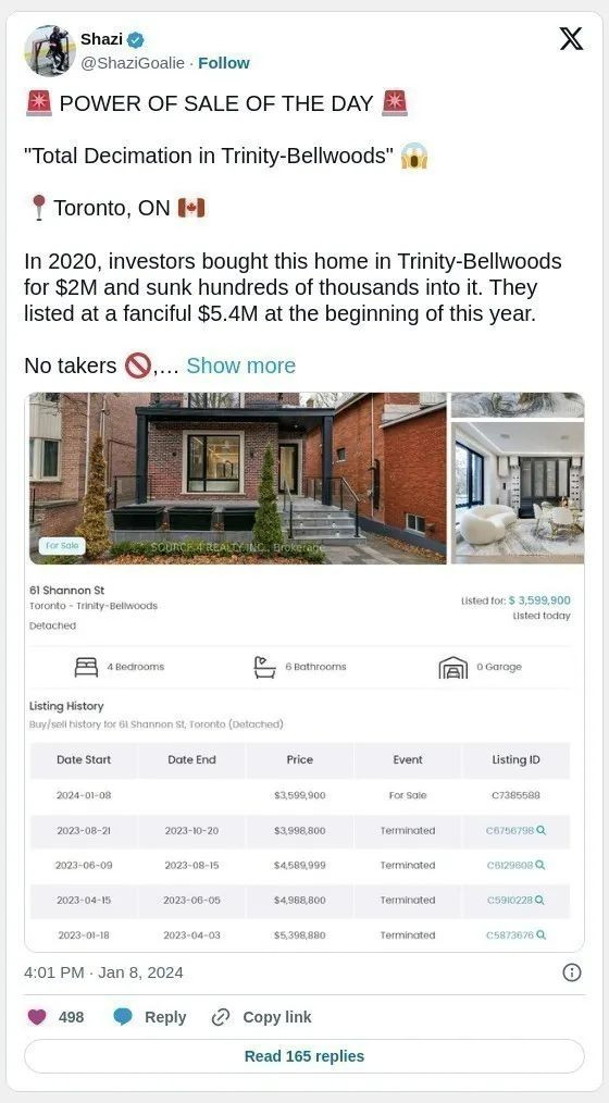 2022 年 3 月,Vault Capital 以该房产为抵押提供贷款 164 万元(这笔金额在随后的再融资中增加),当时正是安大略省房地产估值泡沫的顶峰。现在,Vault 正在寻求 280 万元的债务偿还,在此之前,这套房屋还以抵押的方式给多家公司、个人和其他贷方,共登记了近 290 万元。 Emerald 公司的创始人 Avneep Singh Baidwan 表示,即使能找到买家,Emerald 很可能会在该项目上还是亏损的。 根据媒体调查,Emerald 公司的债务已经超过 2200 万加元,这与其公司网站所宣传的 6 套房产有关。现在许多翻新装修后挂牌的房屋都是在面临着债务和索赔,Baidwan 称,这是在 2023 年市场调整期对于未来期望值的错误判断造成的。 不管这座房屋究竟花了多少钱装修的,但房地产经纪人 Scott Ingram 认为,这套房屋最终都不可能实现收支平衡。 他介绍说,这套房屋所在的社区及其周边,历史上只有 3 套房屋售价超过 500 万,而且要么房子很大、要么更加独特,因此这套房屋最初希望以 500 多万出售其实定价本身就是错误的。 ![]() ![]() 巴特勒抵押贷款公司(Butler Mortgage Inc.)的经纪人兼所有者 Ron Butler 表示:现在市场中很多房产投资失败的案例,都是由于翻新转售投资而造成的。那些房主通常已经背负了巨额债务来进行翻新和升级,目标是吸引更高收入买家。 然而,投机的崩溃可能并不是发生在一瞬间,一段时间后,崩溃才会出现。 在加拿大最大的房地产市场,大多伦多地区,有数十个待售房源就像这套房屋一样,都是由贷方申请法院销售、或是类似情况。这可以看出在在市场高峰期购房的买家们在转售时面临的巨额损失。 Baidwan 表示,2023 年末现金紧缩情况变得更加严重,因为出售其整个投资组合的交易失败,当时他只能部分支付每月所欠的数万元抵押贷款。 Baidwan 是于 2010 年持国际学生签证从印度来到加拿大,在谢里登学院 (Sheridan College) 学习,获得了卡车司机和承包商的工作许可证,并最终获得了公民身份。 比 Baidwan 规模更大或更小的翻新者和投机者的最终命运仍在法庭上解决,但 Butler 认为,这种蔓延不太可能蔓延到抵押贷款投资公司和信用合作社的 B 级贷款领域之外。因为,这类贷款都是为了避开压力测试的要求,而银行是不会借钱给这些人的。 |