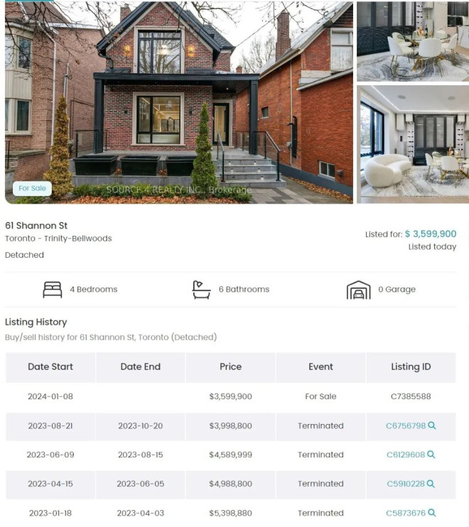 ![]() 这套位于 61 Shannon Blvd. 的独立屋最近被贷款借贷方挂牌出售,挂牌价格只有 359.9 万元,相比一年前房主的挂牌价格 539.8 万元降价幅度高达约 180 万加元。 ![]()