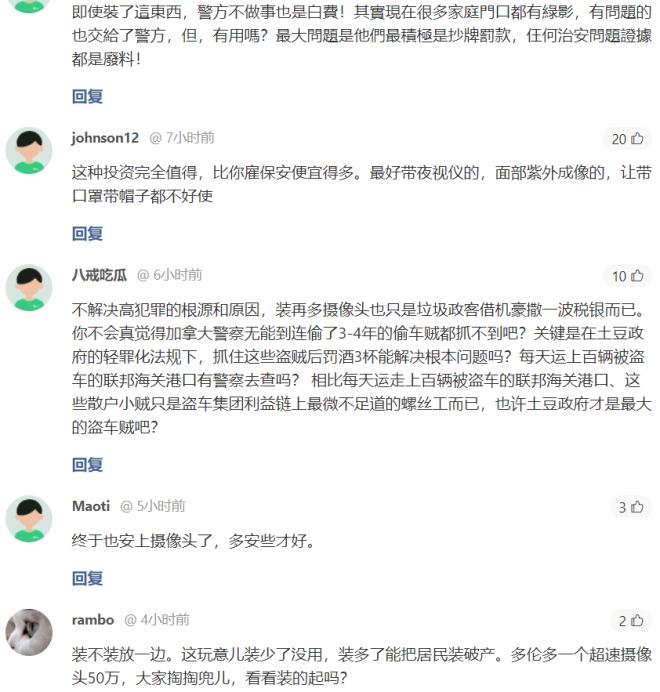如果你住在列治文,或经常往返列治文,你的容貌可能分分钟已被“高清”方式录下,目前列治文已经在110个十字路口安装了摄像头来监控交通,但因为太过高清,隐私专员表示,出于隐私原因,它们需要设置为低分辨率,这意味着摄影机无法捕捉人脸或车牌。 据《列治文新闻》(Richmond News)报道,列治文市可能会上法庭,看看他们是否能推翻隐私专员的裁决,并在十字路口安装高分辨率摄像头,以帮助破案。 ![]() 鉴于隐私专员的裁决,市议会现在要求对十字路口安装高清摄像头进行可行性研究,并可能会以获得法院命令支持它们,来采取主动权。 最初对摄像头的动议来自议员Alexa Loo,摄像头升级能使其捕捉高清画面。然而,这是不可能的,需要一个全新的摄像头系统,每个十字路口有五个摄像头,来取代现有的摄像头。 市工作人员向市议会提交的一份报告显示,目前交通路口的摄像头镜头的质量“对执法和调查目的的用处有限”。 ![]() 该市正在研究的超高清系统将耗资约655万元,用于189个十字路口。在市中心、Steveston和Bridgeport等部分区域安装将耗资约329万元。 此外,维护全市范围的摄影机系统每年还要花费近40万元,部分实施的费用约为20万元。 市议员Laura Gillanders对这个价格觉得太惊人了,她指出:“我认为,在像列治文这样的小城市进行这种投入太疯狂了。这种预算投入只应该在纽约和迪拜这样的城市进行。” ![]() Gillanders说:“我不明白我们是如何从那个原意,跳到现在的情况。”她补充说,她认为市政府工作人员应该从最初的提案中回来,只是简单地说“我们无法升级当前的摄像头,然后结束。” 她说,在面临无家可归危机和气候危机的情况下,花这么多钱是“不负责任的”,尤其是考虑到列治文的犯罪率很低。 Gillanders建议公共安全部长在机场、隧道和高速公路等关键地点安装摄像头。 ![]() Gillanders说:“为什么列治文要投入数百万元来安装摄像头,就为了解决可能每10年发生一次的犯罪吗?” 但议员Kash Heed则支援安装分辨率更高的镜头,他说,拥有这些摄影机将对犯罪分子起到威慑作用。 他说:“如果我们能从一开始就阻止这种活动在列治文发生,向所有人广泛解释我们在列治文有这种设备。就像是对不法分子宣告,如果你想犯罪,就不要来列治文。” 他进一步指出,列治文并不是唯一一个考虑安装这种高画质摄影系统的城市。 在报告中,市政府工作人员表示,他们将改变标准的操作程序,纳入“司法监督”,也就是说,任何警察要求提供资讯都要有搜查令。 ![]() 这些影像将储存10天。议员贺Andy Hobbs说,警方目前无法获得在列治文十字路口行驶的嫌疑人的车牌和样貌,这是“令人难以置信的”。 议员Michael Wolfe提出了一长串对摄像头的担忧,比如在其他国家发生的数据泄露。 此外,他说,捕捉人们的图像可能会变成一个“社会信用计划”,指的是捕捉人们的行为并对其进行分析的系统。 他认为市议会不应该浪费时间和金钱来探索这项技术,包括“冗长的法庭案件”。 ![]() 市长马保定(Malcolm Brodie)表示,他已经与BC省公共安全及法务厅长范和富(Mike Farnworth)进行了交谈,“我相信他完全支持我们想要采取的方法”。 马保定说,他不明白为什么私人手机拍摄的影片、行车记录器拍摄的影片和私人企业拍摄的影片可以在法庭上使用,但市政府对拍摄影片的做法持反对意见。 “不过是地方政府的一个项目,为什么现在会不相信它了?”马保定说,“我不认为这是对我们公民权利的侵犯,当你谈到维护公共安全的必要性时,我真的不这么认为。” Hobbs说:“我认为,有了法院的正确授权和正确的政策监督,当你在十字路口这样的公共场所说话交谈时,不需要担心它会侵犯我们的隐私和个人信息。” ![]() 最后,列治文市议会投票通过,决定继续探讨安装这些高画质摄影机的可能性。 作为了解过国内“天眼”威力的华人,对此也是意见不一: “即使装了这东西,警方不做事也是白费!其实现在很多家庭门口都有绿影,有问题的也交给了警方,但,有用吗?最大问题是他们最积极是抄牌罚款,仼何治安问题证据都是废料!” “这种投资完全值得,比你雇保安便宜得多。最好带夜视仪的,面部紫外成像的,让带口罩带帽子都不好使” ![]() “不解决高犯罪的根源和原因,装再多摄像头也只是垃圾政客借机豪撒一波税银而已。 你不会真觉得加拿大警察无能到连偷了3-4年的偷车贼都抓不到吧?关键是在土豆政府的轻罪化法规下,抓住这些盗贼后罚酒3杯能解决根本问题吗?每天运上百辆被盗车的联邦海关港口有警察去查吗? 相比每天运走上百辆被盗车的联邦海关港口、这些散户小贼只是盗车集团利益链上最微不足道的螺丝工而已,也许土豆政府才是最大的盗车贼吧?” “终于也安上摄像头了,多安些才好。” “装不装放一边。这玩意儿装少了没用,装多了能把居民装破产。多伦多一个超速摄像头50万,大家掏掏兜儿,看看装的起吗?” 所以关于这件事,您怎么看? |