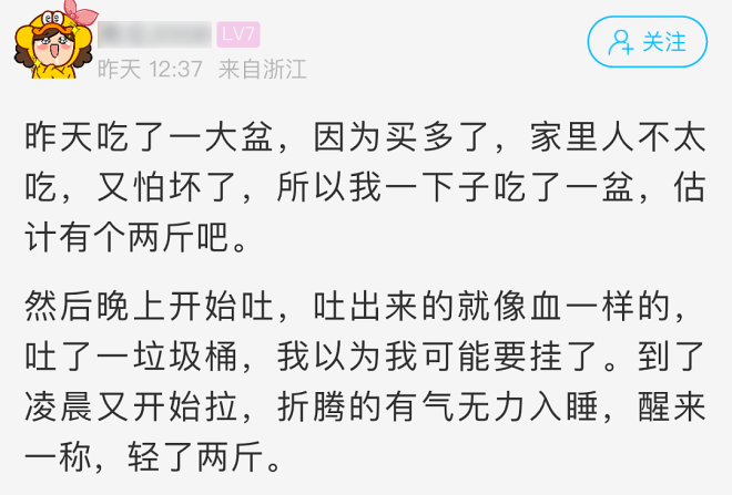 近期,随着海运车厘子大量到货,不少市场的车厘子价格大幅下调。 相比车厘子刚上市的时候,价格可以说是“拦腰斩”。 ![]() 福建厦门某水果批发市场批发商: 刚开始一件(十斤)是1000多元 ,现在打三折多了。 随着车厘子的降价 最近有浙江网友发帖称 车厘子买多了,家里人不太吃 怕坏了 所以自己一下子吃了两斤 结果又吐又拉 ![]() 该网友表示 一吃就停不下来 结果吃过量导致上吐下泻 她说以后不敢吃了 要不是今年便宜 自己也不会吃那么多 ![]() 由于市价一降再降 很多人都是一箱一箱往家买 ![]() 本以为网友这个分享 是个个例 结果评论区 很多人称,自己也中招了 甚至有人进了医院 ![]() ![]() ![]() ![]() ![]() ![]() ![]() 经小编查询 此前有媒体报道称 重庆一位王女士 连着5天吃了近6斤车厘子 结果腹痛难忍 一晚上跑了20多趟厕所 排出的都是血便 最后晕倒入院 据悉,这并非是中毒 而是王女士食用车厘子过多 致使肠道功能紊乱 多次腹泻后导致脱水晕倒 至于“血便” 主要是车厘子当中的色素 将大便染成了红色 车厘子清甜爽口营养多 大人小孩都爱吃 它的微量营养素丰富、血糖反应低 对肥胖人士也很友好 还有临床试验发现 吃车厘子有助于缓解压力 但再好的水果 过量食用也不可取 “一次性吃太多易造成消化不良, 可能导致腹痛、腹泻等不适症状。” 上海市瑞金康复医院 营养师徐丁婷介绍称 车厘子含有丰富的膳食纤维 果胶和有机酸含量较高 一次性摄入过多 可能会超出肠胃的正常消化能力 进而引起腹胀、腹泻等 消化不良症状 徐丁婷建议 对于本身胃肠功能较差的人来说 冬天无论吃什么品种的生冷水果 都要少量 而对于阴虚火旺体质的人 还可能导致上火 造成长痘痘、口角溃疡等情况 《中国居民膳食指南》建议 每人每天吃水果200-350g 考虑到实际吃进去的部分是去核的 稍微多吃一点问题不大 但也不要超过一斤 这些人不建议吃车厘子 1.容易上火的人 车厘子属于温性水果,食用过量会导致体内燥热增加,使人出现上火症状,如口腔溃疡、牙龈肿痛等。所以,本身容易上火的人,要少吃车厘子。 2.容易腹泻的人 就像上文所说的,食用过量车厘子会导致腹泻。车厘子甘甜多汁,含有较多的膳食纤维。 适量食用车厘子可以促进肠胃蠕动,防止便秘。 但对于本身肠胃不好,容易腹泻的人来说,食用过量的车厘子,就可能引发腹泻甚至脱水。 |