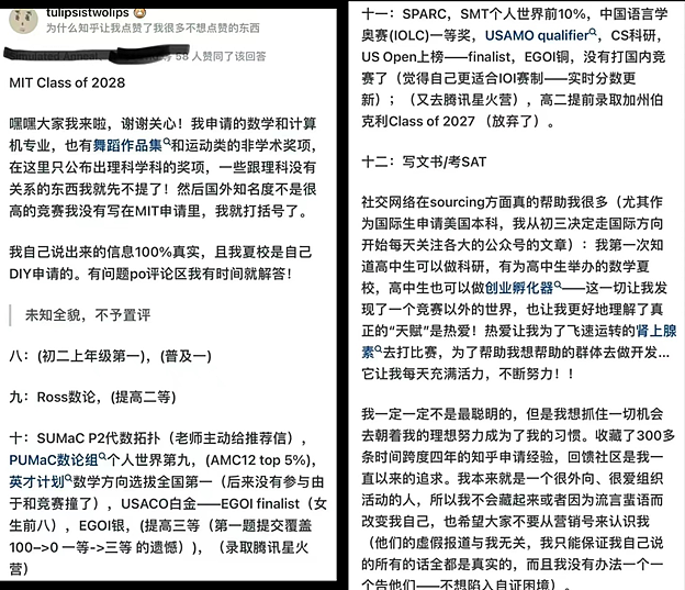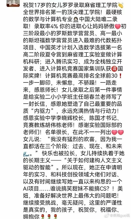 麻省理工学院,全称Massachusetts Institute of Technology,缩写为MIT,是个全世界学子们都“心之所向”的地方。 对于世界上绝大多数同学来说,MIT可谓是“虽不能至,心向往之”。 ![]() 每一年,被MIT导师直接录取的中国高中学生不过三、四人的样子(像2020与2021年都只录取了2人),可以说是万里挑一中的万里挑一。 去年被麻省理工直接录取的三名国内同学分别是来自北师大附属实验中学的李同学,上海中学(本部)的孙同学和深圳中学的姜同学。 李同学也是三位同学中唯一一名女性同学。她正是最近火爆网络的举报风波的导火索。 1 “羡慕嫉妒恨”外加举报文化盛行,女同学遭受无妄之灾 李同学被录取后,她的母亲开心、激动、自豪之情溢于言表。在朋友圈发文对女儿表示祝贺,也写下了多年一路走来的心路历程。 ![]() 没想到这个朋友圈着实是捅了马蜂窝,因为它被很多不相识的家长疯狂转发。 因此,有些家长肯定是“羡慕、嫉妒、恨”了。 他们围绕着孩子的成绩与国籍问题展开了疯狂质疑。这些家长们找出了李同学参加过的各种竞赛及成绩,认为她“成绩不硬核”,“分数难服众”。 也就是说,成绩跟她差不多好的孩子那么多,凭啥她能被MIT录取? 于是,据网络传言,很多家长就去MIT举报了,希望校方“收回成命”。 这就是这些家长思维模式的悲哀了。美国大学录取一名学生,除学习成绩外,课余活动的能力、积极参加体育活动、社会活动的能力也很重要(我们在下文也会展开讲)。 按照李同学中学的官方V博(SDSZ国际部),李同学不仅竞赛成绩优秀,还作为导演和演员参加过音乐剧,拿过2023非虚构创意写作三等奖,参加过各种演讲活动(以下截图均为公开资料)。 ![]() ![]() 李同学小学在西城北京实验二小,初中和高中就读于北师大附属实验中学。她学习成绩一直很优秀,据称初中始终保持年级前十,到了高中更是年级第一保持者。 高中开始李同学从普通班转到了该校国际部。 从初中到高中生涯,李罗罗参加的活动非常多。 她参加过各种数学类的有罗斯数学训练营(Ross)、斯坦福数学营(SUMaC P2代数拓扑)、普林斯顿数学竞赛(PUMaC数论组)、美国高中数学竞赛(AMC12)、英才计划。 计算机算法方向的也有包括MIT在内的各种夏令营。竞赛类的有NOIP(全国青少年信息学奥林匹克联赛)、USACO(美国信息学奥林匹克竞赛)。 ![]() ![]() 面对网上的质疑,李同学也是在中文社交平台上发长文一一解释,自证,回应质疑。 ![]() 除了李同学的自证之外,她的老师、同学、学校也出面为她证明她是一名优秀并且符合MIT录取资格的学生。 当然,还是有人不依不饶: ![]() 不过这些“质疑”是很难改变录取结果的。 事实上,作为万里挑一中的万里挑一,麻省理工学院在录取学生方面也是做了大量细致工作的,其中当然包括全方位考察以及文凭和奖项的核验工作。 这次举报事件还令人想到了这样一个问题,那就是,每年美国的大名校们公布录取的中国同学之后,这些同学的真实姓名、就读学校、身份背景之类的重要个人信息就会被“热心网友”们群起搜索并在网上大肆公开。 这样的行为事实上是属于严重侵害个人隐私的。 2 “最猛的料”又是什么? 这场质疑与举报风波中所谓最猛的料又是什么呢? 那就是国籍问题。 上文提到过,李同学的高中是北师大附属实验中学,能考进去当然要有北京籍以及高考成绩。 北师大实验中学又是准入制度极其严格的重点中的重点中学,不可能在这两个最基本环节上有猫腻。 ![]() 事实上,很多学习极其优秀的同学都是栽在了没有北京籍上面,进入不了这所高中。 问题在哪呢,李同学也参加了USACO集训营。而USACO集训营是为了选拔可以代表美国队参加国际信息学奥赛的选手,只有美籍孩子才可以加入,并没有对外籍开放。 因此,很多网友抓住这一点不放,来进行质疑,因为他们认为同时有两个国籍是不可能的。 看来这些网友还根本不知道我们以前讲过的一个知识点。今天给他们补上。 全世界不同国家的国籍法基本分为两种,一个是落地国·籍·法,即孩子在某国出生就自动拥有某国国籍(更确切地说,是自动获取了拥有该国国籍的权利,最典型的例子就是美国,加拿大);另一个是血亲国籍法,即孩子跟随父母(双方或任意一方)的国籍,无论出生在哪。 ![]() 因此,一个出生在加拿大的中国孩子,落入人间的那一刻就会面临一个将会困扰他/她多年的问题——国·籍·冲·突,即他/她既拥有加拿大国籍,也拥有中·国·国·籍。 那中国不是不承认双·重·国·籍或多·重·国·籍吗?那为什么拿了加拿大、新西兰、美国国籍的孩子还能在国内上户口呢? 答案是:当家长把孩子带到国内之后,因为孩子自动具备中·国·国·籍,所以就能上户口,至于孩子其他国家的国籍,一概不予理会。 这就是为什么李同学既能参加国内的高考,上只有北京籍的孩子才能上的高中并且同时还能参加只有美籍孩子才能参加的集训营的“秘密”。 在此,我们真的是要奉劝这帮背后举报别人的网友们啊,与其把自己的生命浪费在查阅资料,鸡蛋里挑骨头找别人的“漏洞”去举报上,不如多交交朋友,多看看世界,多了解点基本常识,多团结他人,而不是悄悄树敌。 我们下面就来看看麻省理工学院的学子们有多团结一致! 3 只有团结一致,才能越来越强 在网上看了一些被麻省理工录取的亚洲学生拍摄的Vlog,他们在就学之前的激动心