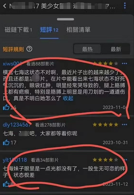 前段时间,日本成人界传出了一则令人震惊的消息,知名女优横宫七海自杀离世,这一突如其来的噩耗让许多喜爱她的网友不敢相信。 因为从横宫七海的社交账号来看,她一直都表现得十分阳光开朗。 谁也没想到,这个女孩短短20几年的人生最终以悲剧结尾。 ![]() 据了解,横宫七海出生于2002年,19岁时以素人身份出道,曾使用过真岛奈央和积木舞美的艺名。 横宫七海的首支作品并没有激起太大水花,也没有拿到专属合约。 但是凭借着在社交媒体上分享日常生活,横宫七海很快吸引了大量粉丝的关注。 横宫七海离世后,证实其死讯的好友,也在网上分享了横宫七海的生前往事。 据了解,横宫七海与家庭关系紧张,她的父母重男轻女,经常对她和妹妹进行殴打。 横宫七海的父亲一直坚信女孩上学无用论,企图把姐妹二人赶出家门,勒令她们辍学打工。 为了让妹妹继续读书,17岁时尚在读高中的横宫七海就开始在女仆店和夜店打工。 ![]() 不过,女仆店的收入也难以维系姐妹二人的生活。因此在19岁时,横宫七海成了一名职业AV女优。 只不过首支作品销量并不好,横宫七海也因此背负了更多的债务,她的父母在得知此事后也与她彻底断绝了关系。 尽管如此,AV女优的工作依然不比女仆轻松。据统计,横宫七海出道两年,拍摄了超过四百多部影片。 ![]() 可能正是如此高强度的工作量,让横宫七海的精神状态愈发不稳定,这一点也体现在了她以往的作品中。 ![]() 比如在某部作品的评论区中,就有网友指出,横宫七海身上有许多疤痕,疑似用刀自残,以及她疲惫的眼神和消极的情绪,都是自杀的征兆。 ![]() 在影片拍摄过程中,横宫七海多次情绪失控。 或许正是在这种长期压抑的环境中,她最终无法坚持下去,做出了结束生命的决定。 ![]() 讽刺的是,虽然横宫七海已经去世,但她生前签约的经纪公司,近日却依然贴出了她的新作预发售广告。 而影片的剧情简介也非常“耐人寻味”:男主角的妻子因病早逝,后来又在歌舞伎町结识了与妻子同名的“神待少女”。 在日本,“神待少女”有特殊的含义,指因为家庭原因离家出走、请求陌生人收留自己的女孩,和七海的人生也惊人的相似。 ![]() 她们逃出家庭,所投奔的社会,只有一个又一个的陷阱,毫无温暖可言。 事实上,随着全球经济下行,失业潮席卷各地,成人影视行业也越来越卷。 2022年4月,日本正式将“成年”年龄从20岁,改为18岁。在新法令下,日本女孩18岁就可以合法拍成人影片,从业人数暴涨。 当年10月,日本又紧急发布《AV出演被害防止及救济法》法案,但并未有效改善行业现状。 或许对于横宫七海而言,生命就是一场充满艰辛的旅程,离开的同时也是一种解脱吧。 |