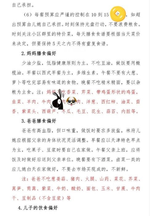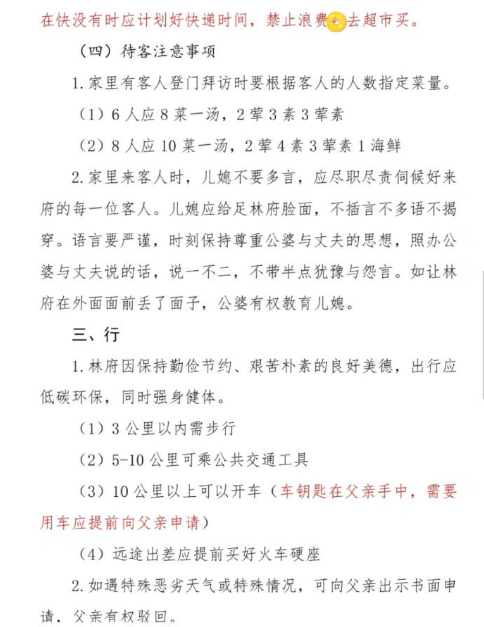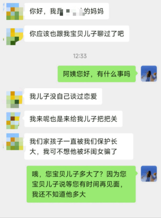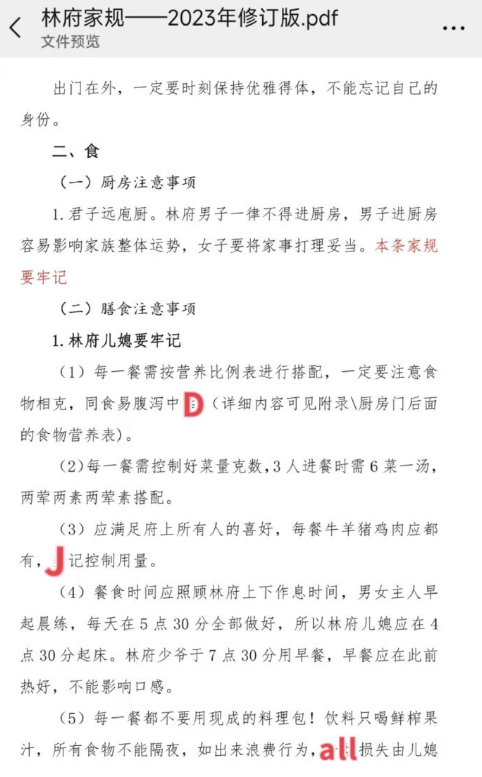 今天就是农历春节啦!各位回家or没回家的留学生有没有被家里亲戚线上or线下“催婚”呢? 催婚少不了安排相亲!相亲时的奇葩事,自然不会少!比如“你的强来了”的强哥…… 然而,最近一份《林府家规》直接薄纱所有其他相亲经历!更是登上了微博热搜!一切都要从一段聊天记录开始…… ![]() 图源:新浪微博 一开始就是高潮啊!“宝贝儿子”、“坏闺女”直接把男女对立局面拉满! ![]() 图源:新浪微博 然而,知道真相的后……再看“宝贝儿子”四个字,简直不忍直视…… 她甚至补充了一句:你们现在这些小闺女…… ![]() ![]() 图源:新浪微博 关心完了年龄以后,妈妈开始替“宝贝儿子”考察女方的家庭就业情况。“铁饭碗”、“靠我儿子”…… 在这些金句的同时,“宝贝儿子”仍旧是不离口。 ![]() ![]() 图源:新浪微博 当然,询问一下恋爱史也无可厚非,但是“没谈过恋爱”和“离过一次婚”,这…… 然而,这些都是铺垫!最炸裂的来了:《林府家规》登场! ![]() 图源:新浪微博 看起来阿姨是“勉强”让女孩通过了初试,然后发来了一份家规,有网友称,这份家规长达98页! 让我们来看一下吧!前方高能!请注意! ![]() 图源:新浪微博 课代表总结: 1. 林府男人都不进厨房 2. 每顿要6菜1汤,牛羊猪鸡俱全 3. 早晨4:30起床做饭 4. 不吃预制菜,只喝鲜榨果汁 5. 如有浪费儿媳承担损失 ![]() ![]() 图源:新浪微博 课代表总结: 1. 做饭花费不许超过¥15 2. 菜谱5天内不许重复 3. 家庭成员口味偏好 ![]() ![]() ![]() 图源:新浪微博 课代表总结:佐料现吃现买,指定店铺、品牌。 ![]() 图源:新浪微博 课代表总结: 1. 来客人时儿媳多干活少说话,令行禁止。 2. 出门能走路不坐车,能坐车不开车,省钱! 看完这样的家规以后,小姐姐也是从内心发问:“您为什么要给您儿子找对象呢?” ![]() 图源:新浪微博 看完这个“相亲经历”以后,有不少网友都在总结:没谈过恋爱的离异迷人宝贝林少爷, 甚至有网友都表示:辛亥革命、新中国成立都没通知林家府上? 当然,也有不少网友表示,这样的对话一看就是“剧本”,并不是真实的。你怎么看呢? 你有没有过奇葩相亲经历?欢迎留言交流啊! |
