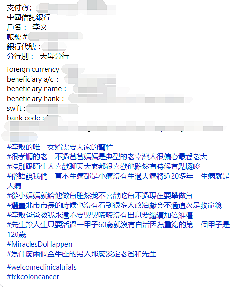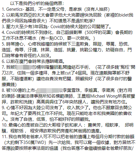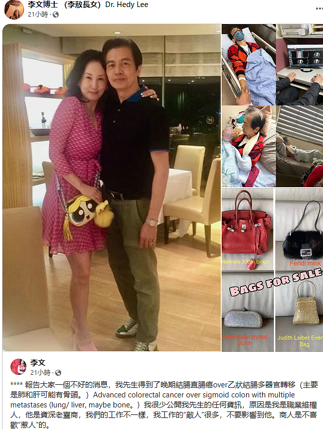 2月7日,已故作家李敖的长女李文发文透露,二婚丈夫程子立罹患直肠癌晚期,由于生活及事业不顺,李文希望外界给予资助。 ![]() 李文在文中表示,二任丈夫患上直肠癌,已转移到肺、肝及骨头,她顾及到丈夫的商人形象,不是很想公开此消息,但最终还是决定公布。李文指出,丈夫半年前出现拉肚子及体重减轻,后来严重到每一个小时都要去厕所,体重降了8公斤,然而丈夫却不肯去医院检查,直到她以离婚要挟才去看了医生,结果有点晚了,医生建议他切掉乙状结肠。 ![]() ![]() ![]() 李文分析了丈夫患癌的原因,包括基因、上厕所洗屁股(过于干净?)、压力大、长时间不休息不喝水、喝酒及心情不好等。 ![]() 李文表示经济状况不佳,因为疫情关掉了大陆的公司,然后又在台湾打官司,公婆留下来的遗产也被丈夫的家人霸占了。 李文计划一次性拿出父亲留下的所有遗产,大约350万台币(折合人民币80万元),但是被拒绝了。 如今丈夫失业、公司关门,只有李文在美国教书的收入维系生活,即便如此,李文还是不愿意放弃,希望丈夫接受最先进的治疗以及最好的药物。 李文公布了自己及丈夫的银行账户,恳求大家帮忙,还在文末附上标签,指丈夫是李敖唯一的女婿,很孝顺的人但公婆偏心大伯,同时也提到父亲对她的教导。 ![]() 据悉,李敖育有二女一子,李文是和台大校花王尚勤所生,14岁就被送到美国留学,之后一直在北京定居,她和父亲一样嫉恶如仇,但父女话不投机,关系淡薄。 ![]() 李敖在2018年病逝,生前立下遗嘱,所有著作权留给李戡母亲王小屯(王志慧),等儿子李戡有能力后再接收所有财产,李文则拿到个月1000美元的生活费,直至她70岁,但李文拒绝接受,与后妈争产大闹法院。 ![]() 李文曾有过一段婚姻,他和现任丈夫在2015年于厦门认识,丈夫是一位台商,两人交往后不久,李敖就病了,她在丈夫的支持下重回阔别30年的台湾,因为女儿一直很强悍,李敖不希望她回去,不过李文最终还是决定留在台湾定居,继而掀起争产风波。 |