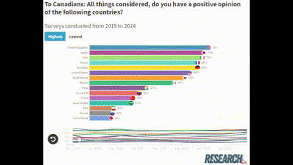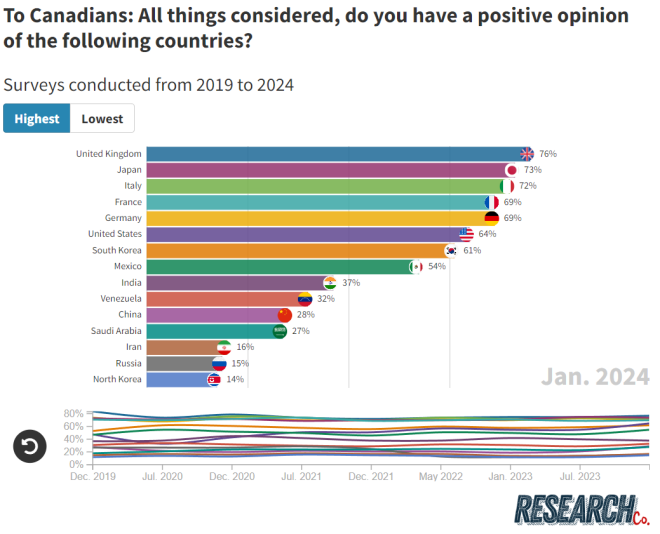 每半年Research Co.和Glacier Media都会调查加拿大人对15个国家的看法,了解舆情以及公民对国际政治的情绪。 ![]() 在最新的报告中,加拿大人对中国的印象普遍提升(28%),已经是自疫情时达到最低点以来的最高。尤其是18到34岁的年轻一代,对中国报以好感的比例将近一半(45%),而55岁及以上的人群则很少对中国持好感(19%)。 ![]() 目前,萨省和曼省(33%)对中国的看法最积极,其次是魁省(31%)、大西洋省份(29%)、BC省(29%)、阿尔伯塔省(25%),最后是安省(22%)。 从2019年到现在,随着疫情结束和国际热点争议事件的消退,加拿大人对中国的印象在最近稳步回升,反超伊朗、俄罗斯和沙特阿拉伯。 ![]() 加拿大人对中国印象最差的时期在2020年新冠疫情爆发时期,再加上2018年底发生的孟晚舟事件令中加之间外交陷入僵局,2020年12月的数据显示只有19%的加拿大人看中国顺眼。 在俄乌战争爆发前,中国一直是国际政治批判的众矢之的。2021年1月的报告显示,68%的加拿大人对中国持负面看法,这一比例在男性中攀升至73%,在55岁及以上的加拿大人中攀升至81%,在BC省中攀升至72%。56%的加拿大人认为应该抵制北京冬奥会,68%的人试图抵制中国产品。2022年5月,也只有20%的加拿大人对中国印象良好,在保守党大省阿尔伯塔省,这一数字下降到14%,在55岁及以上的人群下降到10%。 俄乌战争爆发后,本来遥遥领先于中国的俄罗斯风评下降,排到了倒数第二。加拿大人还是很关注新闻的,对不同国家的看法和媒体的报道息息相关。 ![]() 其他国家例如印度,因为去年签证造假、刺杀宗教领袖Hardeep Singh Nijjar的风波几乎霸占了一年的头版头条,人们对印度人的信任和友善度一降再降。本月,37%的加拿大人(下降了2%)喜欢印度,而在2023年1月的调查中, 41%的加拿大人对印度给出正面评价,其中45%的BC省居民对印度持好感。 墨西哥一直被视为加拿大人完美的度假圣地,然而,去年1月墨西哥的毒品与黑帮暴力(卡特尔组织)日益严重,人们不再能向以往那样飞往墨西哥欢度冬天,因此评分下降到37%。而这只是暂时的,只花了一年的时间,墨西哥又重新赢得了加拿大人的喜爱(54%)。 比较有趣的是人们对美国的态度。2020年7月,即上一次美国总统竞选期间,加拿大人嘲笑南方邻居令人着急的“抗疫成果”,对美国持积极看法的比例特别低,只有32%。现在,有64%的加拿大人对美国印象不错,比半年前的民调数据上升了10%。 ![]() 加拿大人对美国的看法一定程度上是由谁入主白宫决定。按年龄分层看,2020年7月特朗普上任之际,只有大约三分之一的18至34岁(35%)、35至54岁(32%)和55岁及以上(32%)的加拿大人对美国持好感。 拜登担任总统期间,人们对美国的印象回升,年轻人的比例为59%,中年人口为62%,老年人为71%。按政党看,加拿大的保守党选民和自由党选民都更喜欢拜登总统,保守党对美国的好感度从2020年7月的47%上升到现在的77%;自由党选民(从30%到70%)和新民主党选民(从24%到57%)中也很明显。 信息来源:BIV |