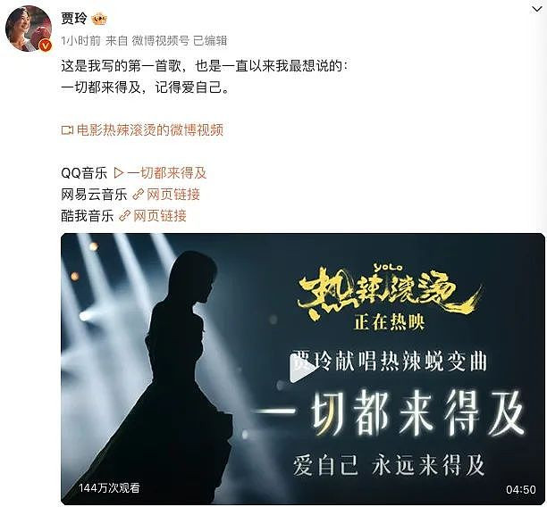 2月18日上午,贾玲电影《热辣滚烫》官宣发布热辣蜕变歌曲《一切都来得及》MV,该歌曲由贾玲演唱,贾玲、金灿灿作词,钱雷作曲。 随后,贾玲本人发文宣传:“这是我写的第一首歌,也是一直以来我最想说的:一切都来得及,记得爱自己。” ![]() 值得一提的是,在MV中,胖、瘦两个版本的贾玲隔空对唱,创意十足。同时,瘦身后的贾玲在MV中身穿黄色礼裙,一头大波浪的造型十分惊艳,网友们纷纷点赞。相关话题迅速冲上热搜第一。 ![]() ![]() ![]() ![]() 《热辣滚烫》总票房已达27.84亿 夺得春节档票房冠军 据猫眼专业版,截至14时50分,上映9天的《热辣滚烫》票房已达27.84亿元。而其预测总票房达38.8亿元。 |
