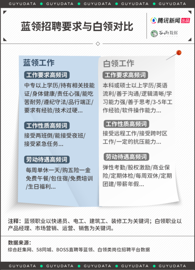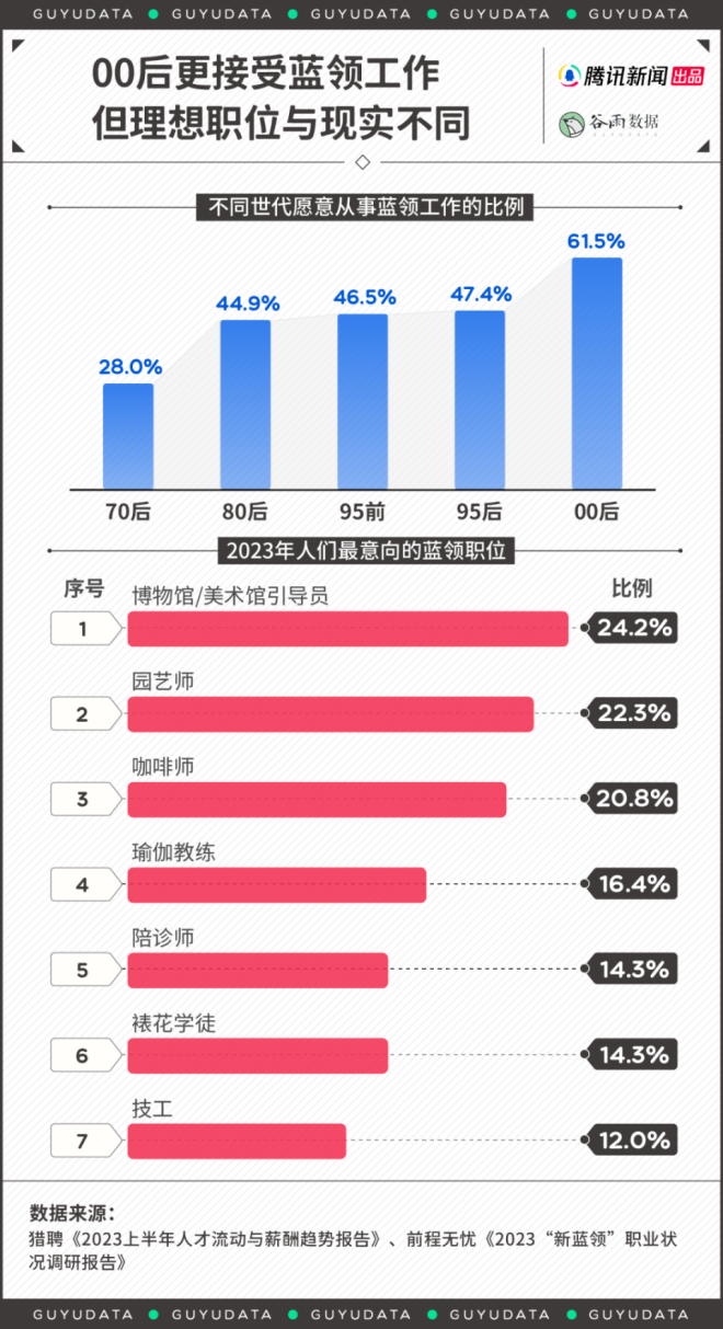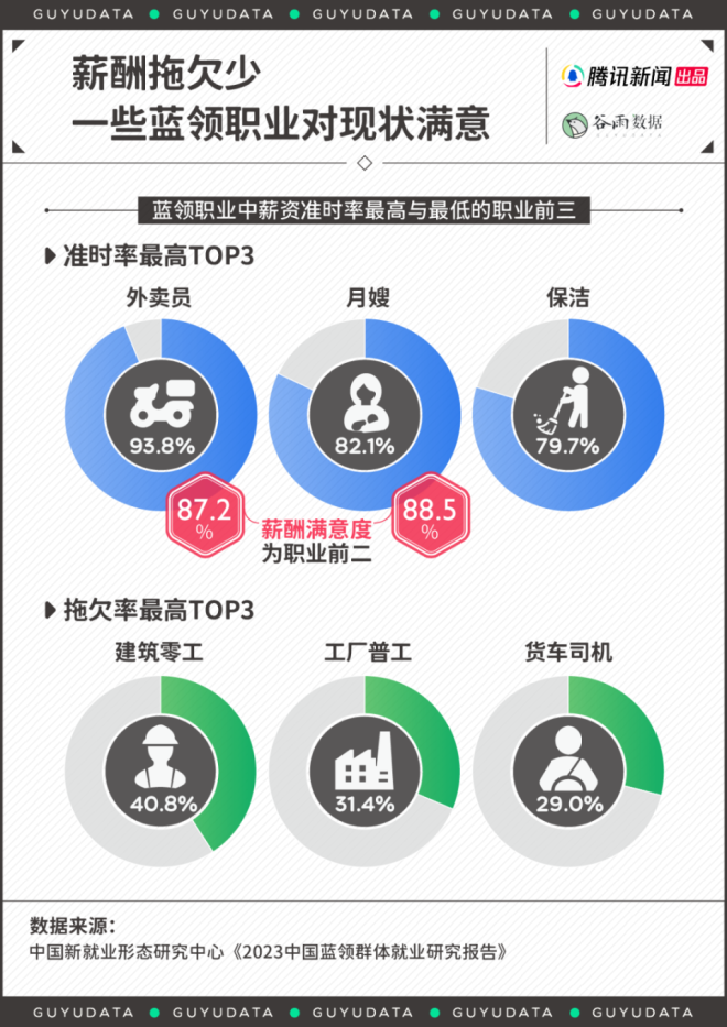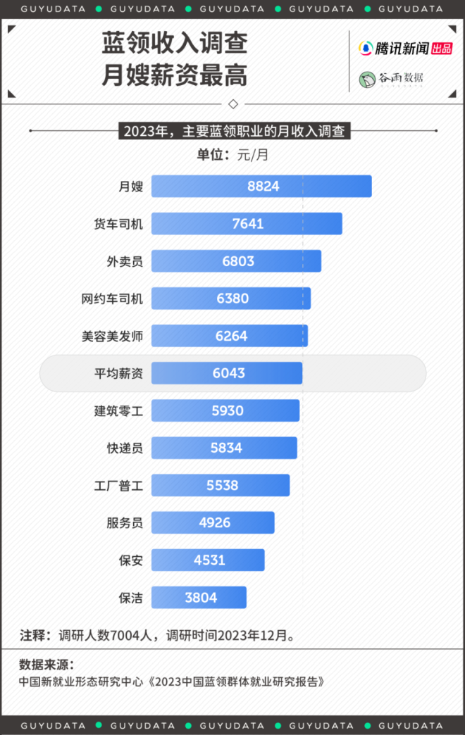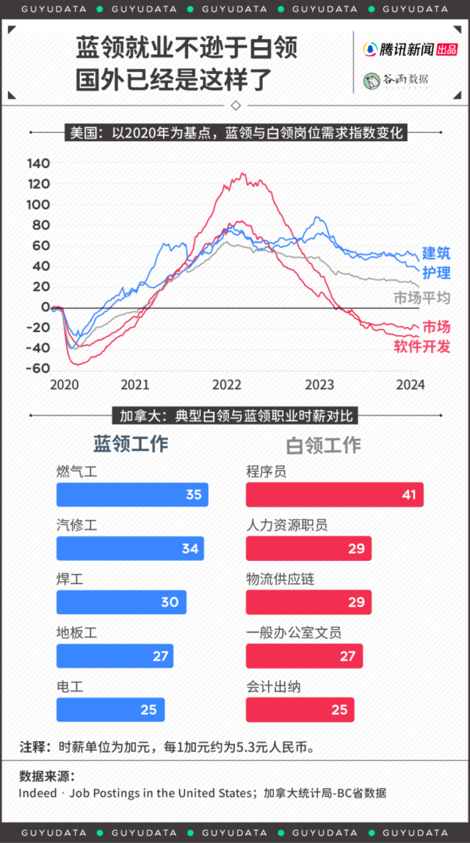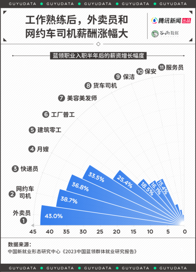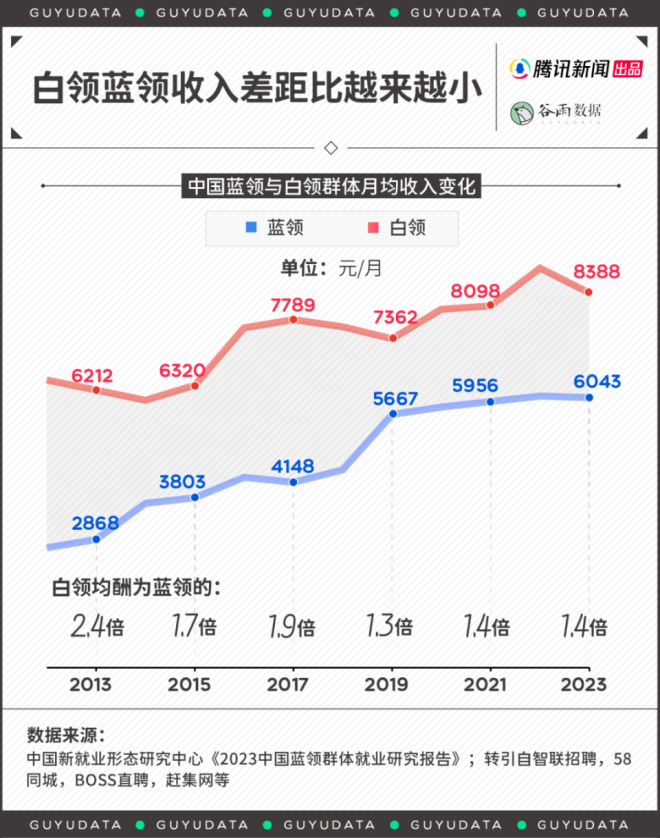 新年长假后,总是换工作的高峰期。 身在工位,心如死灰。要是工作内容不喜欢,总会萌生干脆辞职不干的念想。 职业之间总是彼此羡慕。尤其是,最近一段时间,“外卖员三年挣102万”“月嫂报价两万供不应求”的新闻,屡见不鲜。不管真假,都在悸动白领们的心弦。 情况可能是真的。蓝领职业悄悄崛起,为年轻人打开了一道新职业赛道的大门。 01 蓝领收入调查,这些职业很不错 一般来说,“白领”代指脑力劳动群体,比如文员,营销岗,金融岗等。而“蓝领”则指代体力劳动者,比如各种只能线下开展的技术工种。 曾几何时,进入明晃晃的写字楼上班,是求职目标、家庭骄傲。原因很简单,相比于蓝领,人们一般认为,白领所处的工作环境更好,发展上限更高,收入也默认更高。 然而,二者差距正在变小。 今年1月,中国新就业形态研究中心发布《2023中国蓝领群体就业研究报告》。数据显示,蓝领收入已逼近白领。 2023年,白领平均月入8388元,蓝领为6043元。白领收入仅为蓝领的1.4倍。而十年前,白领为6212元,蓝领为2868元。显而易见,白领薪资增长较慢,而蓝领收入大幅度提升。 ![]() 蓝领职业群体中,月嫂、货车司机与外卖员收入更高。 2023年,月嫂平均月收入达到了8824元,年薪轻松突破10万元。货车司机与外卖员,月入在七千元上下。保安、保洁,收入相对更低。 ![]() 薪资靠前的职业,许多是依托于互联网平台中的“新蓝领”,比如外卖员、网约车司机。 平台经济的逻辑在于,按效果计费,而非固定工资。为此,他们要学会与算法系统制衡,抢单、拉好评、挣积分,谋取最大收益。实在不想做了,关机下线,比待在工厂方便。 因此,等工作熟练后,“新蓝领”的收入涨幅更可观。工作半年后,外卖员薪资平均涨幅43%,网约车司机增长38.7%,快递员增长36.8%。 这也是部分蓝领收入接近乃至超过白领的关键——体力付出与收益成正比,其背后的朴实逻辑是:多劳多得,勤劳致富。 ![]() 而外卖员、月嫂工作还有一个优势在于,直接结算,拖欠率不高。相比之下,由于跟工程结项有关,建筑零工、工厂普工与货车司机时常出现薪资拖欠的问题,因此,不同蓝领的工作满意度其实差很大。 ![]() 尤其当与看似社会地位更高的白领相比,自己的工资更有优势,蓝领工作者的工作满意度也更高,比如从事美甲师的陈杨与技工浩然已心满意足。 95后陈杨在成都靠着美甲师的工作,每个月能有八千元以上的收入。 收入高吗?也还好。但她发现,成都高新区下班约美甲的姐妹们,许多月薪还没这么多。 陈杨回忆道,高中毕业后,考上了普通本科的同学,如果毕业后成为律师、老师,初期工资只有五六千。如果顺利进入事业单位或者成为公务员,每月实得可能更低。相比之下,她的情况还不错。 浩然也满足于目前的收入。专科毕业后,他在广东华为某工厂当技工,底薪四五千,还有千元左右的生活补助。 其他绩效工资,靠工作量计算。虽然加班多,但是给钱很实在。如果愿意多上班,他和同事的薪资可以突破万元,而且工厂提供住宿和饭补,他每个月的大额开支不多,大部分薪资都可以成为存款。 他算了一笔账:北上广租房至少两三千。加上吃饭、居住成本,一个在大城市拿一万多月薪的人,一年能存下的钱,还不如他攒得多。 陈杨与浩然如今的收入背后,跟所需技能的专业性有关。专业性不强的保安、服务员的报价通常难以提升,因为人人能做,但技能型蓝领经常供不应求。 最近几年,工厂面临用工荒的问题。年轻人不愿“进厂”,熟练技工难寻。供需不平等下,一个技工的报价就可以开到400-500元每天。 ![]() 某知名工厂在今年春节后放出的招聘公告 城市工作也这样。据商务部《国际商报》,春节用工荒,多地保洁价格普涨。今年1月开始,浙江省台州市钟点保洁的价格为50元/小时;湖州市多在60-70元/小时之间。 而一位月薪8000元的白领,按照工作日20天,一天8小时工作计算,时薪是50元/小时。算下来,很多蓝领真的与白领工资齐平甚至超过。 02 体力劳动收入高,国外早就这样了 蓝领收入逼近白领,是一个注定的结局。国外也是如此。 美国NBCNews报道,以2020年1月为起点,美国就业市场对于软件开发、营销等岗位的需求曾出现上扬,但在近两年迅速衰减。而以建筑、护理为代表的蓝领职位显现长盛不衰之势,市场需求旺盛。 因为,短时间内,脑力劳动者创造的社会价值,尤其是刚需的社会价值,显得没那么明显——大家真的养不起“精英”了。 人类学家大卫·格雷伯在著作《狗屁工作(BullshitJobs)》中指出,人类社会绝大多数的工作形式都是没意义的。“似乎有人专门发明了一些毫无意义的工作,只是为了让大家一直工作。” 作者认为,这类“狗屁工作”,写字楼里的职位是重灾区。 情况不限于美国。在发达国家,由于普遍的技术工种短缺,绝大多数蓝领的收入都很可观。 根据加拿大统计局数据,BC省(例如,温哥华)燃气工、汽修工、焊工等工作的平均时薪高于办公室职员,超过150元人民币。 ![]() 而这种趋势在今天依旧延续。 美国媒体报道,在采矿和伐木行业,工资在2023年全年增长了4.2%。同期,信息化职位的薪酬仅增长了2.3%。 日本情况也一样。由于面临人力短缺与少子化问题,蓝领工人在2023年第二季度的工资涨幅最高,同比增长5.2%。其次才是白领,为4.9%。 当然,不可否认,全世界的劳动市场里,脑力劳动的收入上限都更高。 但问题是,这