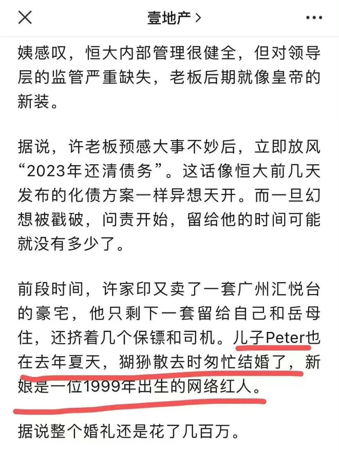 许家印的小儿子许滕鹤(Peter Xu)同志,也被抓了。 这位恒大二公子,也就是暴雷恒大财富的核心负责人,被抓是一点不怨,这也是内幕之一。 可靠消息显示,2023年9月,许滕鹤被带走调查。 这是许家印的大儿子是许智健,目前应该在国外。 ![]() 毕业于清华大学,负责恒大的物业、园林等不用抛头露面的工作,很低调务实,和他的老爹做派还是很不同的。 太子爷得爱好是这样的: 抽硬盒中华香烟;房间空调出风口要提前清理干净;冰箱内配椰汁(灌装)、阿萨姆奶茶、吸管;床上布草每天要更换、房间多备一条被子;喜欢喝可乐;喜欢吃薯条。 只是不知道这次是躲得过初一,能不能躲得过十五了?我们拭目以待。 二儿子许滕鹤 也就是被带走的这位,恒大二公子,很精致的年轻人,是地产集团的二把手,主要是分管恒大财富的工作,最终导致了这次被抓 这人的喜好与他哥哥相差巨大,让人大吃一惊,细节都很惊人: ![]() 小儿子就是这样的狂傲,哈佛毕业,真本事没学来,但是把资本主义的腐朽学的一点不少。 二公子的信息一直鲜少在公开信息中出现,21年12月,外媒曝出其以近亿元人民币折价出售了位于洛杉矶的一栋豪宅。 ![]() 许滕鹤降价出售位于洛杉矶豪宅。 据壹地产,二公子在去年匆匆结婚,新娘是1999年出生网红。尽管恒大如此负债累累,这场婚礼耗资还是数百万之巨。 ![]() 2016年春节前,恒大内部突然下了一份任命文件: 任命“Peter Xu”为旗下珠三角公司董事长。 此外,相近时间被带走调查的恒大系高管,还有恒大地产集团、恒大物业集团前董事长甑立涛。 早前被财新曝被带走调查的潘大荣,其实也是在相近时间被带走的。 ![]() 更多细节还是曝光了,这位高管: ![]() 用子如神许家印,许老板这样的安排,给自己的两个儿子注定了不同的结局。 ![]() 所以这笔23亿的信托资金,能够让许大公子能够安稳余生? 两个儿子的不同结局,也令人唏嘘不已。 当初的题词,什么许帝血脉,真呵呵 ![]() 许家印和恒大,注定将钉在历史的耻辱柱上。 ![]() 《2023胡润全球富豪榜》显示: 就算是到今天,许家印身家200亿,全球排行也是高居1100名,比巅峰时缩水超过90%,但还是如此之巨富。 穷途末路、缩水超90%,他的财富,依然是老百姓想都不敢想的天文数字! 许家印和丁玉梅的“技术性离婚”,财务分割,这样来欺骗老百姓? ![]() 权力和财富,这样的反差,这样的无耻,你怎么看? |