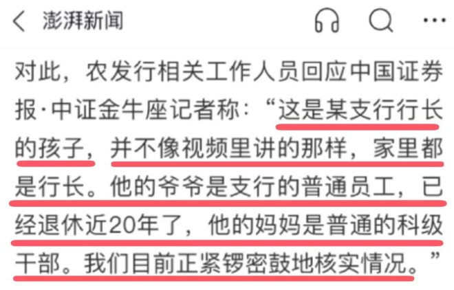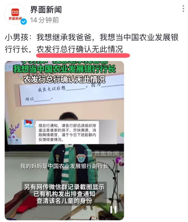 这两天,一个小朋友火了。 为什么火了呢? 因为这个小朋友在台上做自我介绍的时候,他按照老师的句式,说出了他的理想。 那么,他的理想是什么呢? 这位小朋友对着镜头说,他的理想,就是想当上中国XX银行的行长,因为他爷爷就是这家银行的行长,而他妈妈也是这家银行的副行长,所以他想继承他家的家业,把他们家的家产继承下来。 ![]() 看到一个小孩子这样的话被传开后,当事的银行懵逼了。 所以,当事银行的总部立刻在群里发布通知,要求各分行排查这个小孩到底是谁家的公子哥: ![]() ![]() 看到这样的“排查”,我笑了。 我才知道,原来在精英汇集的银行金融圈,也是这样“排查”人员的。 这样的排查,是在等着各大支行的行长跳出来认领这个小朋友吗? 这是想让各位银行行长自己排查自己,然后主动跳出来说:“这是我的孩子,我们家几代人都是银行行长”吗? 我就想知道,哪位银行行长能聪明到“自己排查自己”,然后主动跳出来说这种事呢? 所以,果然不出所料,在经过他们“严谨”的排查后发现,这位小朋友说的是假的,是不存在的: ![]() 那么,我聪明的读者们,你们到底是相信银行的辟谣,还是信小孩的话呢? 反正我是偏向信小孩子的话。 因为首先,上面的当事银行总部的那种所谓的“排查”,本来就很无厘头——让下面的人自己排查自己,你说谁会主动跳出承认自己家族几代人都是银行行长这种事呢? 再者,注意看上面的用词,说的是“总行确认无此情况”。这句话,其实可以有两种理解。第一种理解,就是“经过总行确认,没有这种情况”;第二种理解,就是“在我们总行这里,是没有这种情况的,其他支行我们就不知道了”。那么,你觉得是哪种理解才是总行真正的意思呢? 而且,大家都知道,小孩子都是童言无忌的,一般情况下小孩子压根不知道说出一些话后会牵扯到什么利益,所以一般小孩子都是想说什么就说什么。 可是当事银行里的大人呢,就不同了。 因为当时银行里的大人都明白,如果承认自己家族几辈人都是国有银行的行长的话,那这种事情,肯定就会牵扯到各种关系,同时还会牵扯到各种利益,甚至还会牵扯到一些任人唯亲、暗地贪腐的问题,所以,你觉得这些银行里的大人们会主动跳出来说实话吗? 让这些精英自己排查自己,然后相信他们最终肯定良心发现,然后自己跳出来承认问题?你觉得可能吗? 所以面对这议论纷纷的舆情,又有记者继续深扒采访了当事银行的一些知情的工作人员,然后知情的工作人员又给出了这样的回应: ![]() 知情的相关工作人员表示:并不都是行长! 看看,不愧是金融圈的精英啊,说话都那么有艺术内涵。 并不都是行长? 这到底是什么意思呢? 在经过记者的层层追问下,知情工作人员又给出了这样的答复: ![]() 相关工作人员表示,这孩子确实是某支行行长的孩子。但并不像视频里讲的那样,家里都是行长。他的爷爷是支行的普通员工,已经退休近20年了,他的妈妈是普通的科级干部。我们目前正紧锣密鼓地核实情况。 那么问题来了。 上面说这个孩子的爷爷是普通员工,已经退休20年了,那么这个孩子的爷爷,到底是一辈子都是支行的普通员工,还是退休的时候是支行的普通员工呢?还有这个孩子的妈妈,到底是支行的普通科级干部,还是其他单位的普通科级干部呢? 要知道,一个家族的人,即便他们家族不是每个人都是行长,可如果这个家族里的人若都是某银行支行的任职领导或职员的话,那这种事情,其实也是很值得深究的。 究竟是怎样的缘分,让他们都在一个单位里任职呢?要知道,农发行是一个政策性银行,这家银行是不办理个人业务的,他们只做一些国家政策实施方面的业务,所以,如果有一家人,都同在这家银行的某个支行上班,那这里面有没有涉及到一些盘根错节的利益问题呢? 而且,既然你们都确定了他爷爷只是支行的普通员工,妈妈也是普通的干部了,那你们还紧锣密鼓地核实什么情况呢? 所以说,金融圈的人不愧是精英啊,说的每句话都是那么有艺术内涵,每句话都是那么让人捉摸不透。 写到这里,我不禁想到了一句话——“普通人贷贷相传,银行人代代相传”。 当然,这句话如果你把它放进烟草、交通、水电等等这些行业里,似乎或许可能也都适用。 文章的最后,我想说的是,文章开头的这位小公子“乱报家门”这样的事之所以会发生,我觉得还是一些人不会教自己的孩子说话导致的。 如果你是银行行长,当你的孩子在说他的梦想的时候,我建议你一定要教他这样说——“我们家世世代代都热爱金融行业,所以我长大后也想进入金融行业,为国家的金融行业做贡献!苟利国家生死,家族传承吾辈责!” 你看,同样的意思,按照我的说法,这样说是不是就正能量很多了? ![]() ![]() |