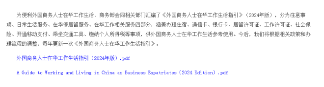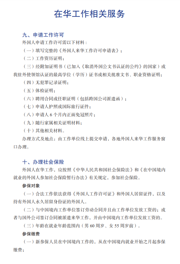 除此之外,这份指引还说明了外籍人士在中国工作相关额服务,包括申请工作许可、办理社会保险、缴纳个人所得税等,写的都很清楚。 ![]() ![]() ![]() 如果大家最近又回国打算, 这份指引可以收藏好, 以备不时之需! |