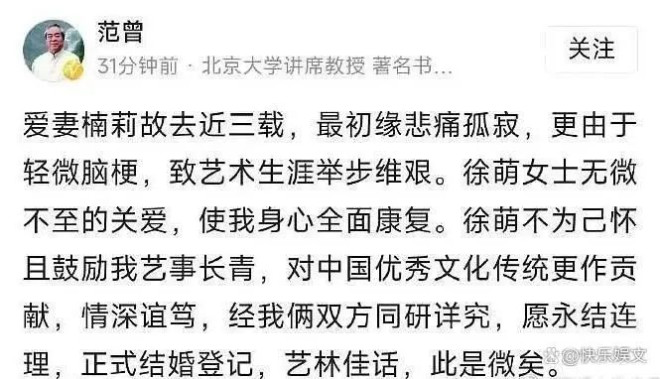 86岁书法家范曾官宣再婚 4月份。 一则叫人感到不敢置信的喜讯传来,86岁的书法家范曾,在原配妻子去世3年之后,竟然官宣结婚了。 实在是有一点匪夷所思。 ![]() 实在是没想到,既知名物理学家,诺贝尔奖获得者杨振宁迎娶小54岁娇妻之后。 86岁的范曾,也开始走上了杨振宁先生的老路,以86岁高龄配36岁娇妻。 让人为他的身体情况感到担忧,同时也为他的精神状态感到高兴。 ![]() 范曾表示,自己的原配老婆已经走了三年,这三年来自己的身体也不太舒服,而且还有轻微的脑梗。 所幸的是,遇到了无微不至的徐萌,让他身心全面康复。 慎重考虑之下,决定与36岁的徐萌登记结婚。 也就是说,范曾之所以与小50岁的娇妻结婚,主要是因为她毕竟懂得照顾人。 并且在日常的生活中,感动了范曾。 不得不说,徐萌真的不是一个简单的女子! ![]() 从照片中,我们可以看到,徐萌长得的确非常漂亮,颜值比翁帆都要更美。 而且作为模特的她,身材更加是好到不得了,简直是大家梦寐以求的娇妻形象。 最重要的是,她的形象气质看起来落落大方,真的是有一种大家闺秀的感觉。 相信他们之所以能够走到一起,肯定是因为真爱。 而并不是居于利益的关系。 ![]() 据悉,徐萌出生于1988年9月9日的重庆。 毕业于武汉大学,与雷军是校友。 2008年,徐萌参加国际中华小姐比赛,拿到了比赛的第三名2008年荣获年国际中华小姐季军。 而后进入娱乐圈,并且担任足球宝贝,大运会火炬手,并且拿下了穿越火线2011火线宝贝甄选活动冠军代言等等。 徐萌还拍过电影,代表作有《猫人女王》《闺蜜》等等。 可谓是小有名气。 ![]() 相比翁帆的淳朴,徐萌可是名副其实的娱乐圈女明星。 资本非常雄厚。 叫人不仅感到惊叹。 好像徐萌这样出色的女性,她是如何看上垂暮老矣的86岁范曾? 这的确是一个值得思考的问题。 ![]() 但是,我们从范曾的资料中,也不难看出,他可不是一个普通人。 范曾出生于1938年的江苏省南通市。 中国当代大儒、思想家、国学大师、书画巨匠、文学家、政治和外交家、诗人。 ![]() 现为北京大学讲席教授、中国画法研究院名誉院长,南开大学终身教授、终身校董、文史两院博士生导师,中国艺术研究院终身研究员、博士生导师。 中国国家博物馆书画院名誉院长,联合国教科文组织“多元文化特别顾问”,中华文化国际传播顾问和交流大使,国防大学、外交学院特聘教授,英国格拉斯哥大学、加拿大(专题)阿尔伯塔大学荣誉文学博士,济南大学、南通大学终身教授。 荣获法国荣誉军团骑士勋章、意大利共和国大将军勋章、国际奥委会主席奖杯、多次“荣誉纳税模范”称号、中华艺文奖终身成就奖等等。 ![]() 一看这一个介绍和标签,就叫人感到震惊。 据悉,范曾几十年来,捐赠祖国各地的书画作品价值60多亿元,曾被命名为“中国十大慈善家之一”。 不过,即使捐款了这么多钱,他的身家依然在10亿元以上。 可谓是几辈子都衣食无忧了。 ![]() 对于这一段婚姻,你怎么看? |