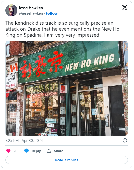 这事情的走向,真是越来越迷惑了! 周二,知名说唱歌手Kendrick Lamar新出了一首名为《Euphoria》的歌曲,主要内容就是疯狂diss多伦多本地说唱歌手Drake,言语激烈。 ![]() 图源:BlogTO| scarboroughcruiser/Flickr|Tinseltown/Shutterstock 然而,当地一家中餐馆在歌曲中被意外提及后,引起了广泛的关注。让不断升级的说唱之争达到了新的高度。 这首新歌以Drake担任执行制片人的热门HBO电视节目《Euphoria》而命名,并在歌词中提到了多伦多唐人街一家老店——新豪京(New Ho King)。 ![]() 图源:X Lamar对Drake进行了长达6分钟多的斥责,猛烈抨击了这位加拿大说唱歌手的混血儿和加拿大背景,甚至还对多伦多口音开玩笑。这首歌意味着两人长达十多年的不和似乎已经到达了顶峰。 Lamar在歌词中唱道:“I be at New Ho King eatin' fried rice with a dip sauce and blammy, crodie”(我在新豪京餐厅吃着蘸酱的炒饭,兄弟) 在这里,“crodie”是“brodie”一词的一个版本,“brodie”是多伦多俚语,意为“兄弟”或“兄弟”作为朋友。 然而,中餐馆New Ho King的意外提及已经对餐厅的评分产生了积极的影响。Lamar的粉丝在该餐厅的Google评论页面上留下了很多五星好评,其中许多人还特别提到了炒饭。 ![]() 图源:X 不过,也有人对他在diss中提到这家无辜的餐馆提出了质疑。 ![]() 图源:X Drake和Kendrick Lamar自2013年起就一直不和,最近几个月随着Drake在4月发行了两首diss歌曲,让事情又升温了。但本周,有关两人的diss之战,似乎是很多人的谈资。 |