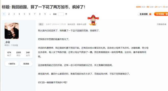 距离加拿大的疫情后全面开放已经过去2年,距离中国的疫情后全面开放也已经过去了一年半。 在2022年的时候,加拿大华人就在期盼着航班能够早日回到疫情前,可时间已经来到2024年中旬,航班回复速度依然很慢。 曾几何时,温哥华能飞中国13个目的地城市,每周所有航班加起来高峰期能有30班次左右,可如今呢? 只有高峰期的五分之一班次,这会导致机票价格继续维持在高位。数以万计的加拿大华人,自疫情爆发以来就没有回过国,迄今已动辄4年、5年、6年甚至更久。 而有的华人的确有家人在国内,尤其是上了年纪的父母,他们不回国被当做是“不孝顺”,但他们确实有难言之隐。 ![]() 众所周知,这两年加拿大的生活成本扶摇直上,别说是原本的低收入人士了,就连原本还算丰衣足食的中产阶级都过的磕磕碰碰,而很多加拿大华人属于中产阶级,自顾不暇,每月面临入不敷出,如何考虑回国? 可能有人会说:回国是贵,但到底能多贵,难道五年没回国且有家人在国内,也要省这个钱不回国吗?看来你是真的不孝顺。 ![]() 近日,在温哥华本地华人论坛上,有一位华人用自身的经历表达了“确实回不起国”,因为她这一趟,花了足足两万加币,超过十万人民币。 原文如下: ![]() 虽然这位网友的经历可能没有普遍代表性,但同样在疫情后经历了回国的网友,也开始了自己的计算,算出来的数额也非常惊人。 光是一家四口机票,就很“吓人” 最常见的“回国模式”,是一家人一起回国,在温哥华,非常典型的是四口之家。除非是年纪特别小的孩子(不用考虑寒暑假,机票便宜),只要到了学龄,只能是在寒暑假回国。 ![]() 以今年暑假的机票为例,加航每人来回机票费用大约在3000~3500加币之间,一家四口光是来回机票费用就已经是惊人的1.2万~1.4万加币,折合人民币6.3~7.4万! 什么,因为带着孩子,考虑买高级经济舱或者商务舱?前者的总机票开销直奔15万,后者更是天文数字。 当然,这对于真正有钱人而言不算什么,但试问现在的机票价格,能觉得不贵的加拿大华人比例有多少? 自己一个人回国的话,倒是可以选择淡季,但就算是淡季,来回也需要2000加币左右,是疫情前的3倍以上。 加上购物和娱乐,轻松“破十万” 继续说说一家四口或者一家三口,如果多年没回国,就像帖主说的那样,总要买一箱子礼物吧?比如加拿大的壕礼:始祖鸟、大鹅、Lululemon,花个几千加币是常有的事。 好不容易回国,而且是带孩子回国,总得去些游乐场吧?比如上海迪士尼、广州长隆,一家门票、食宿开支又是数千乃至上万人民币。 哪怕就是回国三周,加上机票、娱乐、礼物、走亲访友、请客等等费用,轻松破十万人民币。对于背着高房贷和孩子教育开支的不算富裕的家庭来说,这真的是一笔大钱。 如果省下这十万人民币(2万加币),相当于可以省下好几个月的房贷、省下好几年的地税、省下两年的饮食开支、省下好几年的汽油费和汽车保险费。如果回国,这十万“瞬间消失”。 在评论区有网友坦言:“这下我明白了,我真的不是不孝顺,而是回国真的太贵了。当我把实情告诉国内的家人,他们也明白了我的苦衷。” 就算钱不是问题,也不想花“冤枉钱” 还有一类迟迟没回国的加拿大华人,不见得是付不起机票,而是觉得以现在的高票价回国是毫无性价比的,就像是案板上的鱼肉。 ![]() 他们坚信中加关系会很快改善,相信航班会很快恢复,甚至在某一天“突然恢复”,从而大大压低票价 —— 这种想法,多半是在空想,但万一成真了呢?如果不是迫在眉睫必须回国,不妨当个“等等党”。 三四倍于疫情前的票价,可不是让人随便就能点击购买按钮的。转机回国?不管是转日本、转香港还是转韩国、转中国台湾,都只能稍微便宜些。 因为贵不回国?国内亲友可能是另有看法 既然回国那么贵,那手头不宽裕的华人为什么还要选择回国?一方面是出于孝顺、出于思乡,另一方面则是因为面子。 ![]() 有网友坦言:“父老乡亲不可能相信你移民到加拿大,却过着艰难的日子,不可能相信加拿大作为一个发达国家,却不能丰衣足食,如果你以回不起国为由不回来,那肯定是混的很差。” 尤其是父母,当知道你因为囊中羞涩无法回国的时候,不仅会质疑,可能还会伤心,觉得你当初出国是错误的选择,不该出国 —— 总之,很难以“回国贵”为理由说服国内的亲友。 ![]() 至于曾经在国内的朋友或者同学,也往往认为你出国后“难以高攀”,俨然已经是富庶的成功人士,而如果他们也知道你不回国是因为太贵……恐怕你的面子要荡然无存了。什么时候回国能便宜?没人敢去打包票,甚至没人再敢去猜测,只能走一步看一步,只能期待什么时候奇迹将临…… |