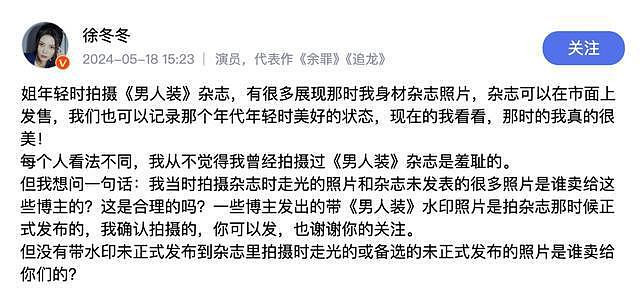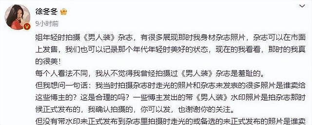 知名女星徐冬冬的私人走光照意外流出,引发了广泛的社会关注和热议。 据悉,这些照片是徐冬冬自愿拍摄的,但并未授权任何平台或媒体发布。 ![]() 事件曝光后,徐冬冬本人迅速发声维权,坚决捍卫自己的隐私权和肖像权,这一举动在各大媒体平台上引发了热烈的讨论。 徐冬冬在社交媒体上表示,这些照片是在特定情境下自愿拍摄的,但从未授权任何第三方发布或传播。 她强调,个人隐私权是每个人的基本权利,不应被侵犯或滥用。 对于此次照片外泄事件,她表示深感愤怒和失望,并呼吁社会各界共同关注并尊重个人隐私。 ![]() 另外,徐冬冬表示,一些授权过的照片发出来无所谓,可是对于一些未授权的走光照,则不应该被发布。 她承认自己年轻的时候拍过《男人装》,这并不是什么可耻的是,可是并不代表能够被人将走光照也发出来。 至于对于照片尺度的问题,徐冬冬表示当年是正常发行的,并不存在任何的问题。 但是有人想要拿她的走光照去牟利,就不行了。 ![]() 在徐冬冬发声维权后,各大媒体平台纷纷跟进报道,分析事件背后的原因和影响。 有观点认为,随着网络技术的发展和普及,个人隐私泄露的风险日益增大,需要提高警惕并加强保护措施。 同时,对于未经授权擅自发布他人照片的行为,应当予以严厉打击和制裁。 ![]() 也有网友认为,这一起事件可能是徐冬冬自导自演的结果。 但是对此,徐冬冬却表示,她根本不知道这一些走光照是如何流出来的,到底是谁卖给媒体。 叫她感到非常震惊,对于这样的侵权行为,徐冬冬表示自己一定要告到底。 另外,徐冬冬还分享了一些她认为可以被大家分享的照片,看起来颇为养眼。 ![]() 看完徐冬冬的美照之后,我们才明白,为何徐冬冬的未婚夫尹子维,会如此执着地要与徐冬冬结婚。 因为徐冬冬的确是太美了,身上不仅有大嫂的气质,而且各方面的条件都非常优秀。 这样不整容、天生丽质的女演员,实在是太少了。 ![]() 不得不说,徐冬冬的确有傲人的资本,那一些走光照流出,对于徐冬冬来说,的确是有损形象。 至少对于许多自诩正派的网友来说,印象分是要大打折扣的。 可是换一个角度来说,这也是徐冬冬打响个人知名度的一个很好的方式。 毕竟只要是美的东西,就一定有人欣赏和喜欢。 ![]() 徐冬冬直言不讳: "每个人对拍摄《男人装》有不同看法,我从来不觉得是种耻辱。 但问题是,那些未发布的照片是谁卖给博主的? 有的甚至拿去倒卖牟利,这合理吗?" ![]() 看到她愤怒的样子,不少吃瓜群众跟着叫好,直呼"姐姐说得对""终于有人敢讲真话了" ![]() ![]() |