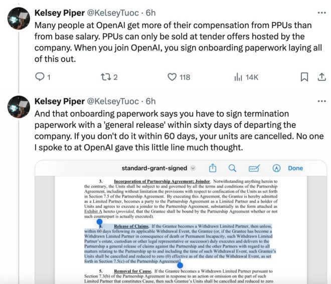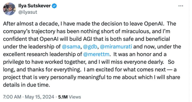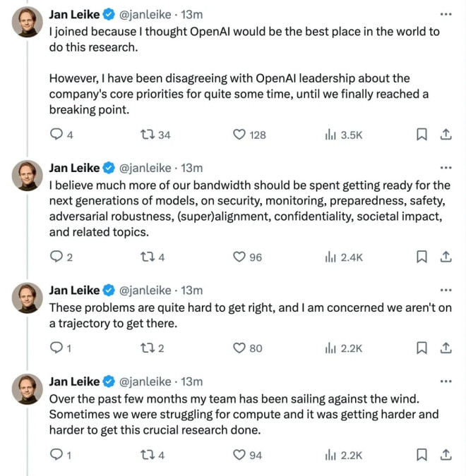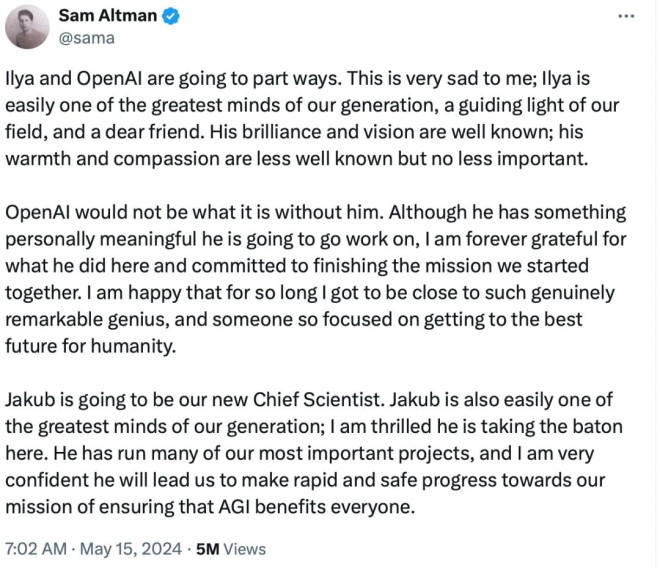 奥特曼的激进策略,现在不受控制了? 没有想到,OpenAI 在本周发布 GPT-4o,技术再次大幅度领先之后,随之迎来的却是一系列坏消息。 本周,OpenAI 联合创始人、首席科学家 Ilya Sutskever 官宣离职,与 Ilya 同步宣布离开的,还有超级对齐团队的共同领导者 Jan Leike。 Ilya 与 Jan 是 OpenAI 超级对齐团队的领导者,该团队的任务是确保人工智能与其制造者的目标保持一致,而不是做出不可预测的行为并伤害人类。 另据《连线》等媒体报道,随着最近两位高管离职,OpenAI 的超级对齐团队已被解散。 本周五,Jan Leike 在 X 发布了一系列帖子,怒斥 OpenAI 及其领导层忽视“安全”而偏爱“光鲜亮丽的产品”。 ![]() 山姆・奥特曼、 Ilya Sutskever 和 Jan Leike 发生了什么事? 实际上,自去年 11 月那场“董事会风波”以来,社交媒体上一直流传着一个梗 ——Ilya 看到了什么。人们猜测:“OpenAI 秘密地取得了巨大的技术突破,而 Ilya 之所以离开,是因为他看到了一些可怕的事情,比如可能毁灭人类的人工智能系统。” 当然,这只是一种粗暴的猜测。OpenAI 频繁失去安全团队成员可能与奥特曼的领导有很大关系。据消息人士透露,注重 AI 系统安全的员工已经对奥特曼的领导失去了信心。 据外媒 Vox 报道,一位不愿透露姓名的公司内部人士表示:“这是一个信任一点一点崩溃的过程,就像多米诺骨牌一张一张倒下一样。” 很少有员工愿意公开谈论此事。部分原因是 OpenAI 让员工在离职时签署带有非贬低条款的离职协议。如果你拒绝签署,你就放弃了你在该公司的股权,这意味着你可能会损失数百万美元。 然而,总有例外。OpenAI 前员工 Daniel Kokotajlo 拒绝签署离职协议,以便他可以自由地批评该公司。Daniel Kokotajlo 于 2022 年加入 OpenAI,主要负责安全部署人工智能系统,并曾在治理团队工作,直到上个月辞职。 据 Vox 报道,Daniel Kokotajlo 称:“OpenAI 正在训练更加强大的人工智能系统,最终目标是全面超越人类智能。这可能是人类有史以来最好的事情,但也可能是最糟糕的事情。” OpenAI 一直将构建通用人工智能 (AGI) 系统作为目标。“我加入时满怀期待地希望 OpenAI 在越来越接近 AGI 时表现得更加负责任,但我们中的许多人慢慢意识到 OpenAI 没有这样做,我逐渐对 OpenAI 领导层以及他们负责任地处理 AGI 的能力失去了信任,所以我辞职了,”Daniel Kokotajlo 说道。 周五,Leike 在 X 的一条帖子中解释了他辞去超级对齐团队联合领导职务的原因,并描绘了一幅非常相似的画面。他写道:“相当长一段时间以来,我一直与 OpenAI 领导层关于公司核心优先事项的观点存在分歧,直到我们最终达到了临界点。” ![]() 虽然 OpenAI 的技术仍在不断发展,但 Ilya Sutskever 等重量级科学家的流失让人不得不担心它的前途。 为什么奥特曼“不值得信任” 此次紧随 GPT-4o 发布的新一轮动荡,其源头还要追溯到去年的“宫斗”。 在去年 11 月那场董事会风波中,Ilya Sutskever 曾与 OpenAI 原董事会合作试图解雇奥特曼。OpenAI 在公告中称奥特曼对董事会不够坦诚。 当时有人将其解读为:OpenAI 可能已经在内部实现了 AGI,但并没有将消息及时同步给更多人员,为了防止该技术未经安全评估就被大规模应用,Ilya 等人按下了紧急停止键。 不过仅仅一个周末的时间,奥特曼就重返 OpenAI 董事会,并且之前罢免他的董事被纷纷解雇,董事会宣布重组,新任董事会主席 Bret Taylor 表示:“我们一致认为 Sam 和 Greg 是 OpenAI 的合适领导者。” 一场风波之后,奥特曼似乎可以更自由地管理 OpenAI 了,而 Ilya Sutskever 陷入了尴尬。 与之相对的是几个月来,Ilya Sutskever 的动态甚少。据知情人士透露:“Sutskever 已经大约有六个月没有在 OpenAI 的办公室出现了,他一直远程领导超级对齐团队”,直到本周 Ilya 正式宣布离职。 ![]() IIya 在 X 上发帖告别 OpenAI,发帖时间为 7:00AM 两分钟后,奥特曼就发帖称:“这对我来说非常难过;Ilya 是我亲密的朋友......” ![]() Altman 紧随 IIya 发帖,发帖时间为 7:02AM 准时官宣离职,迅速回应,这微妙的时间安排似乎说明了一切...... 值得注意的是,Ilya 宣布离职时,他表示自己将去追求“一个对我个人而言非常有意义的项目”。也就是说,注重 AI 安全的 Ilya 选择离开 OpenAI 来完成自己的项目。 反观奥特曼,一些 OpenAI 员工认为奥特曼虽然声称要优先考虑 AI 安全,但有些行为却自相矛盾。例如,奥特曼似乎急于积累尽可能多的芯片,加速技术的发展,而忽视安全方面的进展。 此外,Ilya Sutskever 的盟友、超级对齐团队成员 Leopold Aschenbrenner 上个月刚刚被 OpenAI 解雇。外媒报道称他和同团队另一位研究员 Pavel Izmailov 因被指控泄露信息而被解雇。但 OpenAI 却没有提供任何泄露信息的证据。 Aschenbrenner 和 Izmailov 被迫离职的同一个月,另一位安全研究员 Cullen O'Keefe 也离开了 OpenAI。 两周前,安全研究员 William Saunders 在 EA 论坛上发表了一篇神秘的帖子。Saunders 总结了自己在 OpenAI 作为超级对齐团队一部分的工作。然后他写道:“我于 2024 年 2 月 15 日从 OpenAI 辞职。” 一位评论者提出了显而易见的问题:为什么 Saunders 要发布这个? “无可奉告”,Saunders 回答道。 这让人回想起,去年奥特曼复职后不久,Ilya 发布了这样一条推特,但随后很快被删除: ![]() IIya 在 X 上发帖:“过去的一个月里,我学到了很多教训,其中一个教训是:‘鞭打,直到士气提升’这句话的使用频率远超其应有的程度