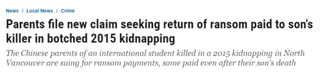 2015年,一名中国留学生在北温哥华被绑架并遇害,其父母如今再次起诉罪犯,希望追回他们支付的赎金,超过30万加元。而且这一次,他们将罪犯的妻子也列入诉讼对象,理由是她住在一套昂贵的河滨公寓,据称部分款项来自那次的勒索所得。 ![]() 图源:被害留学生Peng Sun(Vancouver Sun) 据此前的报道称,2015年9月29日上午,警方在事发现场发现一辆白色宾利车内有一具男子尸体,后被证明被杀男子为中国留学生Peng Sun,他被绑架勒索20万加币,后来企图逃跑结果被杀害。四名涉案男子在案发后已经被捕,其中一名嫌犯为华人。 据Vancouver Sun的报道,被害留学生的父母Cang Sun和Hua Li,现已退休并仍居住在中国。上个月他们向BC省最高法院提起了民事诉讼,主要是针对此前被控一级谋杀、绑架、勒索和干扰尸体罪名、后来承认过失杀人的Tian Yi(Eddie)Zhang。在BC省监狱服刑后,Zhang已于2023年获得假释。 法庭文件显示,被害人Peng Sun在被Zhang和一名共同被告控制绑架期间,因脖子上被塑料扎带而遭意外勒死。 诉讼文件称,2015年9月绑架事件发生后,Zhang联系被害人父母,要求他们支付赎金以换取儿子的生命。 诉讼指称,一系列款项以共计356,592加元被转账给Zhang,其中49,820加元在其被捕后被警方追回。据称,部分勒索款项是在他们儿子死后被要求支付的。如今被害人父母希望追回剩余的306,772加元,加上利息和成本,这是2020年法院判决裁定他们应获得的金额。他们表示,自那次判决以来,Zhang未支付任何款项。 ![]() 图源:被害留学生的家人(Vancouver Sun) 新的诉讼通知还将Zhang的妻子Ya Ran Li列为被告,理由是她于2017年购买了一套价值数百万假元的公寓,诉讼称部分款项来自Zhang所得到的赎金。原告要求根据位于Richmond市5131 Brighouse Way公寓的价值,追讨306,772加元及利息。 这份新的指控还表示,Zhang因毒品指控于2023年被捕,在对其住所进行搜查时发现了53,650加元。在该案件中,Zhang及其太太均未被刑事起诉,但BC省的一项民事没收程序试图没收他们320万加元的财产及突击搜查中发现的款项。 根据最新的索赔声明,“Zhang在监狱度过了数年时间,除了接触赎金资金,没有合法手段能够购买财产或积累53,650加元的可能。” 在警方突袭之后,法院命令Zhang居住在一处戒毒康复住所。 ![]() 图源:Vancouver Sun 数年来,一直代表这对父母在BC省争取利益的律师Mark Thompson上个月表示,在得知被没收的资金、以及搜查出的可用于制造冰毒和芬太尼的物质后,他将重新提出民事索赔。 “我和我的办公室会定期与这对父母保持联系,”Thompson周二表示。“他们首先对于Zhang被允许认罪过失杀人感到失望,特别是考虑到他早前已有类似情况下勒索他人的历史,以及在杀害我客户的儿子之后仍企图勒索钱财。” 他说,新的索赔“扩大了警方和民事没收对于这一切所了解的内容。” “我们相信这笔赎金被用于购买Richmond市非常昂贵的河滨公寓。” Thompson还表示,他对Zhang能获得假释感到惊讶,因为他在监狱期间仍存在违规行为和不良表现。 Zhang起初因涉及致命绑架的认罪于2017年2月被判14年不得假释。鉴于扣除先前的拘留时间,他原本要在牢狱里渡过近12年。由于会被驱逐出境的命令,他无法在加拿大工作。 |