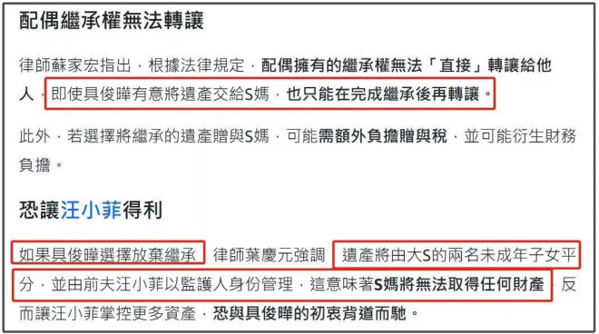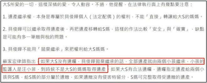 大S去世后,网友最关心的除了她的死因之外,就是孩子将来怎么办,遗产怎么分配的问题。具俊晔和S家都先发制人了,汪小菲还没有表态。 ![]() 有关孩子的抚养权方面,S家似乎已经松口了,据台媒报道称,S家当然会对孩子抚养权据理力争,但万一结果不尽人意,汪小菲带孩子去北京的话,希望汪小菲和张兰、马筱梅能善待孩子。 ![]() 提到希望汪小菲能多陪伴孩子,在生活或者学习上多多关心,让孩子适应新环境。由此可以看出,大S家属也不一定想要抚养权,毕竟照顾孩子不容易,所以松口留了余地,而且他们也大概率争取不到。 ![]() 但是,大S过世不到7天就着急分遗产抢抚养权,有没有人处理大S的事情啊? 大S生前和汪小菲的官司不断,她去世后家人都不想着替她继续打官司要钱吗?汪小菲还欠着大S钱呢?光想着遗产分配给自己争取利益,没想过大S生前的诉求? ![]() 有网友整理了大S和汪小菲相关利益纠葛,首先就是汪小菲曾经写过欠条,向大S借钱,但没还。 ![]() 其次就是汪小菲离婚后欠大S的赡养费没给,法院都判他给钱,他又申请二审。车子都差点被拍卖,后来汪小菲交了保证金解决,但没给大S钱。 ![]() 再有就是豪宅的问题了,大S去世后有关豪宅归属问题惹出争议,大S说豪宅当年是汪小菲买的,只是因为户口问题才登记她的名字,因此外界认为豪宅应该“还给”汪小菲,但是当初两人离婚,豪宅已经是写在离婚协议里分给大S了,这就是大S的财产,要给也是给孩子,或者具俊晔继承。 ![]() ![]() 不过此前具俊晔发文称自己不要遗产,要都转给S妈,但立马被律师打脸称这种根本不现实。因为他作为现任配偶如果放弃继承权,那么按顺序全部遗产就会都给两个孩子。 ![]() ![]() ![]() 大S去世后,汪小菲这个亲生父亲自然成为监护人,那就可以代管两个未成年孩子的财产,这在法律上基本没什么异议,所以如果具俊晔放弃遗产继承,那S妈可能拿不到任何大S的财产,除非具俊晔继承之后转赠给S妈才可以。 ![]() 此前具俊晔还发文说要找律师,在律师监督下,妥善把孩子的权利维护好。不说别的,在大S的遗产继承中,具俊晔才是那个对孩子们有威胁的人吧?之前律师分析如果大S没和具俊晔签婚前协议,那具俊晔可以先申请财产保全,分走婚内夫妻共同财产,剩下的遗产孩子们还得和他平分。 ![]() ![]() 此前具俊晔曾发文说不想让“恶人”染指孩子们的权益,会采取法律措施在孩子们成年前妥善保护他们的权利。但根据律师分析,孩子的财产只有监护人能说得算,就算要搞遗产信托,也得汪小菲出面签协议。如果具俊晔想要参与其中,那就是明牌了,他这个后爸要和亲爸争抚养权? ![]() ![]() ![]() ![]() 不管怎么说,大S的头七还没过,S一家就已经开始商量遗产一事让网友心寒。大S骨灰都不能下葬,家人就开始为了遗产发文吵架,这就是情深似海,真爱无疑了吗? ![]() ![]() 就想说希望这一家子人,能多分点儿精力照顾大S的孩子们,处理和大S有关的问题吧,遗产继承如果大S没立遗嘱那自有法律来分配,别急着打架了! |