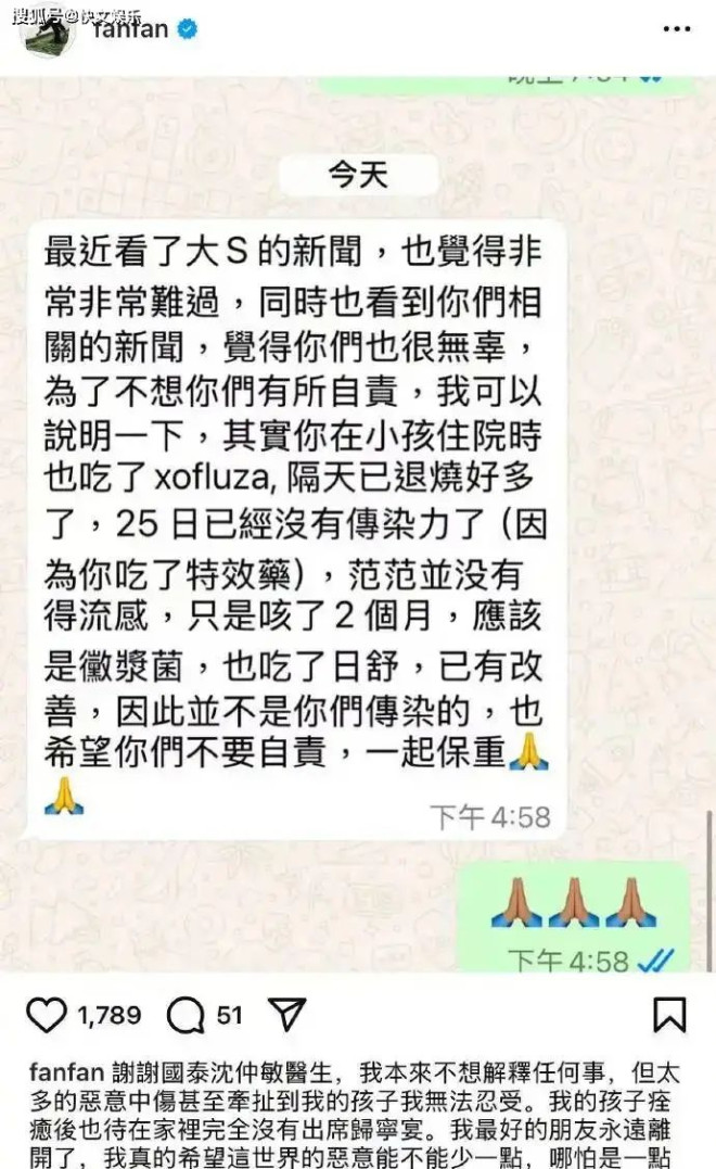 2月21日,大S因流感并发肺炎在日本逝世的消息震惊了整个娱乐圈,而她的好友范玮琪也因此卷入了一场舆论风波。有网友指责范玮琪将流感传染给了大S,导致了大S的不幸离世。面对铺天盖地的质疑和谩骂,范玮琪终于忍无可忍,在2月21日晒出了与医生的聊天记录,力证自己的清白。 ![]() 聊天记录曝光,范玮琪自证清白 在范玮琪晒出的聊天记录中,医生明确表示范玮琪和孩子之前确实得了流感,但都已经吃了特效药,并在25日时已经没有了传染力。更重要的是,医生指出范玮琪本人并没有得流感,只是咳嗽了两个月,属于霉浆菌感染。医生还安慰范玮琪:“不是你们传染的,也希望你们不要自责,一起保重!” 这段聊天记录的曝光,无疑为范玮琪洗清了冤屈。她本人也表示,自己本来不想解释任何事,但太多的恶意中伤甚至牵扯到了孩子,让她忍无可忍。她呼吁这个世界的恶意能少一点,哪怕是一点都好。 ![]() 范玮琪与大S的深厚友情 范玮琪和大S的友情可以追溯到多年前,两人因陈建州而结缘,从此成为了无话不谈的好友。在娱乐圈的漫长岁月里,她们一起经历了许多风风雨雨,相互陪伴、相互支持。然而,这段深厚的友情也曾经历过波折。 大S曾在《康熙来了》中爆料自己曾喜欢过陈建州,并送过他一条裤子。这一爆料无疑让身为陈建州妻子的范玮琪心里有些不是滋味。但随着时间的推移,双方都逐渐放下了心中的芥蒂,努力修复这段珍贵的友谊。 ![]() 流感风波再起,范玮琪成众矢之的 然而,大S的离世却将这段友情再次推向了风口浪尖。由于大S在去世前曾参加过范玮琪和陈建州出席的归宁宴,且当时范玮琪一家正感染流感,因此有网友怀疑大S是在这次聚会上被传染了流感。 这一猜测迅速在网络上发酵,范玮琪因此成为了众矢之的。她的社交媒体评论区被网友攻陷,各种指责和谩骂声此起彼伏。面对这样的困境,范玮琪选择了沉默和忍受,直到2月21日才终于发声回应。 ![]() 网友反应不一,争议持续发酵 对于范玮琪晒出的聊天记录,网友们的反应不一。有人表示相信范玮琪的清白,认为她没有必要在这件事上撒谎。也有人对聊天记录的真实性表示怀疑,认为这有可能是范玮琪为了洗白自己而伪造的证据。 更有甚者,将矛头指向了医生,认为医生的话也不可靠。他们拿出王大陆买通医生的例子来作比较,认为医生的话也不能完全相信。此外,还有网友对聊天记录中的细节提出质疑,认为范玮琪晒出的截图并不完整,有可能是断章取义。 不过,对此,也有人已经哑口无言。 ![]() 范玮琪的无奈与悲痛 在这场舆论风波中,范玮琪无疑成为了最无奈和悲痛的人。她不仅失去了自己最好的朋友大S,还要承受来自网友的指责和谩骂。她曾在演唱会上因得知大S去世的消息而失常痛哭,如今又要面对这场无休止的争议。 然而,尽管面临如此困境,范玮琪依然选择了坚强面对。她用自己的方式力证清白,同时也呼吁大家能够多一点善意和理解。她的这份坚持和勇气无疑让人敬佩。 ![]() 对此,你怎么看? 在这场流感风波中,我们看到了人性的复杂和多变。有人选择相信范玮琪的清白,有人则对她的证据表示怀疑。然而,无论真相如何,我们都应该保持理性和客观的态度去看待这件事。 同时,我们也应该意识到网络暴力的严重性。在社交媒体上随意发表言论、攻击他人是一种不负责任的行为。我们应该尊重每个人的权利和尊严,避免对他人造成不必要的伤害。 最后,愿大S在天堂安息,愿范玮琪能够早日走出阴霾,重新面对生活。同时,也希望大家能够多一些善意和理解,共同营造一个和谐、温暖的社会环境。 |