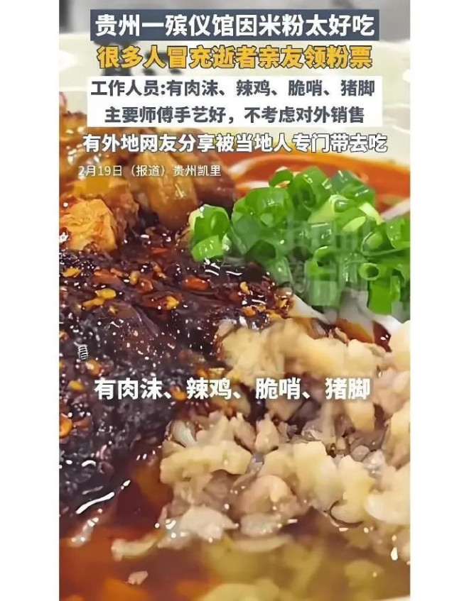 在黔东南,美食不仅藏在大街小巷,还可能躲在殡仪馆里。 位于凯里东郊的二龙殡仪馆,是无数凯里人生命旅途的最后一站,但同时它还以米粉名闻天下。 如果你去凯里旅游,当地人可能会盛情邀请你去殡仪馆吃一碗粉。 “去贵州朋友家,她妈非要带我去殡仪馆吃酸汤粉。” 这不是危言耸听的恐怖故事,而是凯里人对美味的极致追求——好东西不分阴间与人间。 每天清晨,二龙殡仪馆的食堂便人头攒动,这里面有来为往生者吊唁的亲朋好友,也有慕名而来的八方食客。 悲伤的情绪和垂涎欲滴的表情共存在一个空间里,食堂的后厨炉灶轰轰作响,火力不输给几百米外的火化室,这就是二龙殡仪馆每天发生的景象。 “在那儿摆灵堂的话,就能定殡仪馆的餐,还挺好吃的。” ![]() ![]() “二龙殡仪馆提供追悼会、火葬、下葬一条龙,因为经常持续一整天,晚上还要守夜,所以不管是家属还是来悼念顺便帮忙的朋友,都是要吃饭的嘛,所以能开追悼会的地方通常会管饭。” “因为会守灵三天,要管亲属们三天的伙食。” ![]() ![]() 起初只是为丧属提供一个吃饭的场地,但二龙殡仪馆因为开设年代久且离凯里城区较近,所以很多当地出租车司机或者附近老百姓都会到这里吃,慢慢地有了名气。 “吃米粉,上二龙”,是周边居民过去二十年餐食的不二之选。 ![]() 有网友分析一家饭店东西好吃到这种程度,一定有绝密配方。 殡仪馆经理接受媒体采访时直言,“贵州凯里米粉十分出名,其原料主要是本地的手工米粉,肉都是当天采购,十分新鲜,且大骨汤也是当天现熬,主打一个新鲜、食材好。” ![]() 二龙殡仪馆的米粉特别好吃,但是不对外销售,所以有人为了吃上一口米粉用上了障眼法。 “朋友说本来是参加完追悼会随便吃吃,但因为太好吃了很多人冒充逝者亲朋好友跑来,根本不够吃,排的队比给逝者献花的队还长。” “以前有人办事可能就送个礼,现在会专门来殡仪馆一趟。” “有时候你就跟在丧属后面,说是一起的,食堂工作人员也不会刻意为难。” ![]() “我们目前只供应给来殡仪馆办事的客户,发放粉票,凭票购买。满足客户们的需求已经压力很大,所以不考虑对外销售。不过,确实也有人冒充逝者亲朋好友,有时人多分不清,不太好管。”殡仪馆工作人员直言管理难题。 米粉仅限早餐和宵夜供应,早上6时到8时左右,晚上10点半开售。 米粉有四种口味,肉末、辣子鸡、脆哨和猪脚口味,定价10元一碗,其中肉末粉销量最好,若想吃到至少要排队几十分钟,人多时也会遇到排一两个小时的情况。 ![]() 一些胆子够硬的老饕,甚至会特地蹲守夜宵档前来觅食。在美味的米粉面前,恐惧感已经被自然消解了,一碗热腾腾的米粉下肚,带来的满足感是不可言说的。 前提是不能表现得太过欣喜,不然会引起隔壁桌吊唁亲友的侧目。 ![]() 英雄不问出处,美食不分场地。 殡仪馆,本是生命落幕之地,却因米粉摊的热闹变得不一样。人间烟火气充斥在殡仪馆的每一个角落,很多人还是第一次听说殡仪馆有餐饮。 随着二龙殡仪馆的米粉名气越来越大,为了感谢市民的认可,该馆也紧急出台了方案,今后每日将向公众免费供应50碗粉。 ![]() 贵州的神秘气质与生俱来,当你踏足贵州的地界,美食总是以出其不意的方式登场。 已经有人总结出了独属于贵州的美食奇观:医院的月饼,殡仪馆的粉,KTV的小吃,麻将馆的菜,钢厂的馒头,澡堂的火锅,棋牌室的炒饭。 但当地人似乎早已不满足于用烹饪技法震慑外地人,他们对美食的理解是全方位的,反差氛围的营造才是拿捏你唾液腺的不二法门。 还有真正的高手在网上披露,米粉只能算贵州殡仪馆的入门之选,高阶食客都是直接在殡仪馆涮火锅。 ![]() 一位网友说:“贵州的殡仪馆可能比结婚还欢乐,遗体在里面放着,外面麻将打得震天响,还有芦笙表演,有时候甚至会邀请DJ播放嗨曲,现场打碟,一幅极乐世界的图景。” ![]() “之前跟朋友聊天也是说到这个,我们这大厅里一侧是棺一侧就是麻将厅,守夜就是搓麻一整晚。男女老少血亲会绕着逝者唱歌跳舞吹芦笙,舞种不限歌也不限,我爸当时就给我外公跳得很欢,隔壁厅带了音响话筒唱‘你伤害了我还一笑而过’。” “还有一个习俗是尽量开开心心地送走亲人,不要哭更不要哭在他的身体上,眼泪是很重的东西会让他飞不到月亮上。” ![]() 一位网友说他去过两次二龙殡仪馆,都是带着悲痛的心情,但至今回想起来,最让他感到慰藉的是那碗热腾腾的米粉。 “身边的人不在了,但粉还是那个味道。” |
