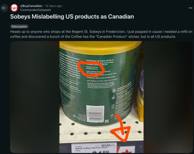 随着美国总统唐纳德·特朗普(Donald Trump)誓言将在4月2日对加拿大和墨西哥征收25%的关税,支持加拿大本土产品的呼声越来越高! ![]() 图源:BlogTO@ACHPF/Shutterstock.com 目前已有超过23,000人签署请愿书,敦促超市在食品上标注“加拿大制造”标签。 尽管一些大公司,比如Empire Company Limited——Sobeys、Safeway、IGA、FreshCo和Foodland的母公司,以及Metro Inc.——Food Basics和Super C等安省和魁北克省超市的母公司,承诺推广加拿大制造的商品,但部分加拿大消费者声称,一些超市存在产品标签误导的问题。 大批顾客发现:超市涉嫌误标商品!不少顾客在Reddit上分享了他们的发现,指出某些超市的货架标签显示商品为“加拿大制造”,但仔细检查后发现,实际产品产自美国。 “一定要擦亮眼睛!在位于弗雷德里克顿(Fredericton)Regent St.的Sobeys超市购物时,我发现很多咖啡都贴着‘加拿大产品’的标签,但其实全是美国产品。”一位网友在帖子中写道。 ![]() 图源:Reddit 此外,在多伦多的一家FreshCo超市,有顾客发现胡萝卜的标签存在误导。 “货架标注是加拿大产品,但小蓝色标签上写着‘美国制造’。”网友写道。 另一篇帖子显示,在温哥华的一家Real Canadian Superstore,挂牌明明显示苹果是加拿大产品,但苹果上的贴纸却标明产地为“美国”。 ![]() 图源:Reddit “这应该是违法的。”一位Reddit用户愤怒地评论道。 连锁超市的回应对于这一问题,Loblaws公司的一位发言人在邮件中表示,他们意识到某门店存在标签错误,并为由此造成的不便道歉。该发言人指出,标签错误是人为失误导致的。 “更换货架上方的标签是人工操作的,包括更新‘产地’信息。”这位发言人解释道,“我们正在与各个门店合作,加强员工培训,确保在产品更换时正确更新标签。” 目前,Empire Company(Sobeys和FreshCo的母公司)尚未对Reddit上的相关投诉作出回应。 你怎么看? |