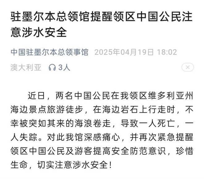 据中国驻墨尔本总领馆官方微信公众号4月19日消息,近日,两名中国公民在我领区维多利亚州海边景点旅游徒步,在海边岩石上行走时,不幸被突如其来的海浪卷走,导致一人死亡,一人失踪。对此我馆深感痛心,并再次紧急提醒领区中国公民及游客提高安全防范意识,珍惜生命,切实注意涉水安全! ![]() 中国驻墨尔本总领馆 一、切勿在风高浪急处游泳或在悬崖边驻足、徒步、照相、岩钓,以免被海浪卷走溺水。 二、涉水活动尽量多人同行,相互照顾,避免前往陌生或禁止海域,不要在天气及海况条件恶劣时下海,以免发生意外。 三、下海游泳应选择配备有救生员的海滩,同时应注意海边安全标识。乘船出海应配备救生衣、救生筏,掌握应急求救知识和技巧。 四、谨慎选择涉水项目。根据自身水性、身体状况、涉水项目风险程度等合理选择水上活动。参加浮潜、冲浪、钓鱼等高风险项目需接受安全技能培训、指导并在专业人士陪同下进行,严格按要求穿戴好救生衣,熟悉相关设备使用方法和应急措施。 五、未成年人参加涉水活动应有监护人全程看护、陪同。 ![]() 事发海边(图源:橙柿互动) 据橙柿互动此前报道,当地时间4月18日上午,澳大利亚维多利亚州南部著名的旅游胜地企鹅岛发生一起悲剧。三名中国公民在企鹅岛圣雷莫PunchBowl路附近的一个海滩被海浪冲下岩石,目前已经确定其中一人溺亡。 意外发生在上午8点30分左右,当时一共有7个人一起沿着岩石在散步,其中有三个人被卷入了大海,三个人中有一对夫妻。其中一名女子自己设法回到岸边,但是那对夫妻无法自行返回。搜救人员用警用直升机搜索的过程中,在海中发现了女子,并将她带回到岸边,但她已不幸死亡。被冲入海中的男子还未被发现,自行回到岸边的女子已经被送往医院。 警方透露,这群人已经被确认为中国公民,他们持有的是工作签证,年龄在三十和四十岁之间。 ![]() 搜救直升机(图源:橙柿互动) 目前,澳大利亚的紧急搜救部门使用了包括直升机、潜水员和喷气式滑水板在内的多种工具,但目前仍未找到失踪男子。据了解,这对夫妻有一个孩子。 事发海滩已经不是第一次发生类似的悲剧。2021年12月,一名女子在同一海滩从岩石上被海浪冲走,不幸溺亡。2023-2024年夏天,当地海滩发生了6起溺水事件。冲浪救生海滩安全网站将该海滩描述为“中度危险”,称该海滩有陡峭的悬崖、礁石和岩石,还有永久性的裂口。 |