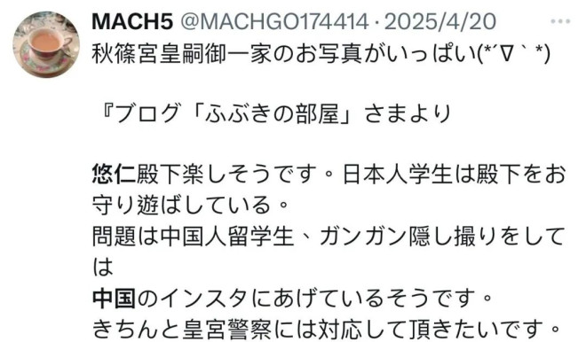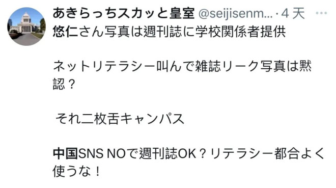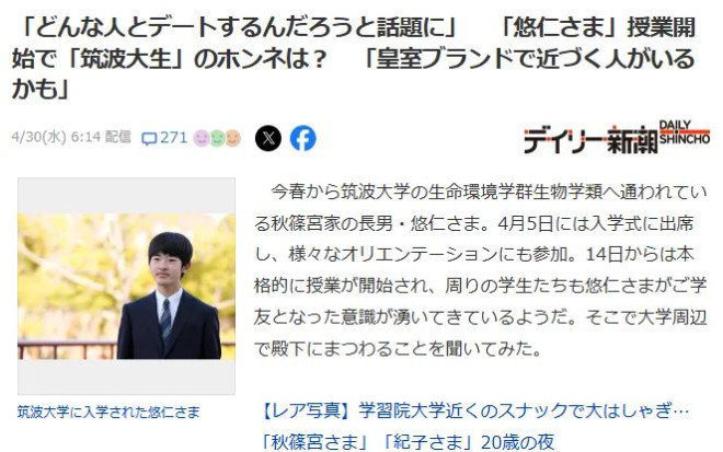 最近,日本人又因中国人而“不安倍增”。 据日媒报道,日本未来天皇悠仁频遭筑波大学的中国留学生偷拍,其校园生活被过度曝光。 日媒担忧,若继续放任此行为,心怀鬼胎的人将趁虚而入,动摇日本皇室根基! 长期以来,日本皇室的私生活都处于一种极为隐秘的状态,普通日本民众鲜有机会能了解他们的私生活。 不过近年来随着社交平台的发展,年轻一代的日本皇室成员的私生活,逐渐被大众看见。 自从悠仁皇子于4月正式入学筑波大学以来,社交平台就疯传他各种校内路透照片。大多数都是网友自发拍摄的,这些网友很有可能是筑波大学的学生或者教职工。 其中路透照片最多的,当属国内某个社交平台。 ![]() 悠仁似乎成了中国网友们的“云养乐子人”,只要打开这个社交平台,就可以看到他的实时动态:参加入学典礼、在校园里散步、在学校食堂吃饭。 看!悠仁皇子正推着自行车与三五知己有说有笑!他露出了地主家傻儿子的谜之微笑。谁说他没有朋友的,这不就有一排么? ![]() 瞧!那位在球场上挥舞球拍、尽情挥洒青春汗水的运动少年!他就是刚刚加入羽毛球社团的悠仁皇子!谁说他人机味浓?这不一个阳光大男孩吗? ![]() 日媒特意分析其中一则有关悠仁的偷拍帖子,这个帖子在不到一天的时间内,就收获了7000多个赞、400多条评论! 日媒受宠若惊:“马萨卡!我们的悠仁皇子在中国实在太受欢迎了吧!中国人也太喜欢悠仁了吧!中国人对他的人品以及私生活相当感兴趣!” 于是这帮日媒开始脑洞大开,自作聪明认为这是因为中国没有,所以中国人对日本皇室非常上心! 更何况悠仁皇子,他可不一般呐!作为日本皇室时隔41年才诞生的太子,他不仅是日本皇室独苗、头号耀祖,更是“日本第一神童”、“日本昆虫天才”、“蜻蜓才子”! 如今,他甚至做出“前无古人后无来者”的壮举,入读筑波大学!成为首位选择学习院之外的大学的皇位继承人。 ![]() 一方面日媒一本正经在胡说八道,另一方面日本网友坐不住了,见自家悠仁皇子频遭中国留学生偷拍,已经怒了! “大胆中国留学生!太放肆了!竟敢偷拍我们的悠仁皇子还发到网上去!我喊带刀侍卫来缉拿你们!” ![]() 还有日本网友阴阳怪气表示:“中国人吃不到葡萄说葡萄酸,羡慕我们有天皇,因此想要摧毁我们的皇室…” ![]() 就连筑波大学的校长都出面制止此类偷拍行为。 ![]() 筑波大学永田校长特意警告:“所有在校内偷拍悠仁的照片,未经许可禁止发布到中国社交平台上,希望同学们要提高个人网络素养!” ![]() 部分日本人深入研究,竟不安倍增。他们认为部分筑波大学的外国留学生是Spy!要动摇日本皇室的根基!扰乱日本的社会安宁! 他们表示,筑波大学有超过2000多名国际留学生,包括本科生和研究生。 即便他们当中大多数人都是遵纪守法、爱学习的好孩子,但不排除部分叛逆留学生,他们三观与日本人完全不同,会肆意偷拍悠仁陛下的照片背地里做些不法事情。 虽然通过这些偷拍照片,我们普通民众得以窥见悠仁皇子的快乐校园生活,但长久下去的话,恐怕是百害而无一益,甚至会动摇日本皇室的根基。 日媒认为,他们并非杞人忧天。因为皇室成员的一举一动并非仅代表他们个人,而是关乎整个皇室、乃至整个日本的国家形象。 ![]() 2011年10月,悠仁的大姐姐真子公主正在读大学。 当时她所属的滑雪部正进行集训,她的一张偷拍照片在网上引起巨大非议。 照片中,真子公主身边有半空的啤酒罐以及空的啤酒罐,而她当时还是未成年(当时日本成年年龄为20岁)。 即便真子当时并未喝酒,但是她参加这种趴体,因此被日本民众所诟病,认为她有损皇室颜面。 纪子妃严厉训斥真子:“身为皇族公主,你务必时刻规行矩步,绝对不能做任何会让人误会或者怀疑的行为!” ![]() 因此,如今宝贝好大儿悠仁频遭中国留学生偷拍,纪子妃更是不安倍增,她下达指示:立即采取相关行动,以防类似行为发生。 真服了这帮日本人的清奇脑回路。 没想到有一天,咱们吃瓜群众在网上快乐冲浪,也会动摇到海那边日本皇室根基… 其实有没有一种可能,中国网友大多纯粹抱着“吃瓜不嫌事大”的心理关注悠仁? 比方说,你一个有钱邻居为夺家产追三胎才生了个傻儿子,自此以后你邻居逢人就夸,自家好大儿是“百年难得一遇的天才神童”。某天你邻居在小区拉横幅庆祝好大儿考上了985,你多少都会抱着好奇心想要八卦这个好大儿的大学生活吧? ![]() 在网络时代,黑红也是红,悠仁更是中国网友的流量密码,凡是蛐蛐他的帖子,都能在短时间斩获不少流量。 换个角度来看,日本人这种精神状态蛮值得经常内耗的人学习。凡事必将有利于我。不管你们是嘲讽、阴阳怪气,还是当他是傻子看乐子。只要你关注到我们的悠仁,就代表你们是喜欢他!如果不喜欢他,为什么要关注他? 庆幸的是,日本人其实也是有不少正常人的。 “部分悠仁的照片是由筑波大学的教职工提供给周刊的,媒体多年来偷拍日本皇室,你们不吱声,现在外国留学生偷拍就吵吵闹闹的,高喊要他们提高网络素养,真是大型双标现场。” ![]() 毋庸置疑的是,悠仁现在是筑波大学“最亮的仔”。 更有日媒报道称,在校生讨论的最多的就是悠仁会和什么类型的女孩谈恋爱。有在校生透露,肯定会有一些女生会主动接近悠仁,包括一些学姐们,因为与皇族谈恋爱以后能拿出来炫耀。 ![]() 有在筑波大学读一年级的