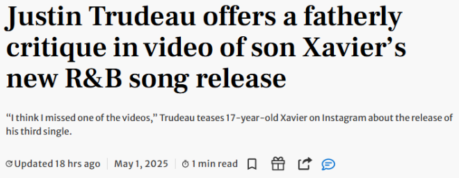 贾斯廷·特鲁多(Justin Trudeau)可能找到了一份“内容创作者”的新工作。 这位前加拿大总理周三出现在他儿子Xavier的Instagram视频中,为其新R&B单曲《Back Me Up》做宣传。 这是Xavier(艺名Xav)发布的第三支音乐MV,歌曲将在本周五正式上线。 ![]() ![]() 图源:Xav Trudeau/Instagram 视频中,17岁的Xavier与父亲一起观看了他的新歌《Back Me Up》的MV,父子俩跟着节奏点头、笑作一团,互动轻松又温馨。 期间,Xavier对父亲说:“目前我有3支MV了。” 杜鲁多笑着说:“我好像错过了你其中一支视频。” Xavier则一脸惊讶:“怎么会?你一定得补看啊!” 随后杜鲁多表示自己没有社交媒体账号,接着Xavier继续追问:“那你的Instagram是谁在管?你自己不管的?” 杜鲁多一时语塞,视频也随之结束。 ![]() 图源:Instagram 在Xavier的新歌MV中,他与两位舞者在一间贴满报纸的房间里跳舞,期间穿插一辆行驶中的汽车镜头,质感复古。这首歌由两位年轻制作人操刀:一位是来自渥太华、年仅16岁的DUAVA,另一位是当地录音室主理人Joey “Tekika” Boyer。 今年2月,Xavier凭借首支单曲《Til the Nights Done》正式出道,3月又发行了第二支单曲《Everything I Know》,逐步在R&B乐坛崭露头角。 杜鲁多自今年3月卸任后基本已经淡出公众视野,此前他曾因在Canadian Tire购物时自拍并发文“Canadian Tire的周一早晨,真不错!”而短暂登上头条。此次现身儿子的宣传视频,也成为他卸任后为数不多的一次“公开露面”。 |