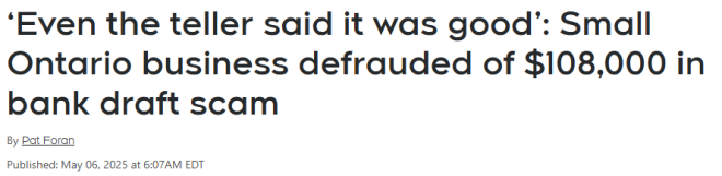 一份关于欺诈趋势的报告发出警告:当面交易骗局正呈现上升态势,犯罪分子能够现场提供伪造文件。安省的一位企业主就亲身经历了这种骗术。 ![]() 图源:CTV 安省Lancaster一家挖掘公司的老板Patrick Binette告诉CTV:“那张银行本票(bank draft)看起来和真的一模一样,连银行柜员都确认没问题。” Binette当时正试图出售一台滑移装载机,这对他来说本是轻车熟路的交易。他将设备挂牌出售后,很快有人联系表示要购买。 “他们大概在现场待了20分钟,问了几个问题,试了试机器,然后就装上运输卡车走了。”Binette回忆道。双方商定的成交价为108,367加元,事前约定以银行本票支付。 “对方出示本票时还附了收据,”Binette说。虽然他觉得这张加拿大丰业银行(Scotiabank)的本票看起来毫无破绽,但他还是亲自去了一趟银行合适真伪。 “柜员确认这是张正规的支票,还说‘你不用担心,它会到账的。’”Binette说。 这张银行本票当天的确“到账”了,但两天后却被认定为伪造,银行从Binette的账户中强制扣回了108,367加元。 ![]() ![]() 图源:CTV “我惊呆了。那可是我们的全部资金,现在账户都透支了。大家都说,要等钱到账后再交货,可这张支票明明已经到账了。” CTV就此事联系了加拿大丰业银行,但发言人表示“对此事不予置评。” CTV还联系了Binette开户的Desjardins银行,发言人回应称:“当本票被发现是伪造时,它被退回,资金也从账户中撤出。这是一种令人遗憾的情形,该客户是诈骗的受害者。” 在今年三月的“防诈骗月”期间,产权保险公司FCT发布的《2025年诈骗洞察报告》显示,当面交易欺诈案件正在激增,犯罪分子已能伪造各类文件实施线下诈骗。 “现在出现了一种新型诈骗手法,犯罪分子会冒充他人身份进行交易。”FCT总裁 Daniela DeTommaso说。报告发现,新技术助长了犯罪升级,伪造驾照、银行票据等文件已非难事。 ![]() 图源:CTV “这类肉眼难以识别的伪造文件,正在当面交易中被频繁使用。”DeTommaso补充道。 尽管两家银行均未提供帮助,但Binette的保险公司最终认定这属于盗窃理赔范畴,全额赔付了108,367加元损失。 “这笔赔款让我们能继续经营,把噩梦翻篇。今后我们一定会加倍小心。”Binette说。“虽然我这些天寝食难安,但能追回损失已是不幸中的万幸。” ![]() |