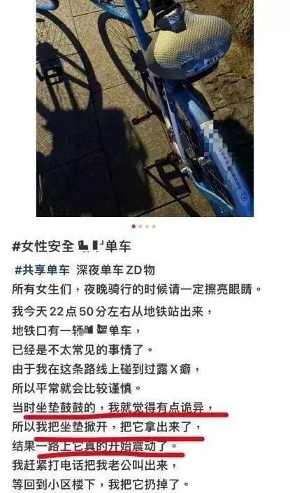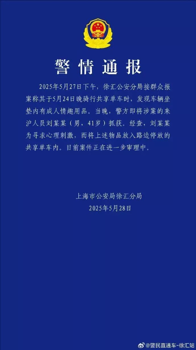 5月25日 有网友称自己发现 哈啰共享单车坐垫内有成人用品 引发网友关注 ![]() 5月28日 上海市公安局徐汇分局发布通报 5月27日下午,徐汇公安分局接群众报案称其于5月24日晚骑行共享单车时,发现车辆坐垫内有成人情趣用品。当晚,警方即将涉案的来沪人员刘某某(男,41岁)抓获。经查,刘某某为寻求心理刺激,而将上述物品放入路边停放的共享单车内。目前案件正在进一步审理中。 ![]() 对此,有网友吐槽 “之前以为是自导自演” ![]() 还有网友表示 “太恶心了!” ![]() 此前报道 近日,有网友描述 自己夜归准备骑行哈罗共享单车时 发现车坐垫异常鼓 疑似有异物 随后打开发现是成人用品 其将该物品取出后骑车回家 途中该物品开始震动 ![]() 记者发现 该网友社交账号内 发布的内容已删除 记者多次尝试联系该网友 截至发稿前未获得其回复 根据该网友 此前发布的成人用品照片 记者在网络购物平台发现多款类似商品 该商品可远程遥控 记者随后咨询多位客服 关于商品的遥控距离 获得的回复为5米至10米不等 |